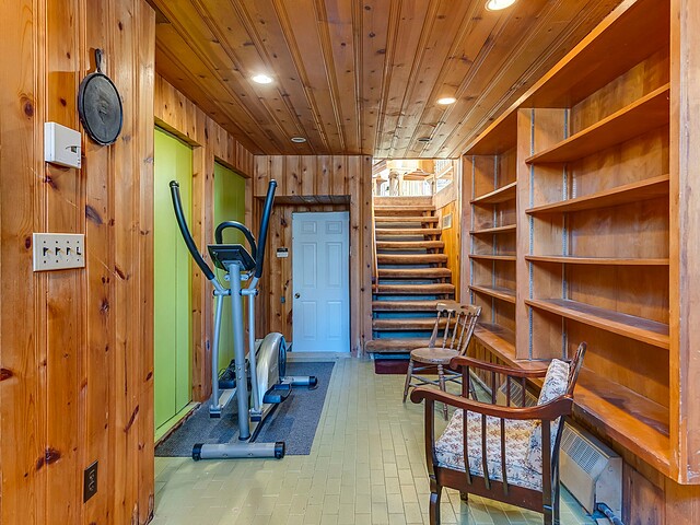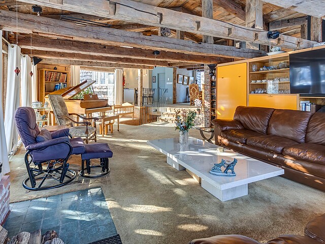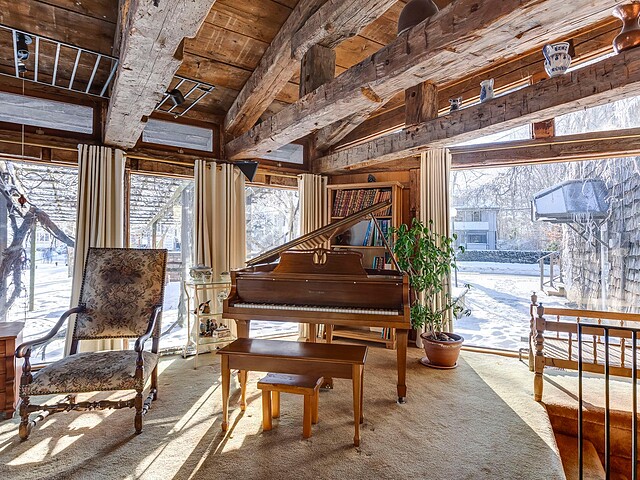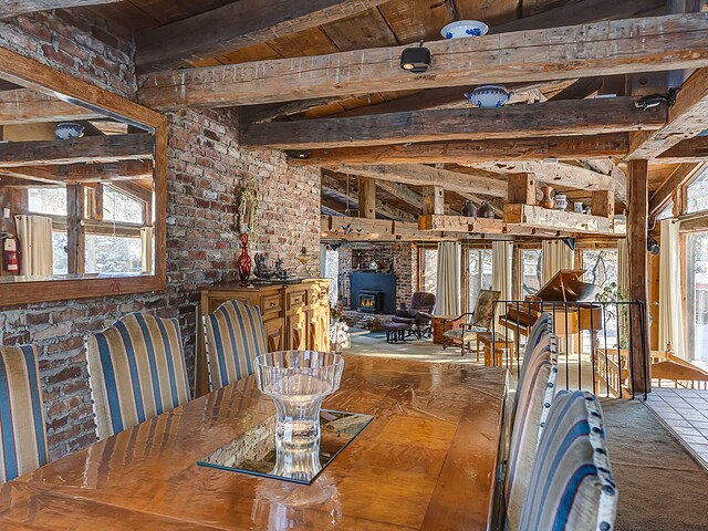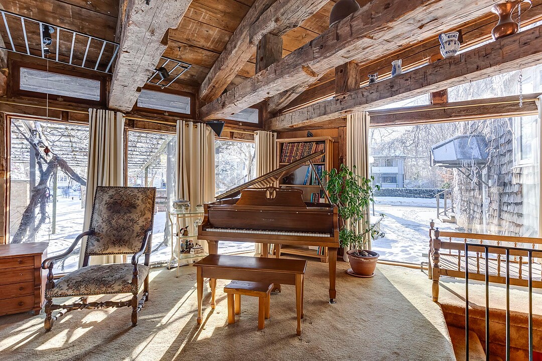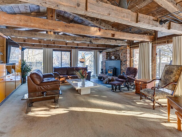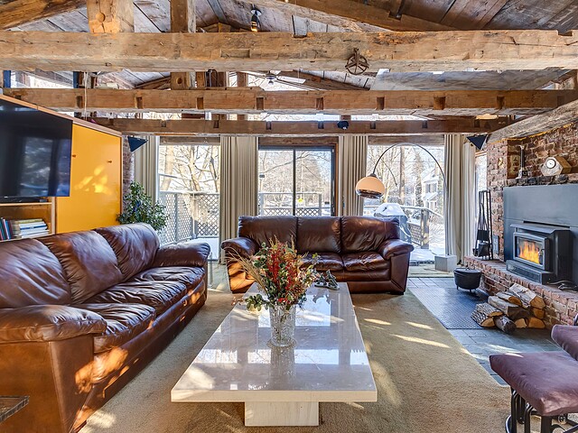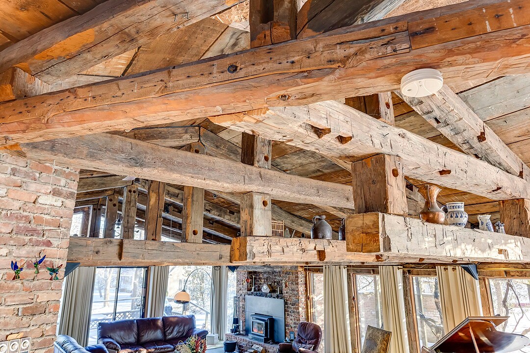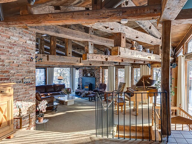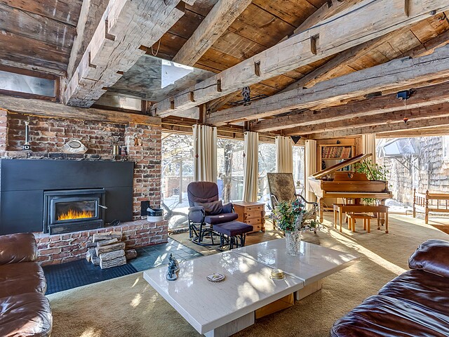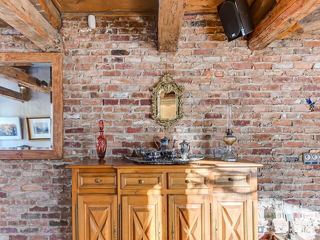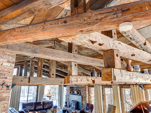 Dès l'entrée, le rez-de-chaussée séduit par ses volumes généreux et sa luminosité abondante. Les poutres apparentes et le superbe foyer au bois confèrent à l'espace une atmosphère chaleureuse et accueillante.