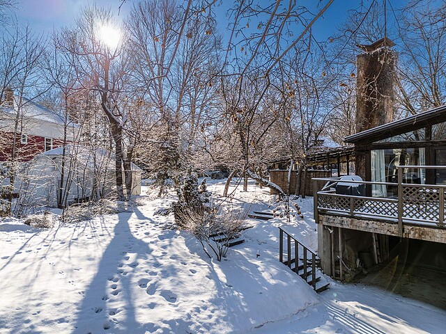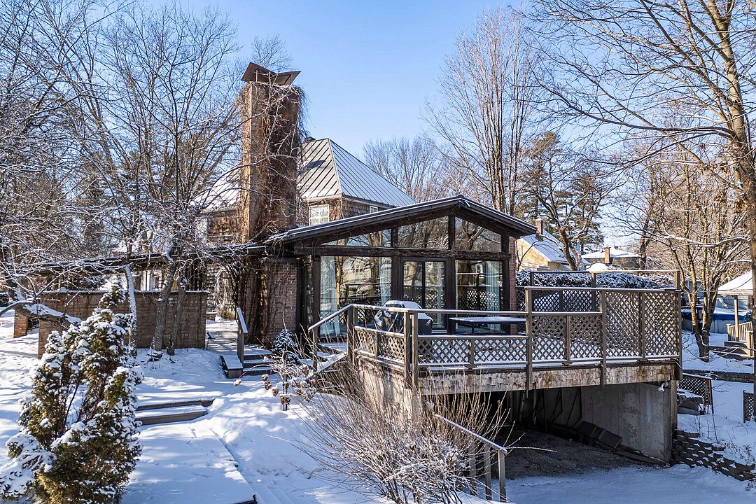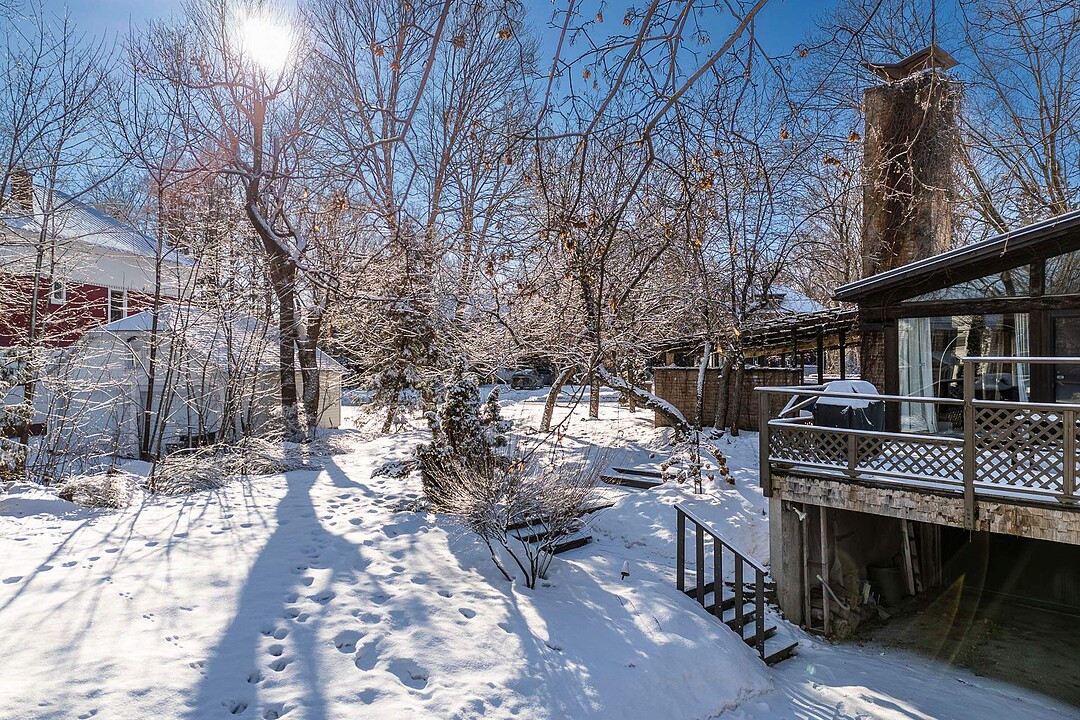 À l'extérieur, le terrain de près de 17 000 pi², soigneusement aménagé, offre sentiers de pierre, arbres matures, pergola agrémentée de vignes, fontaine de jardin et terrasse.