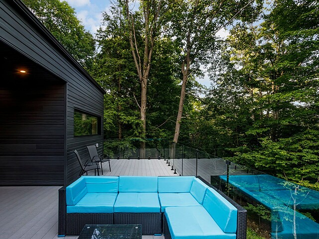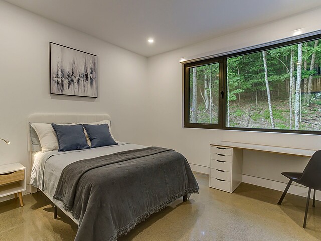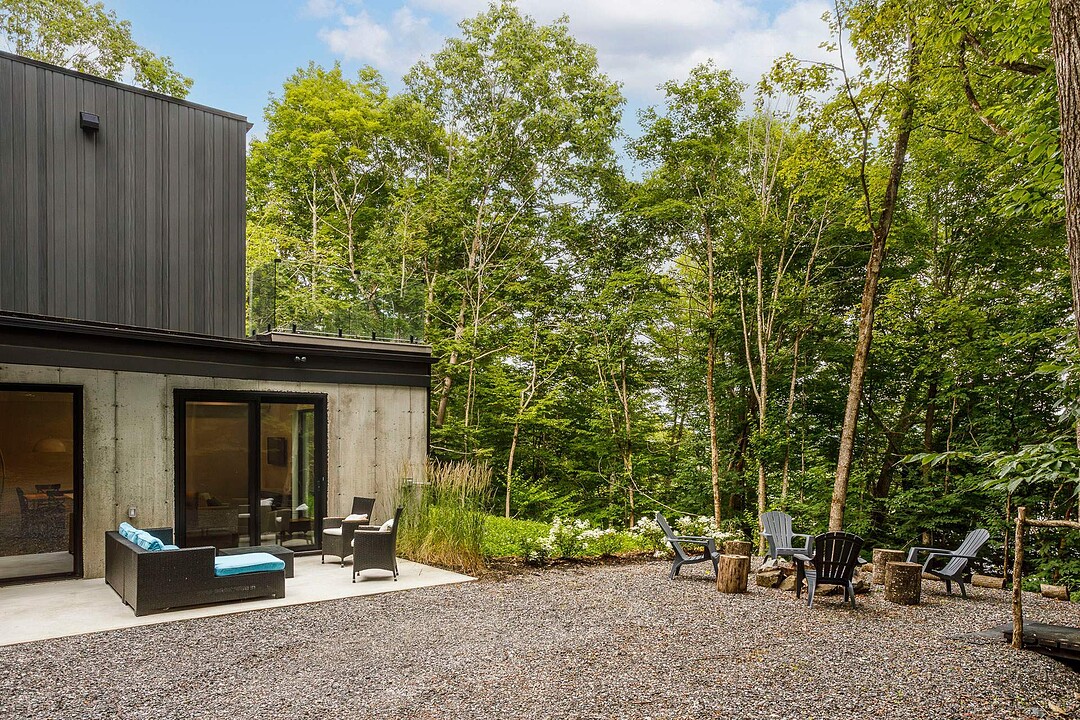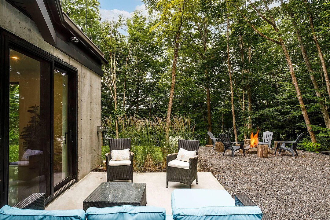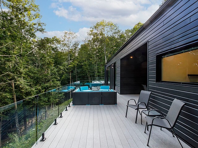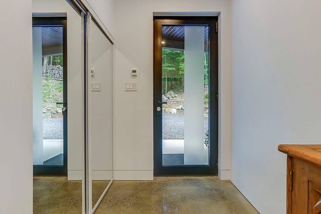 À l'extérieur, une vaste terrasse semi-couverte ainsi qu'un patio d'environ 1 000 pi² permettent de profiter pleinement du cadre naturel, en toute saison. Le confort est assuré par un plancher de béton poli chauffant sur l'ensemble de la propriété.