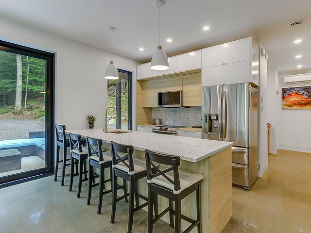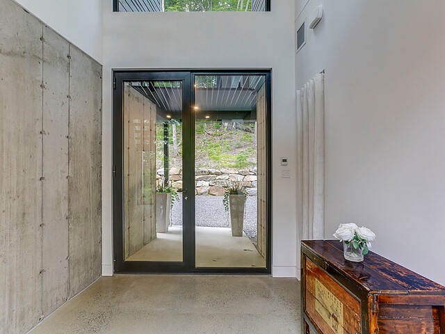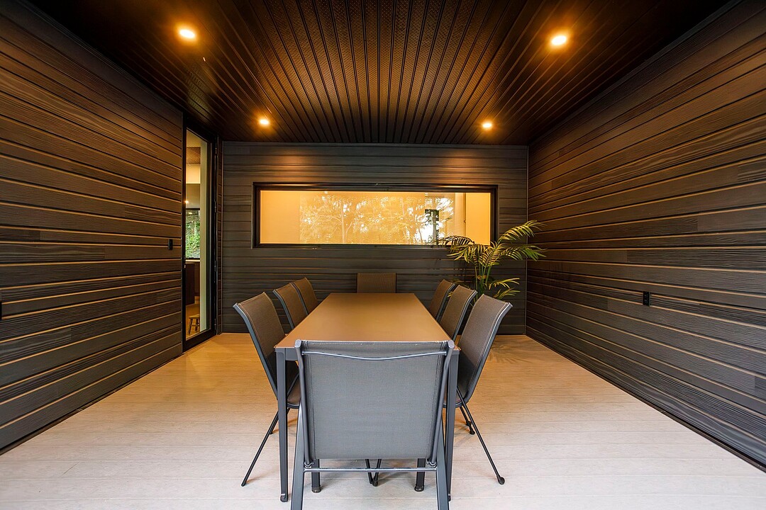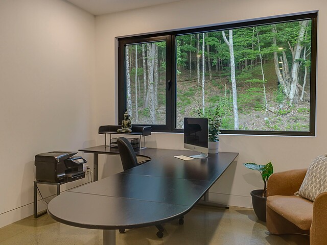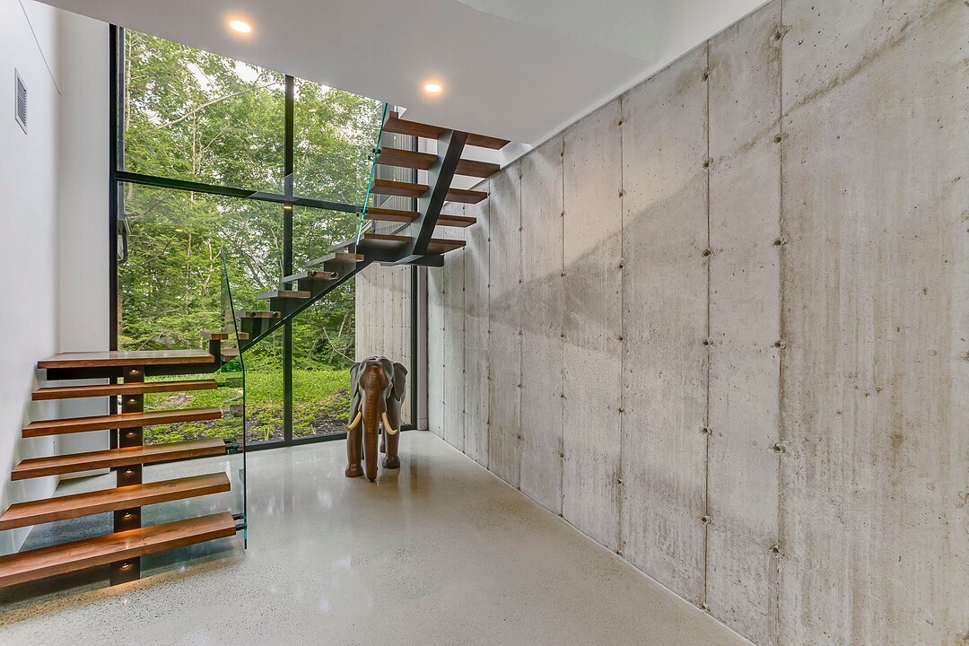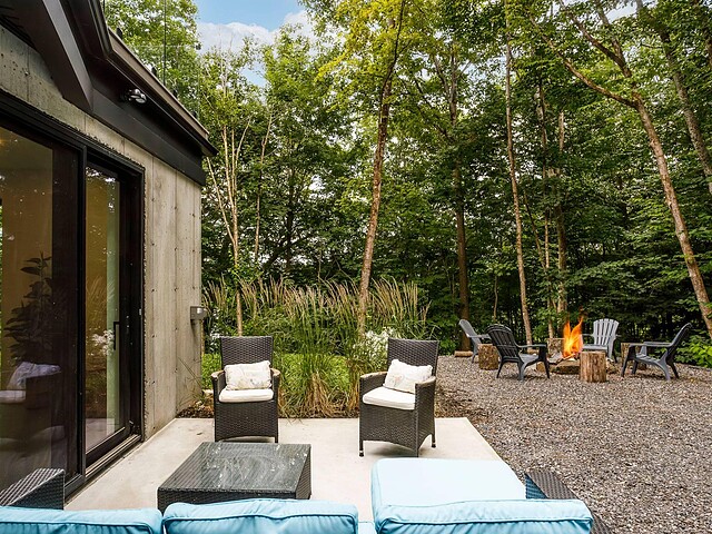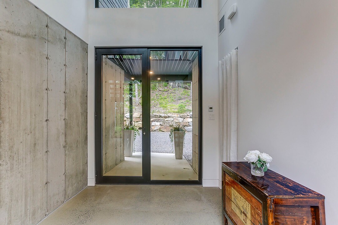 À l'extérieur, une vaste terrasse semi-couverte ainsi qu'un patio d'environ 1 000 pi² permettent de profiter pleinement du cadre naturel, en toute saison. Le confort est assuré par un plancher de béton poli chauffant sur l'ensemble de la propriété.