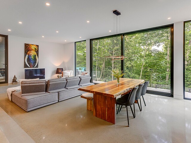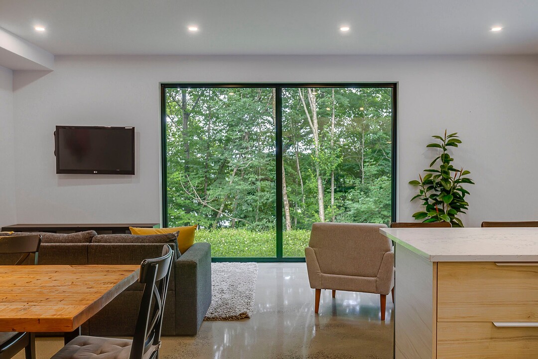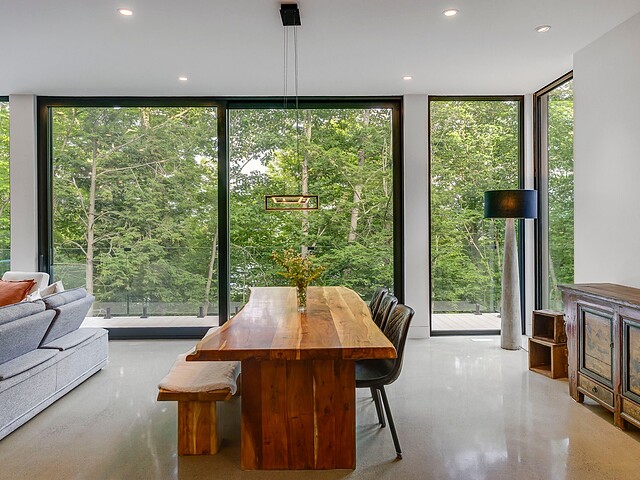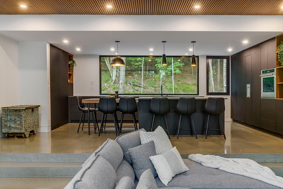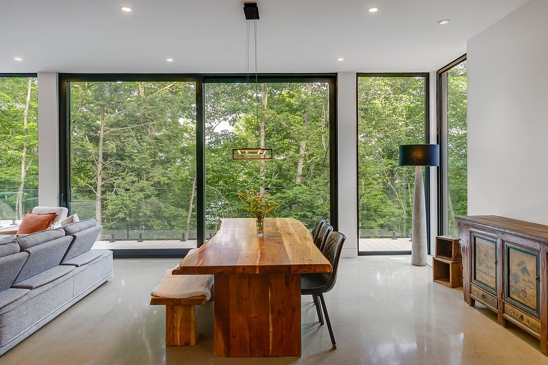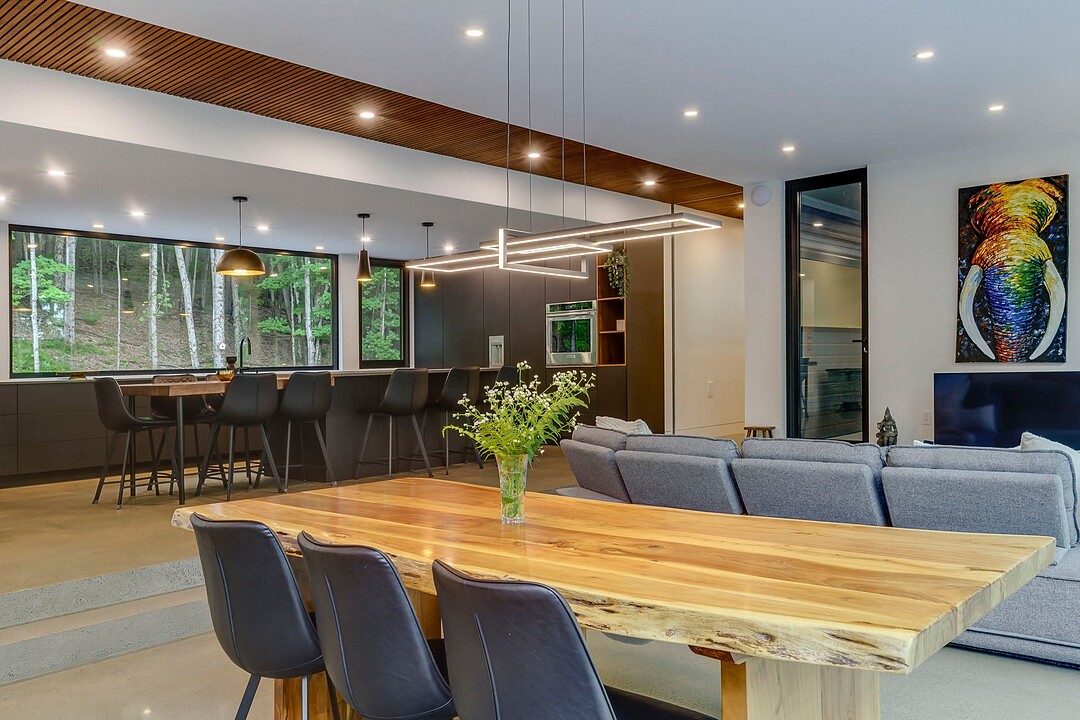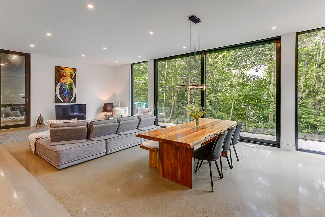 Les aires de vie -- salon, salle à manger et cuisine -- sont aménagées en concept aire ouverte, baignées de lumière naturelle grâce à une fenestration généreuse qui encadre des vues spectaculaires sur le lac, la forêt et les collines environnantes.