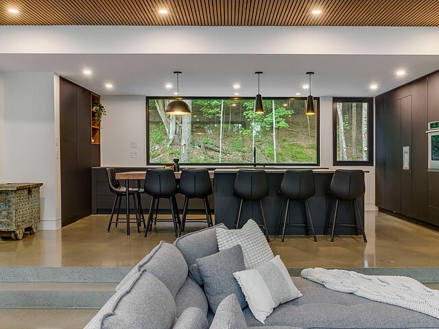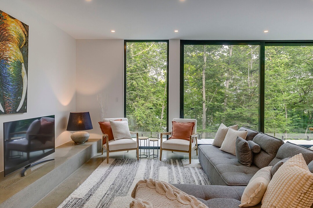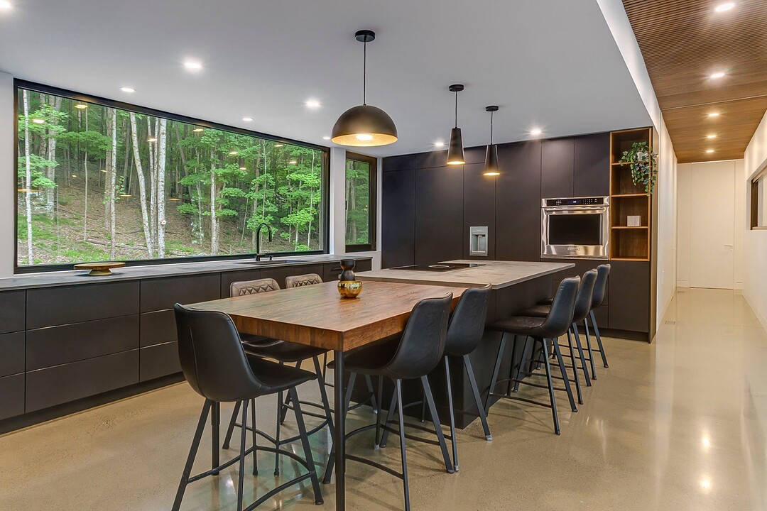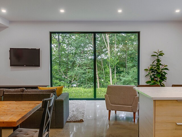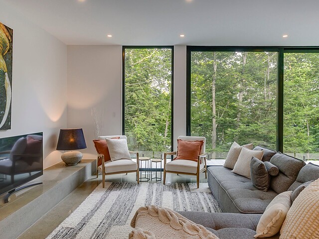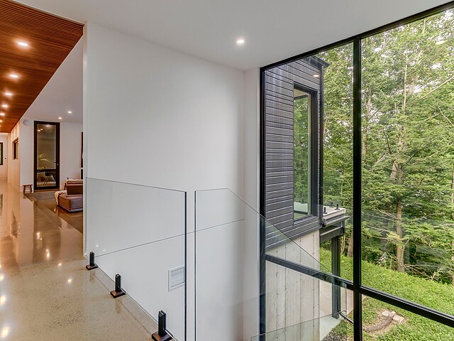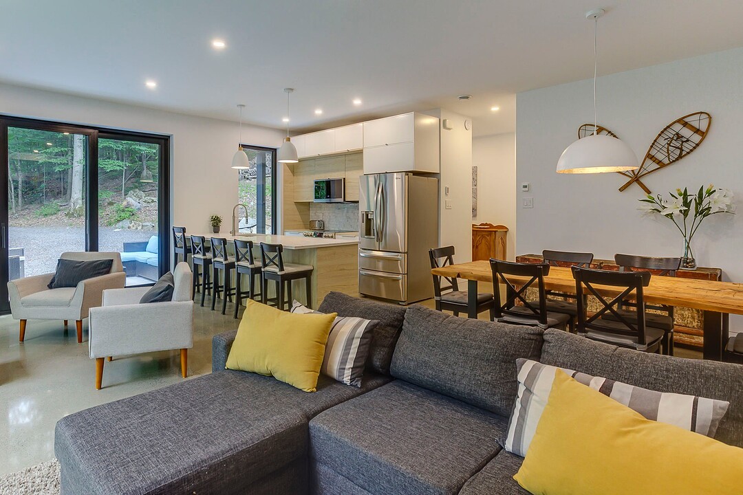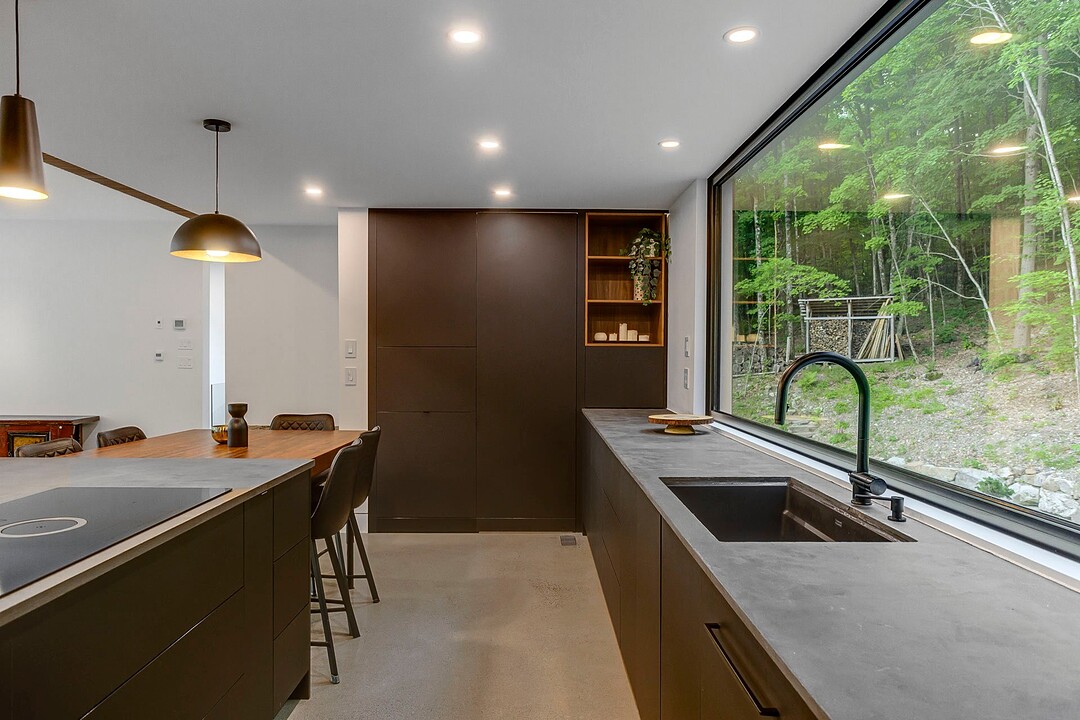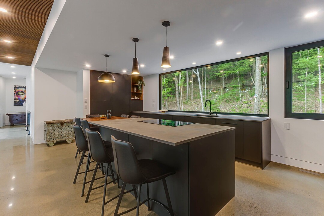 Les aires de vie -- salon, salle à manger et cuisine -- sont aménagées en concept aire ouverte, baignées de lumière naturelle grâce à une fenestration généreuse qui encadre des vues spectaculaires sur le lac, la forêt et les collines environnantes.