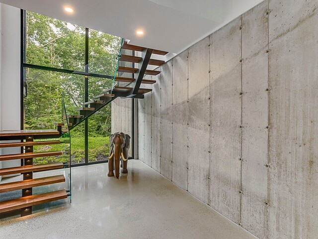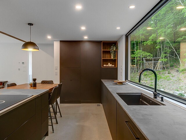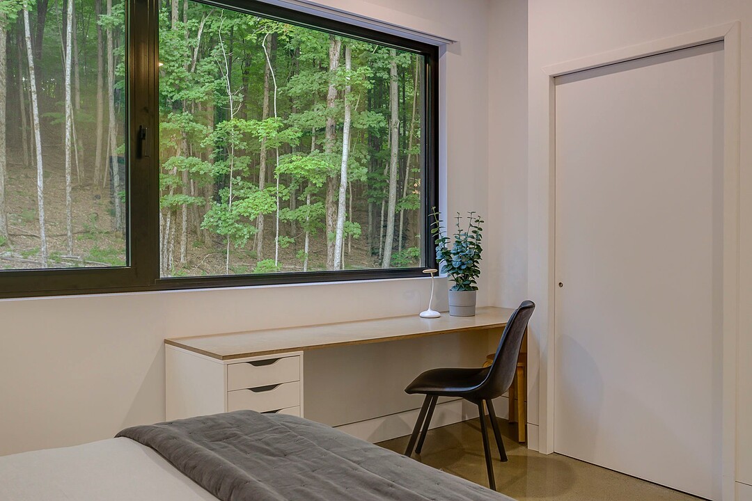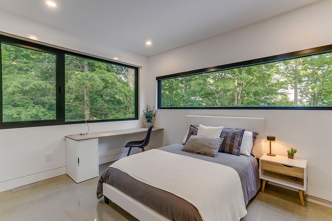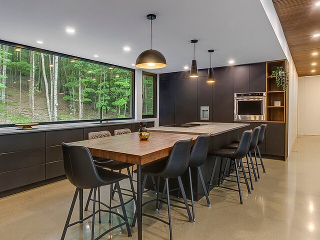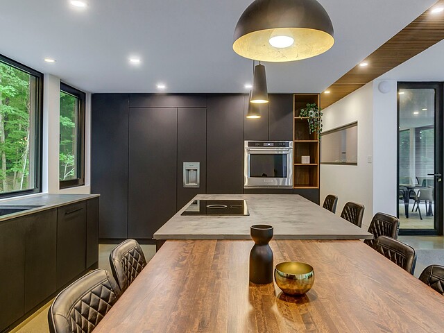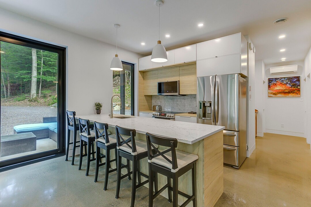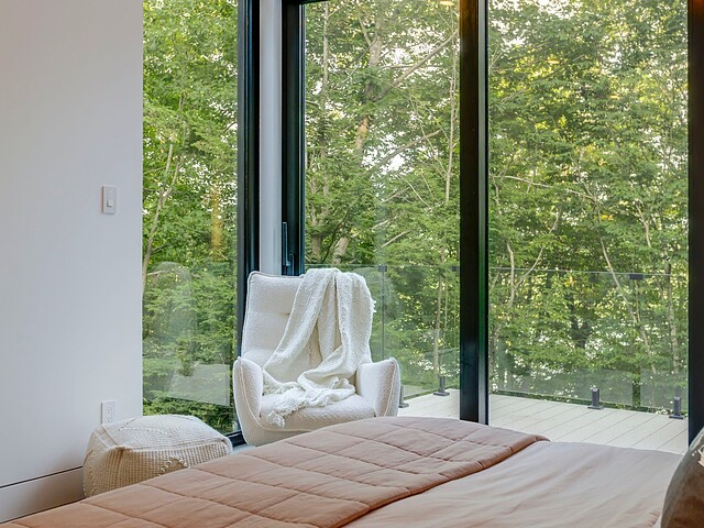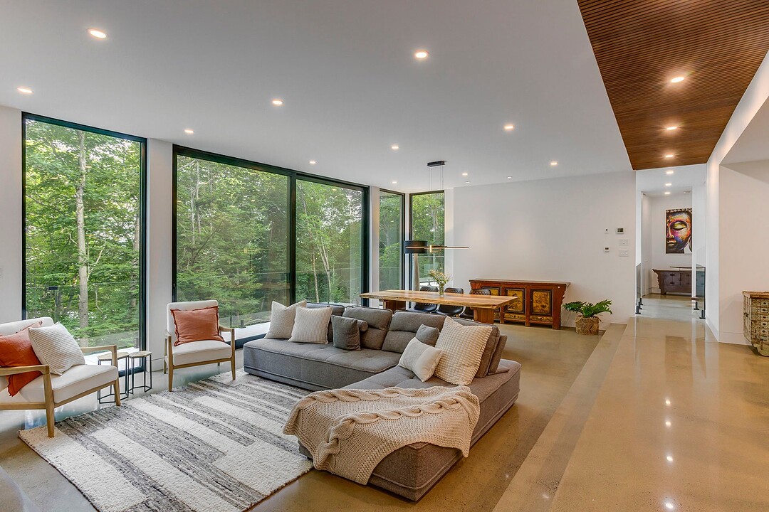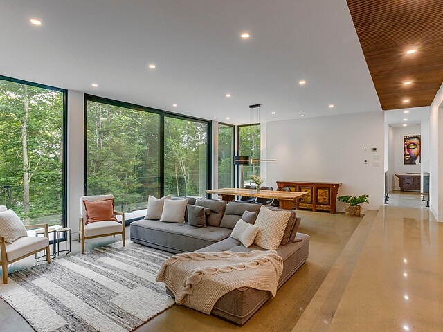 Les aires de vie -- salon, salle à manger et cuisine -- sont aménagées en concept aire ouverte, baignées de lumière naturelle grâce à une fenestration généreuse qui encadre des vues spectaculaires sur le lac, la forêt et les collines environnantes.