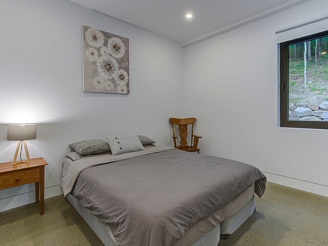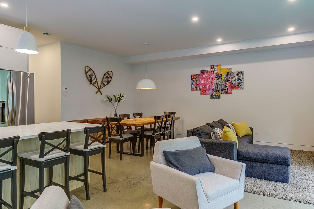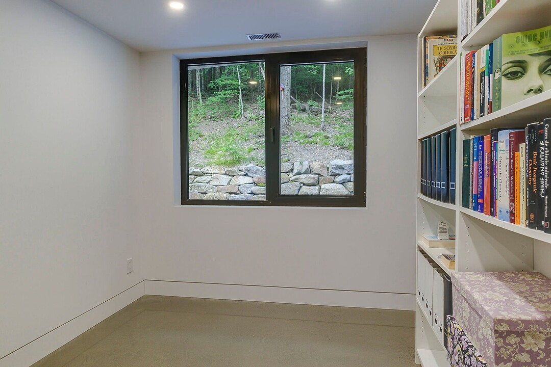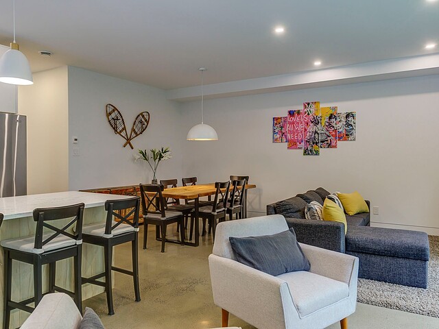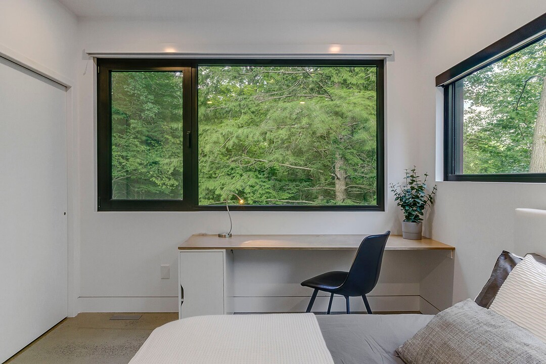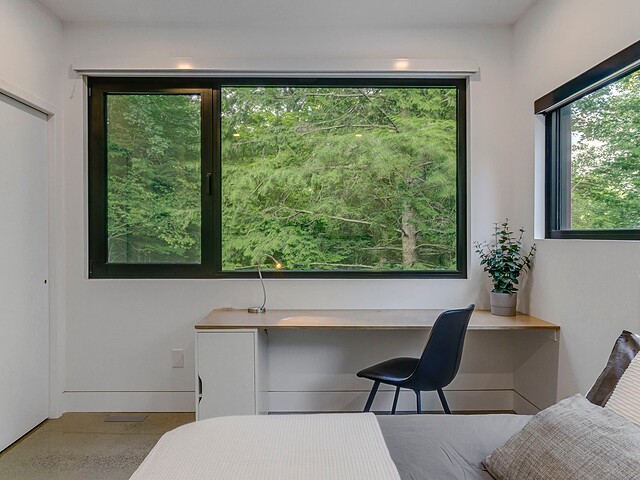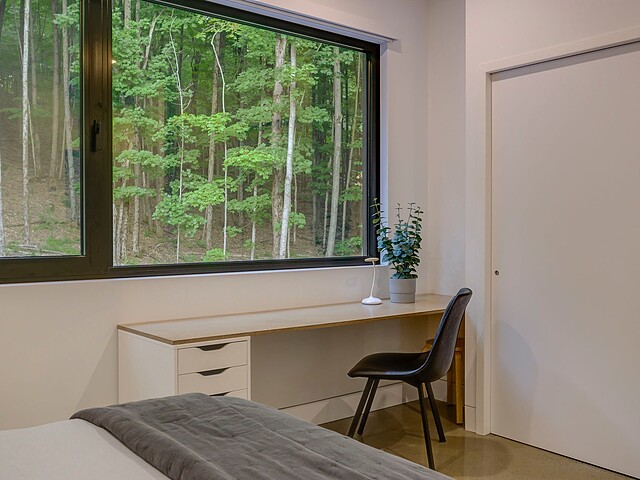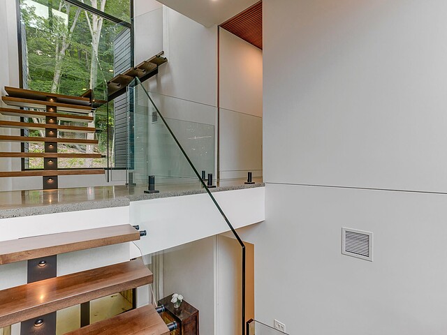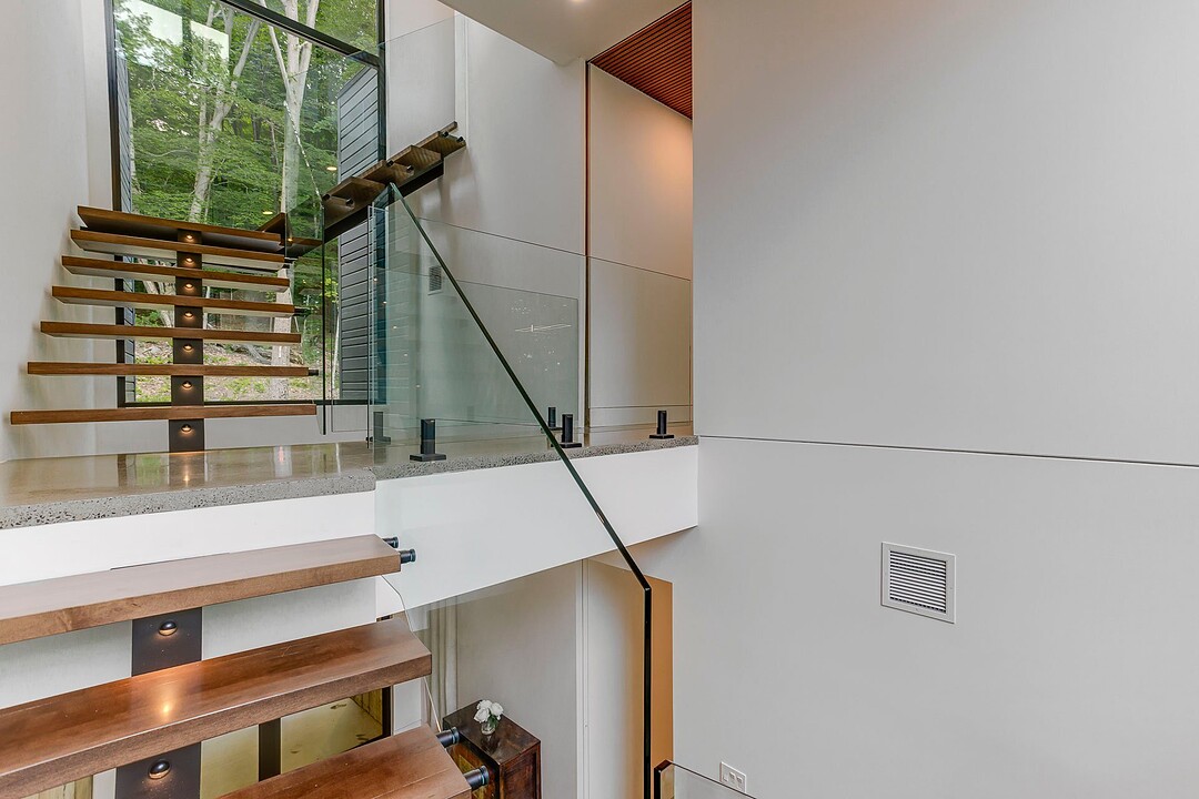 Les aires de vie -- salon, salle à manger et cuisine -- sont aménagées en concept aire ouverte, baignées de lumière naturelle grâce à une fenestration généreuse qui encadre des vues spectaculaires sur le lac, la forêt et les collines environnantes.