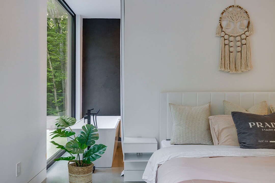La maison principale s'étend sur deux étages et propose une configuration idéale pour une famille ou des occupants recherchant espace et confort. On y retrouve cinq chambres à l'étage, incluant une élégante suite parentale avec terrasse privée, salle de bain à aire ouverte, douche pluie et baignoire offrant une vue panoramique sur le lac Bromont.