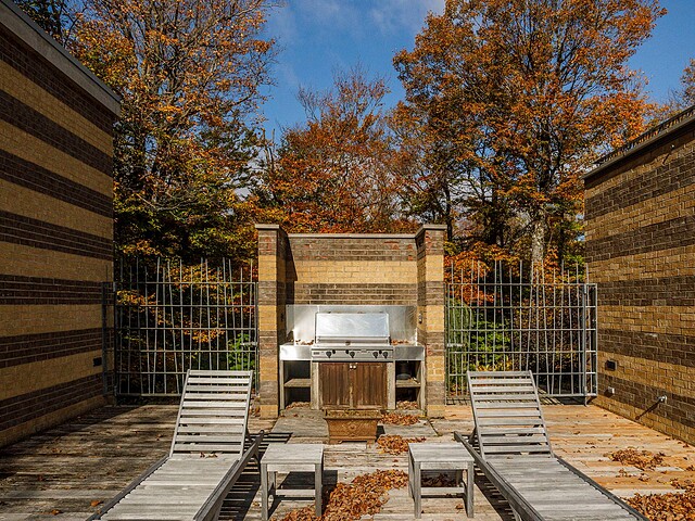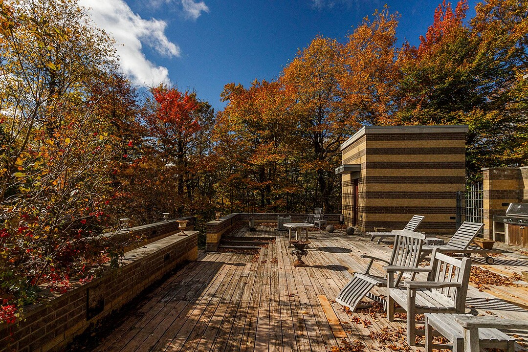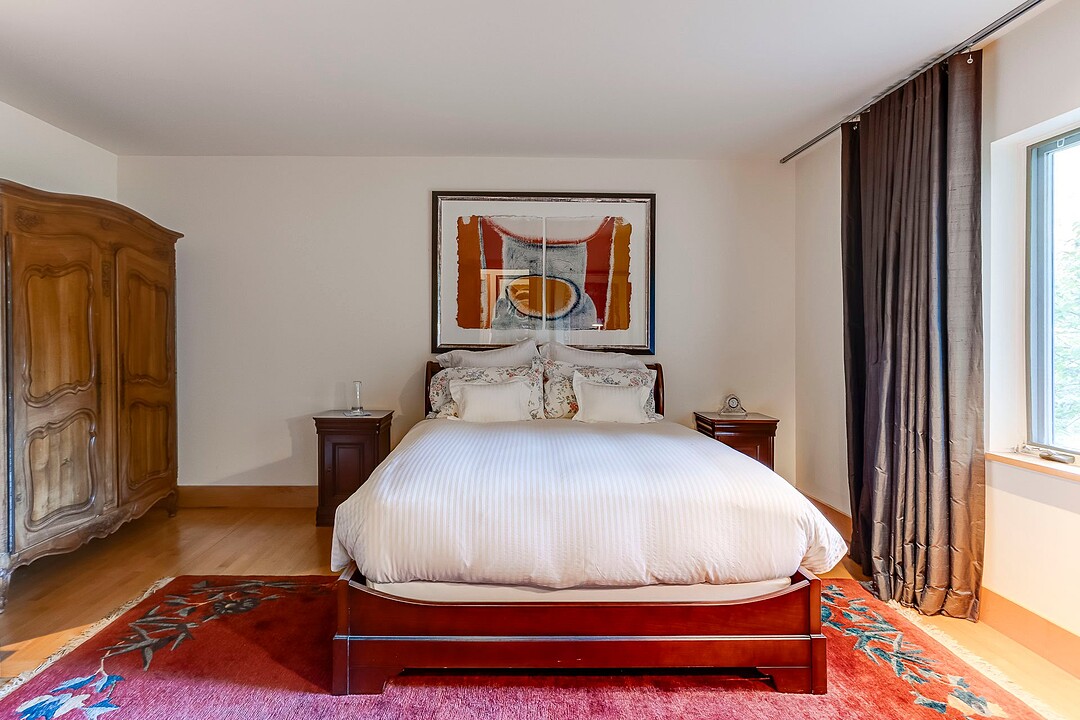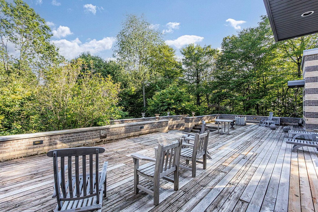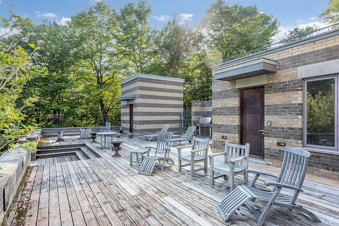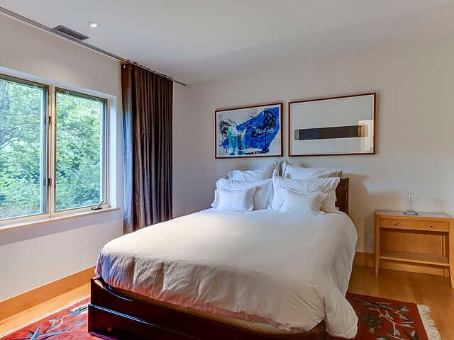 À l'abri des regards, l'extérieur propose de superbes aires de détente offrant une vue panoramique imprenable sur les montagnes, un vaste terrain boisé et un étang privé.