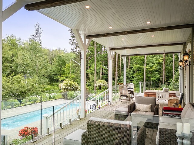 À l'abri des regards, les aires de détente extérieures vous offrent des environnements paisibles avec une belle vue sur une nature luxuriante. Des terrasses aménagées sur différents niveaux, une grande véranda grillagée, un lac et une magnifique piscine nouvellement aménagée composent un cadre digne des plus beaux aménagements extérieurs.