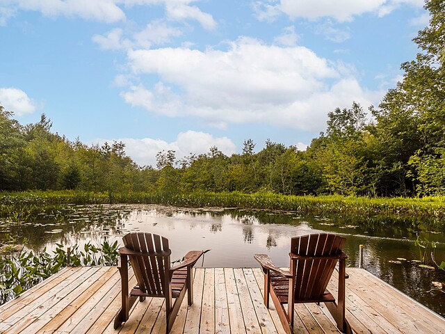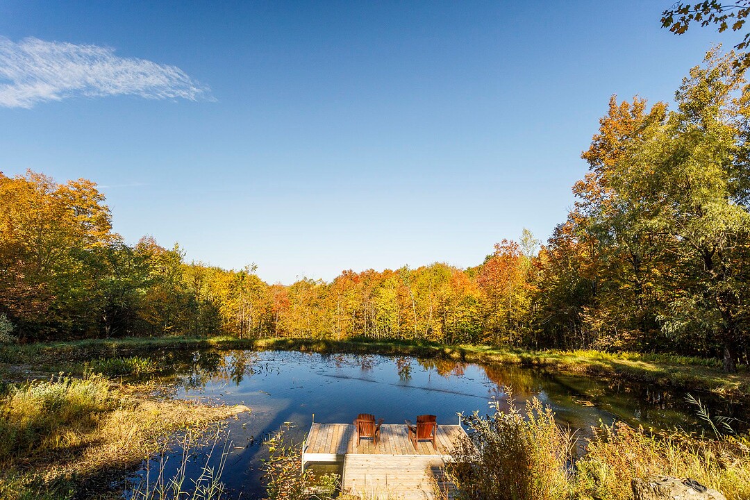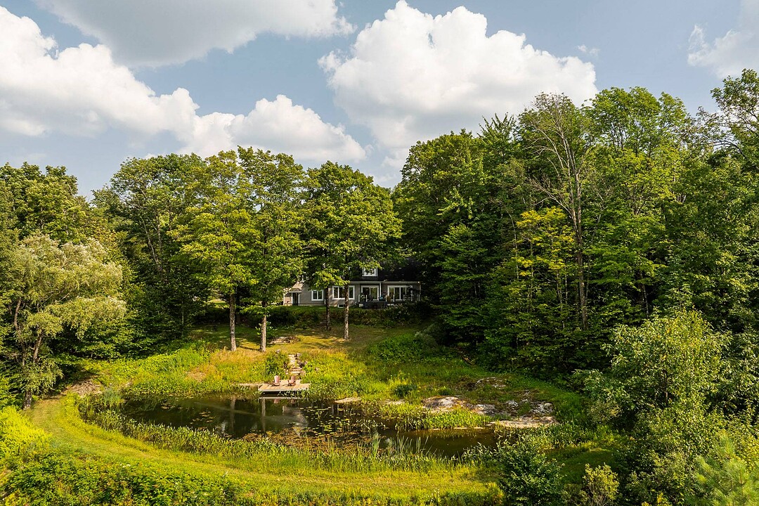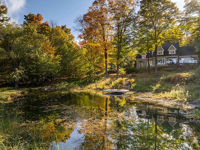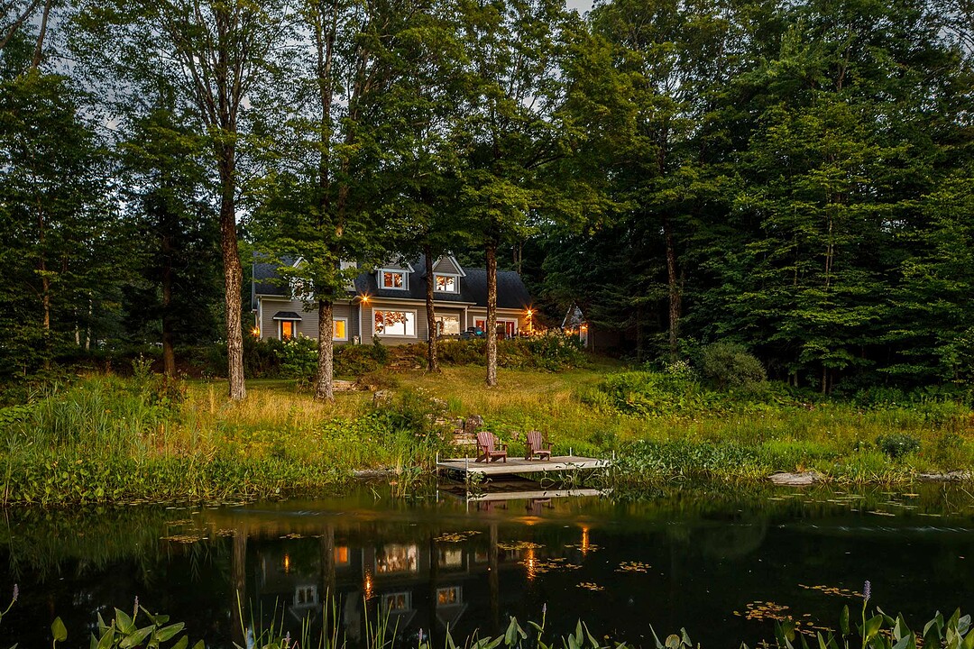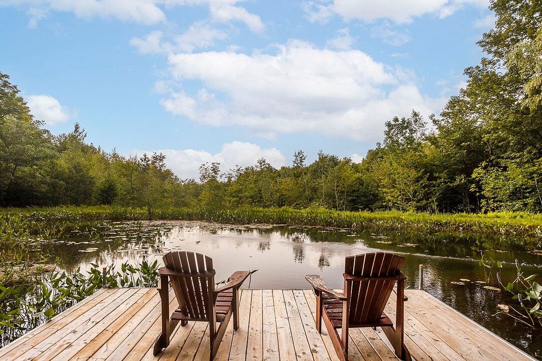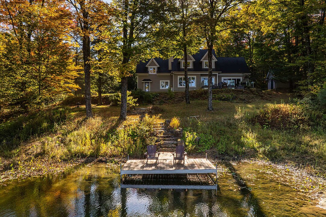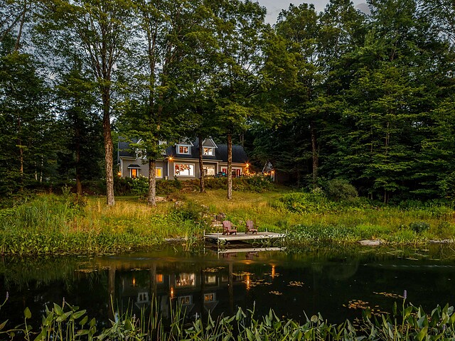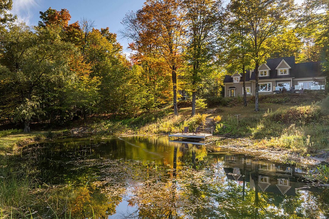 À l'extérieur, l'environnement est tout simplement splendide : arbres matures, étang privé avec quai, vaste terrasse en composite et intimité absolue sur un terrain de 7,86 acres. Un garage détaché et une remise complètent l'ensemble.
