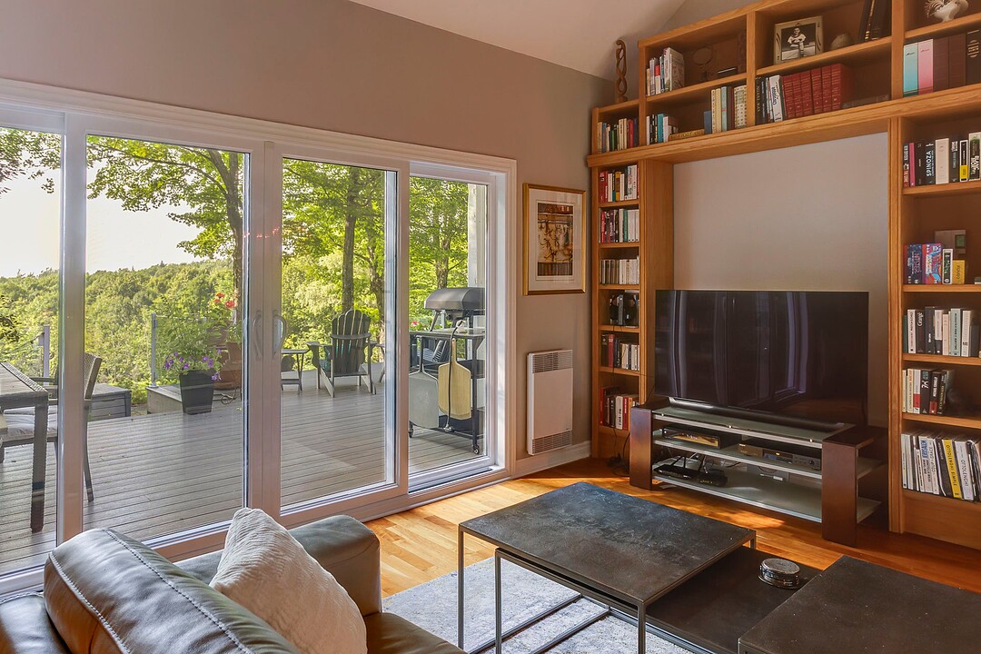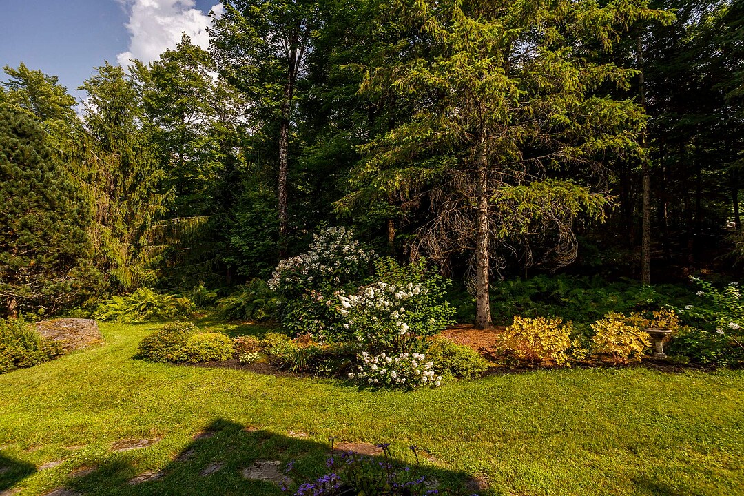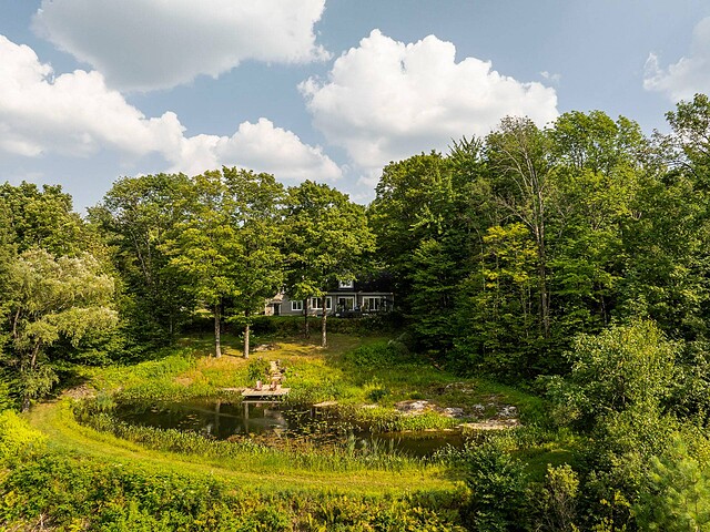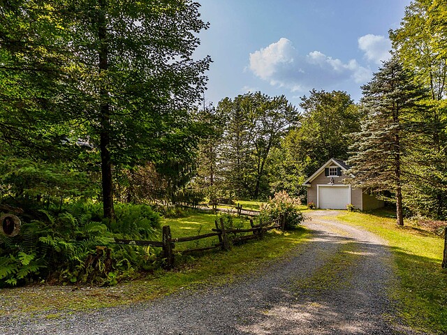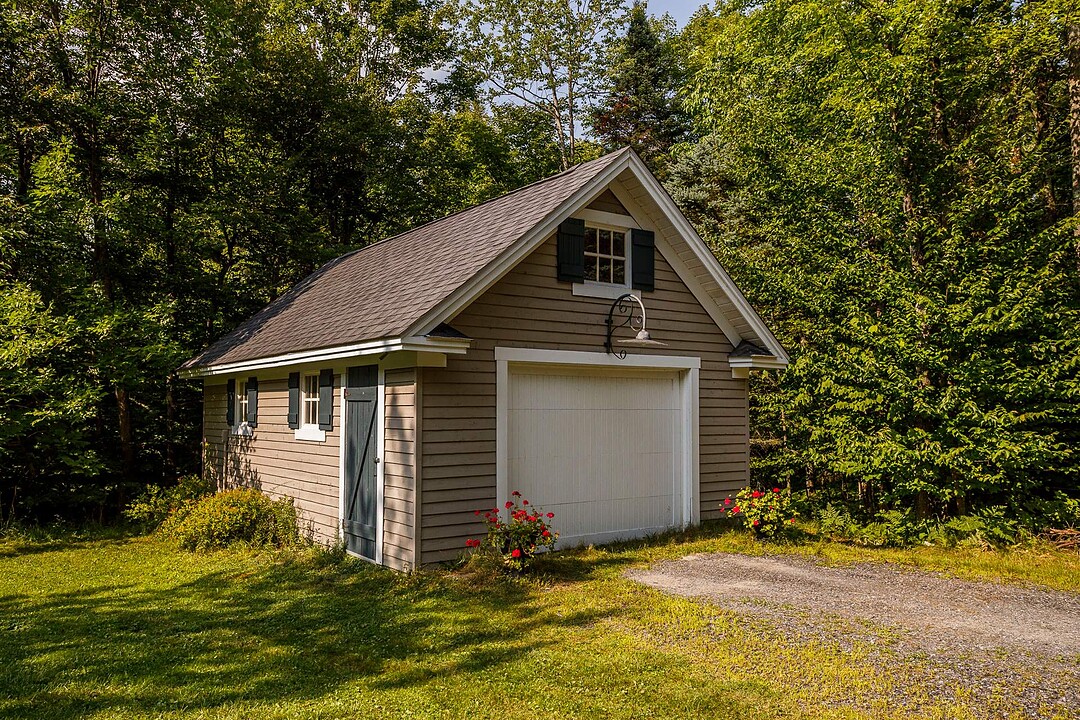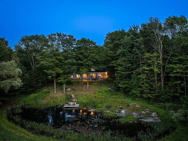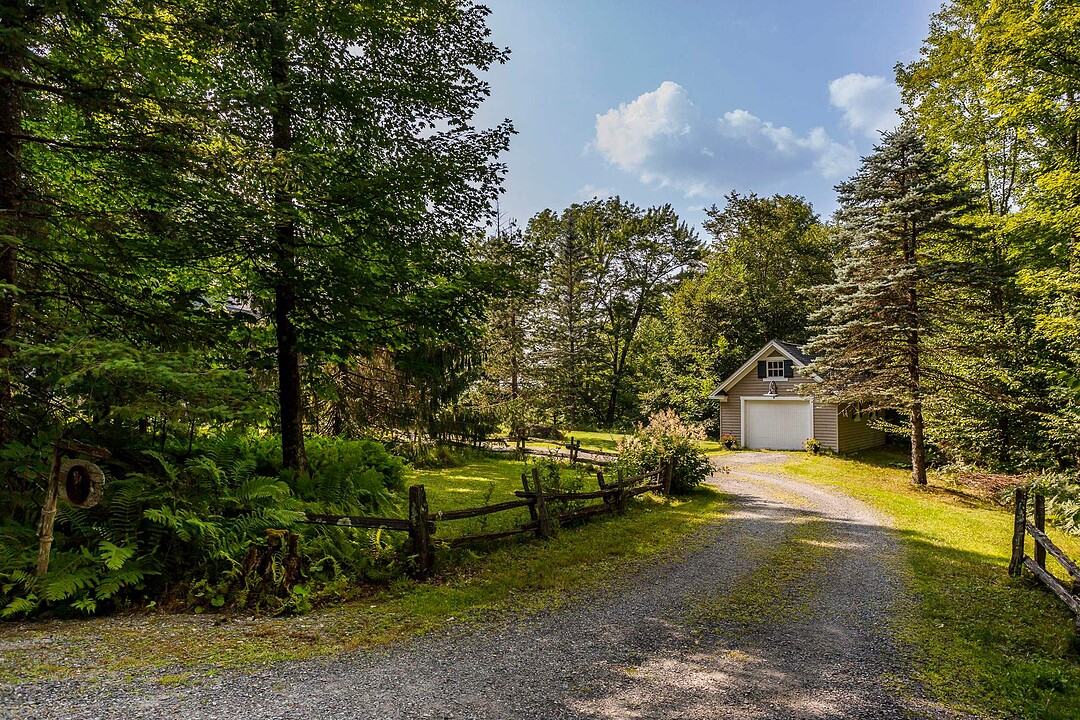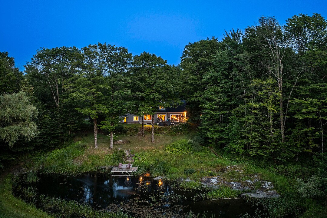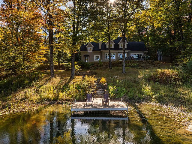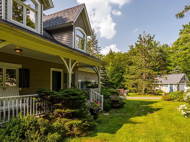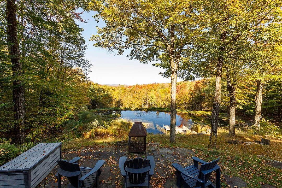 À l'extérieur, l'environnement est tout simplement splendide : arbres matures, étang privé avec quai, vaste terrasse en composite et intimité absolue sur un terrain de 7,86 acres. Un garage détaché et une remise complètent l'ensemble.