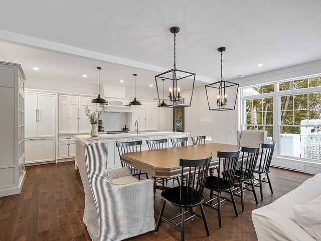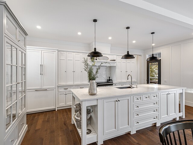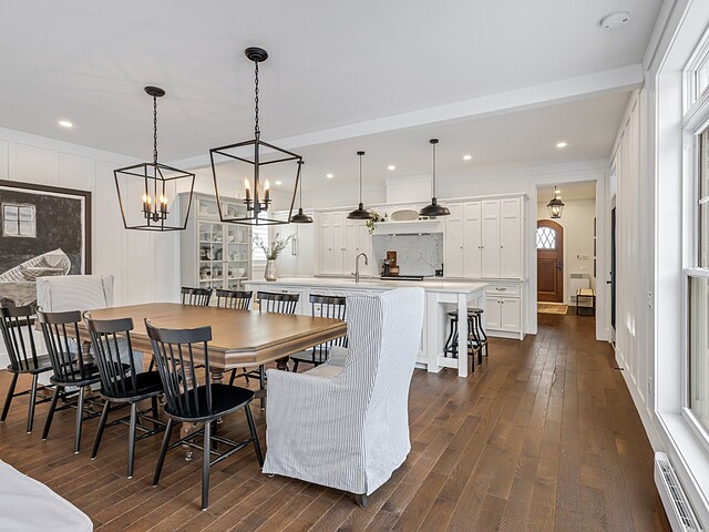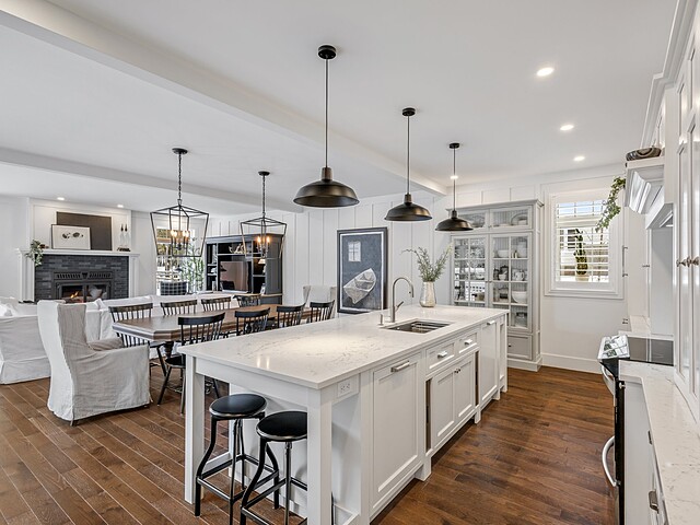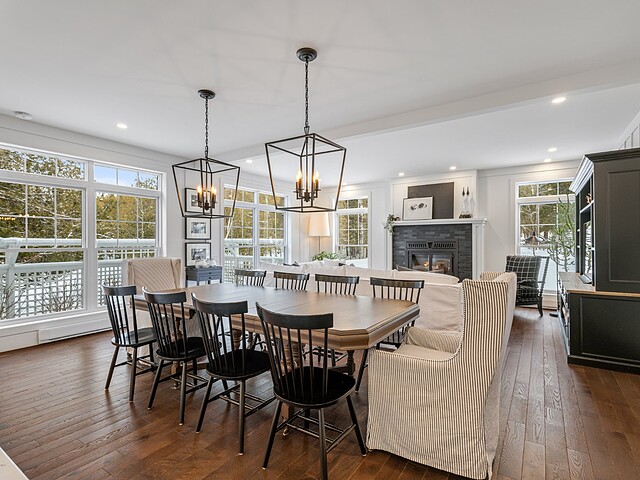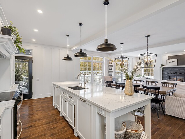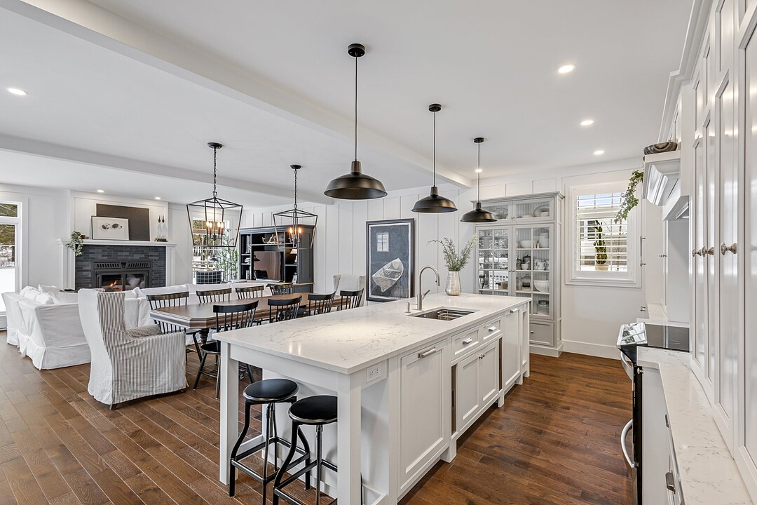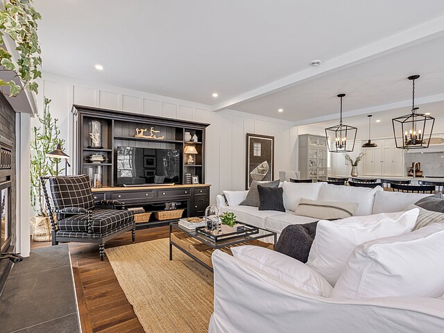 L'aire de vie principale, à concept ouvert, propose une vaste cuisine dotée d'un îlot central, idéale pour recevoir. Elle s'ouvre harmonieusement sur la salle à manger et le salon, agrémenté d'un foyer au bois créant une atmosphère des plus accueillantes.