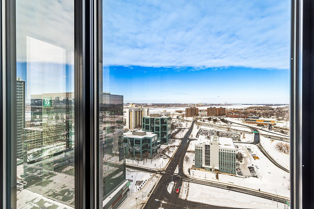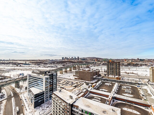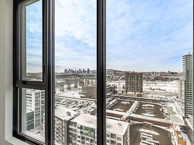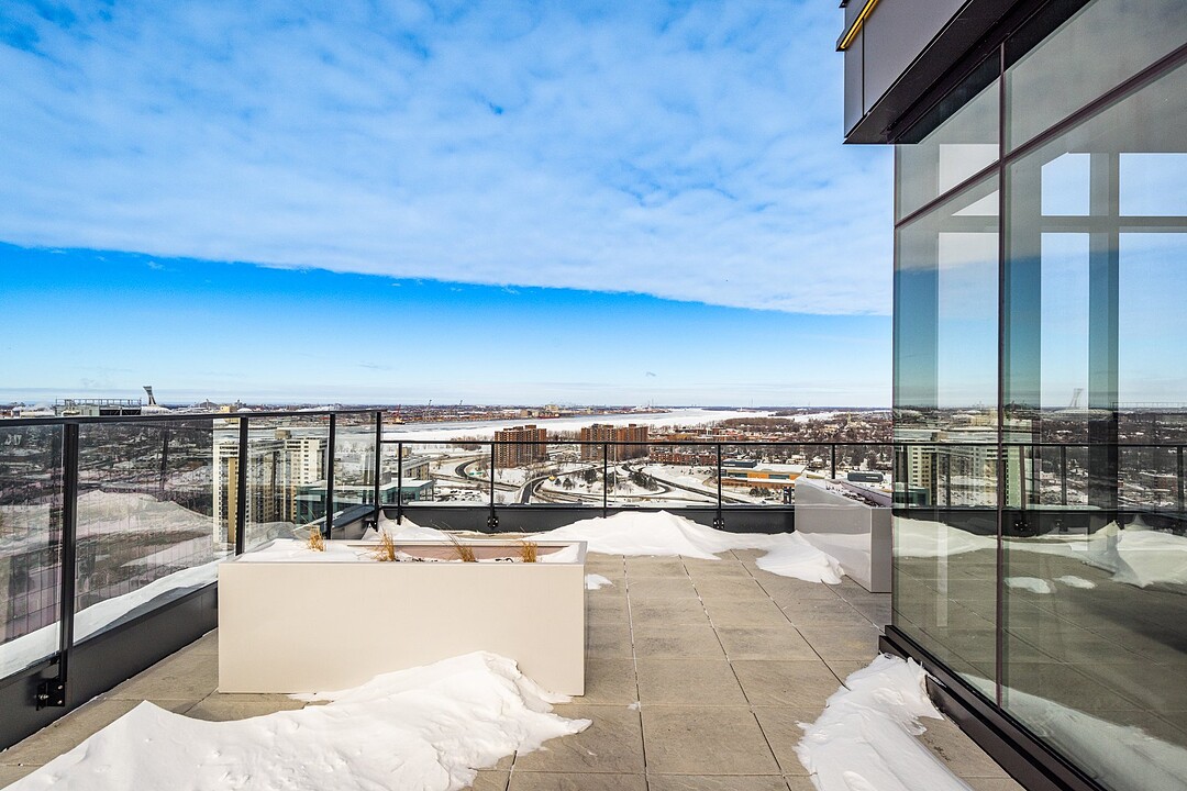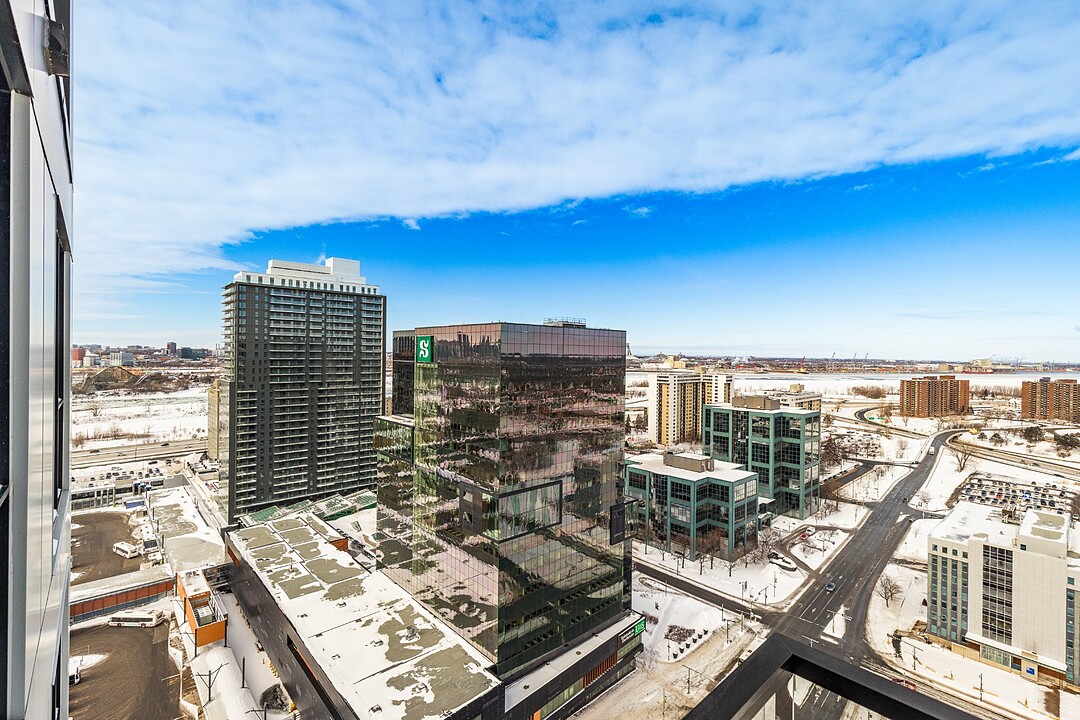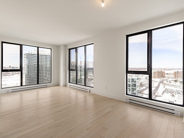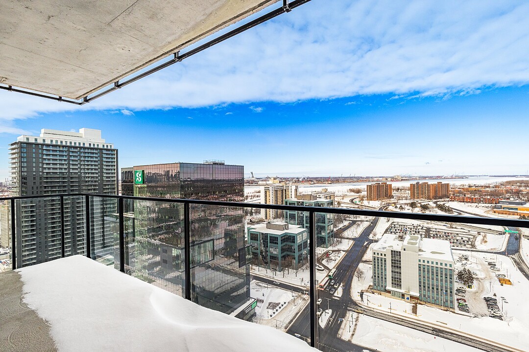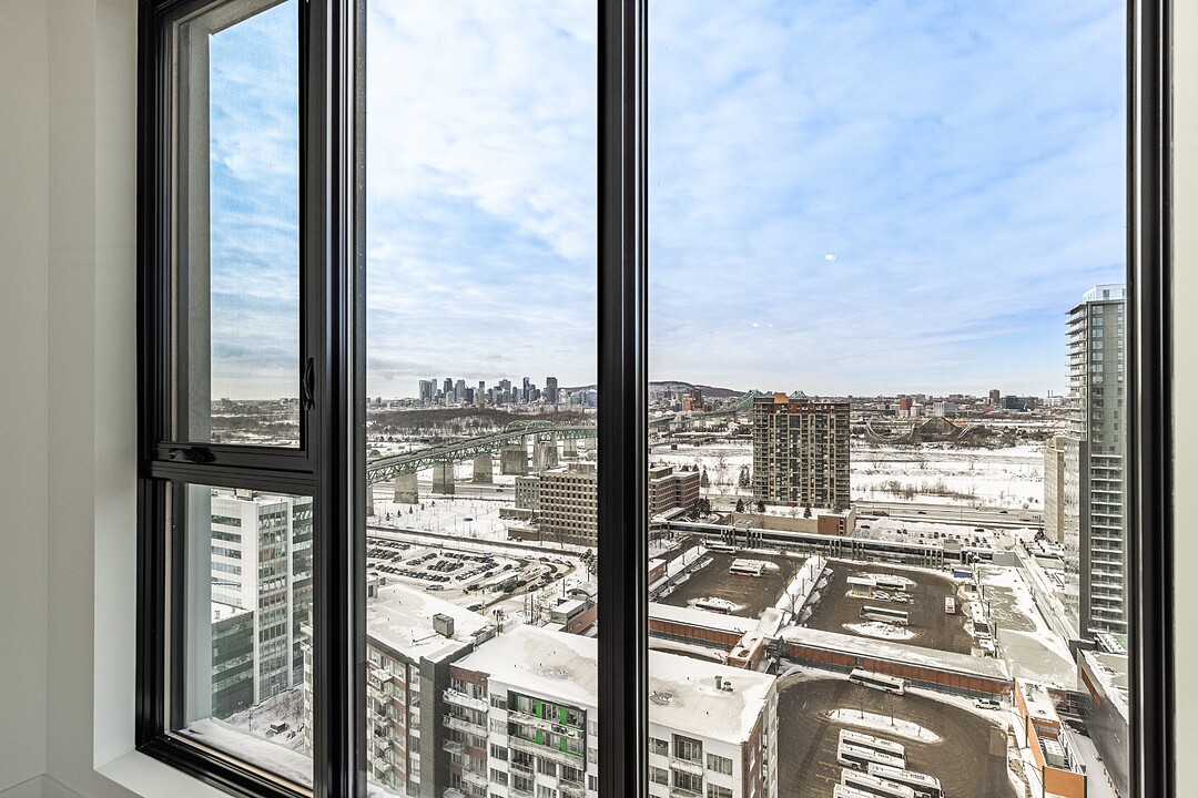 Grâce à sa fenestration abondante, l'unité bénéficie d'une luminosité naturelle remarquable et de vues dégagées vers le fleuve, le pont Jacques-Cartier et le centre-ville de Montréal.