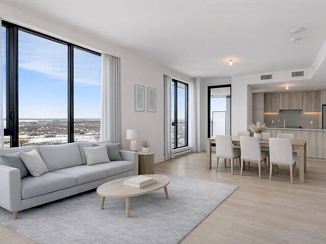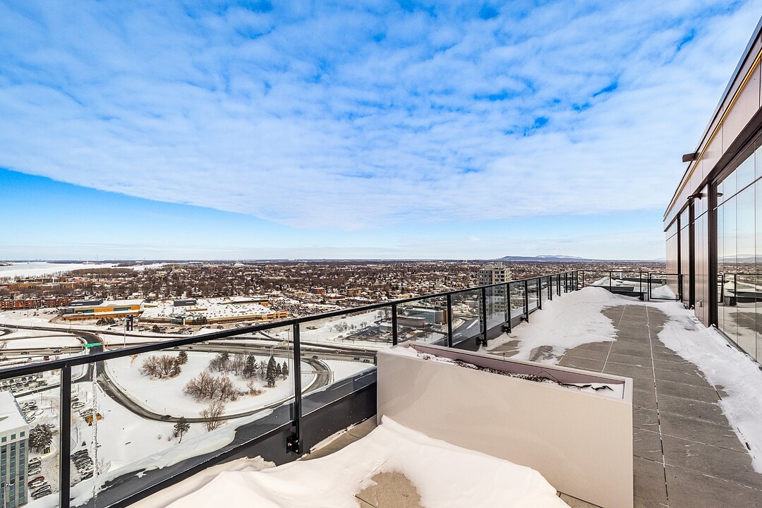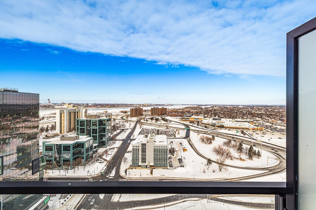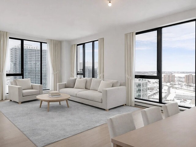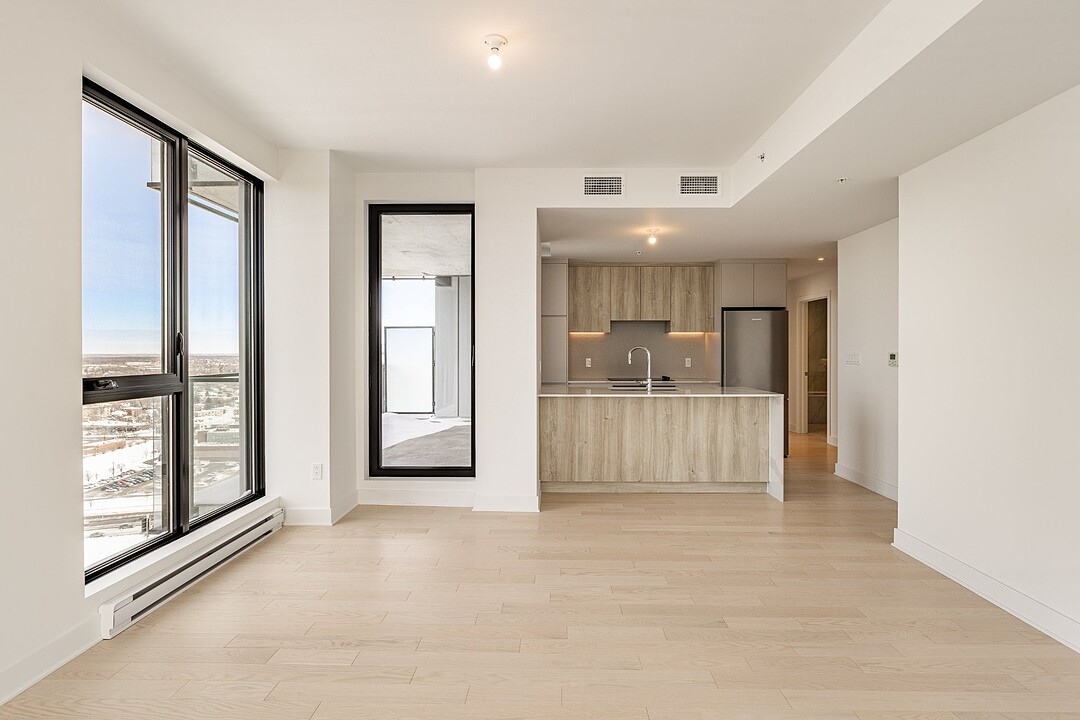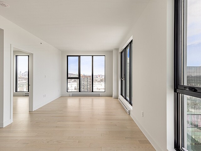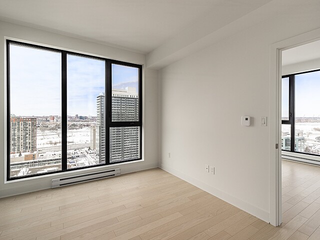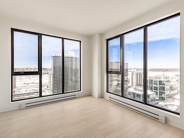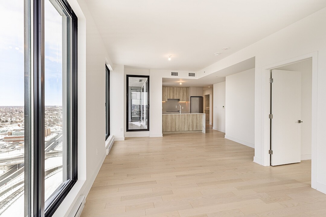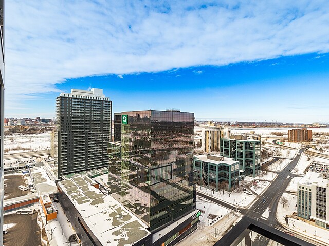 Grâce à sa fenestration abondante, l'unité bénéficie d'une luminosité naturelle remarquable et de vues dégagées vers le fleuve, le pont Jacques-Cartier et le centre-ville de Montréal.