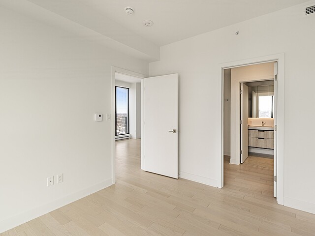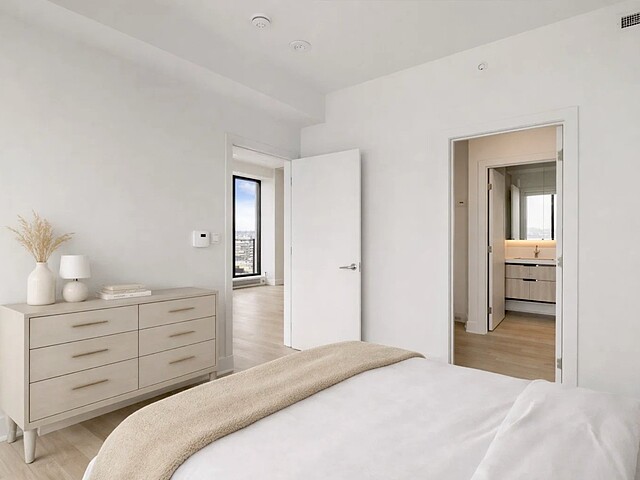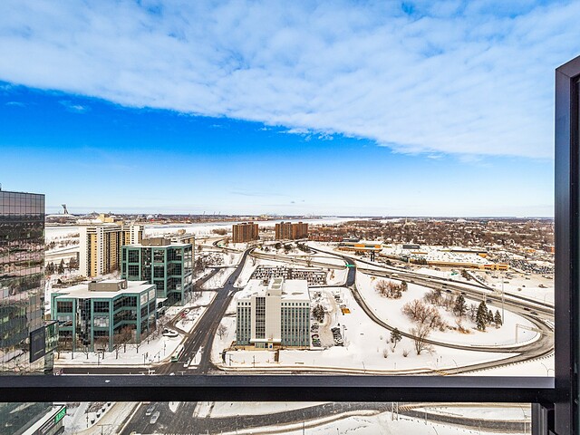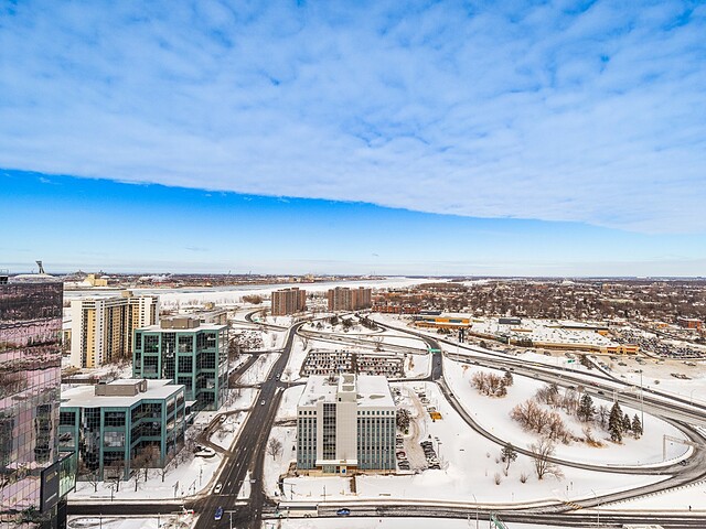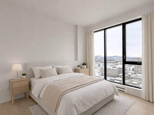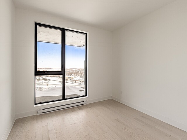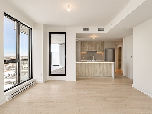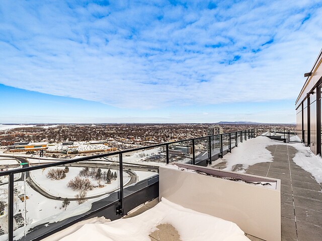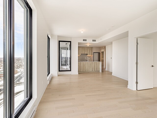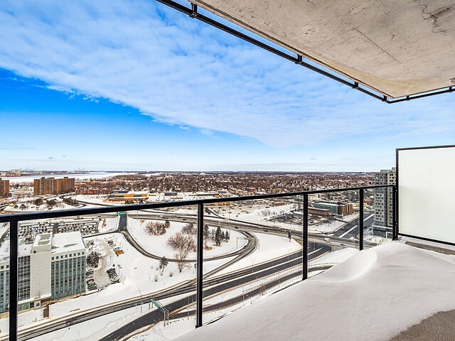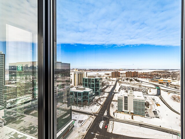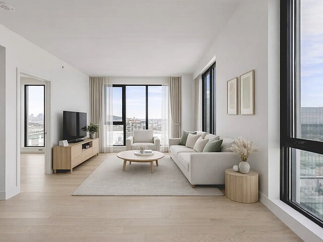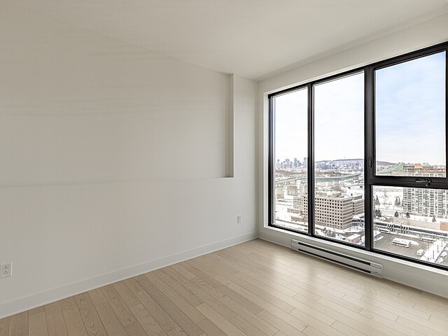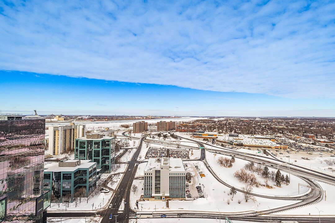 Grâce à sa fenestration abondante, l'unité bénéficie d'une luminosité naturelle remarquable et de vues dégagées vers le fleuve, le pont Jacques-Cartier et le centre-ville de Montréal.