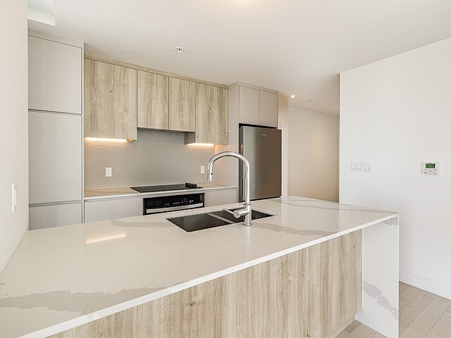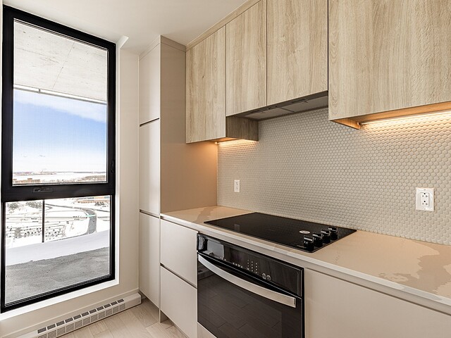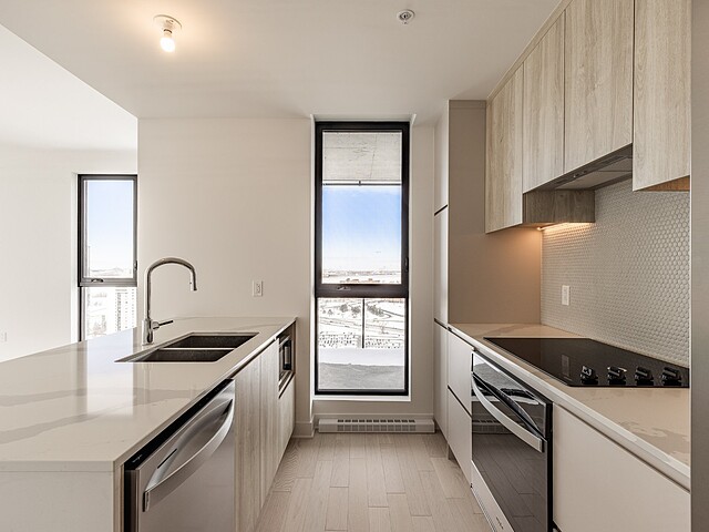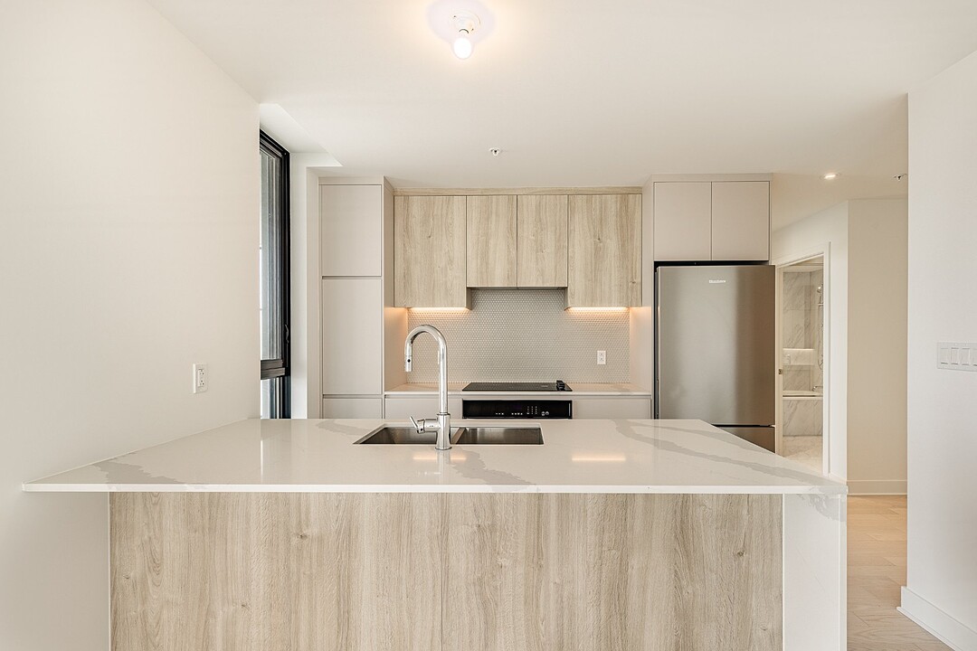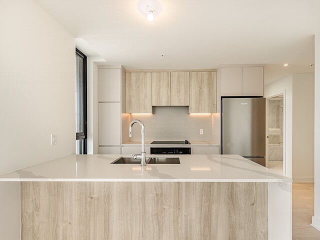 Les espaces intérieurs sont conçus avec soin et présentent une disposition fonctionnelle : aire de vie ouverte, cuisine moderne avec armoires contemporaines, comptoirs de quartz, dosseret en céramique et électroménagers en acier inoxydable. Les planchers en bois d'ingénierie, les plafonds en béton fini et les matériaux de qualité confèrent à l'unité un style à la fois sobre et raffiné.