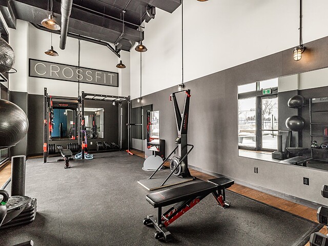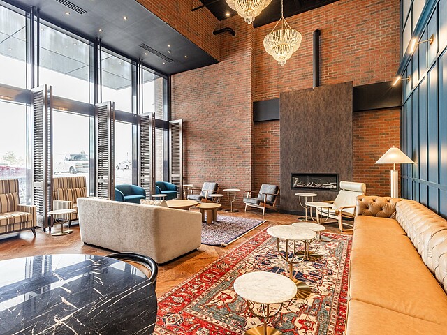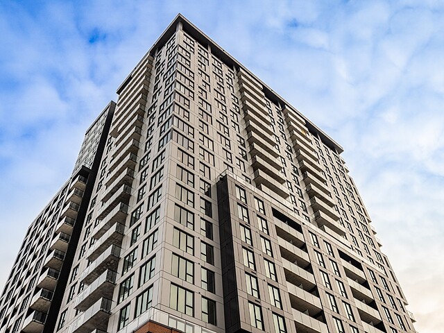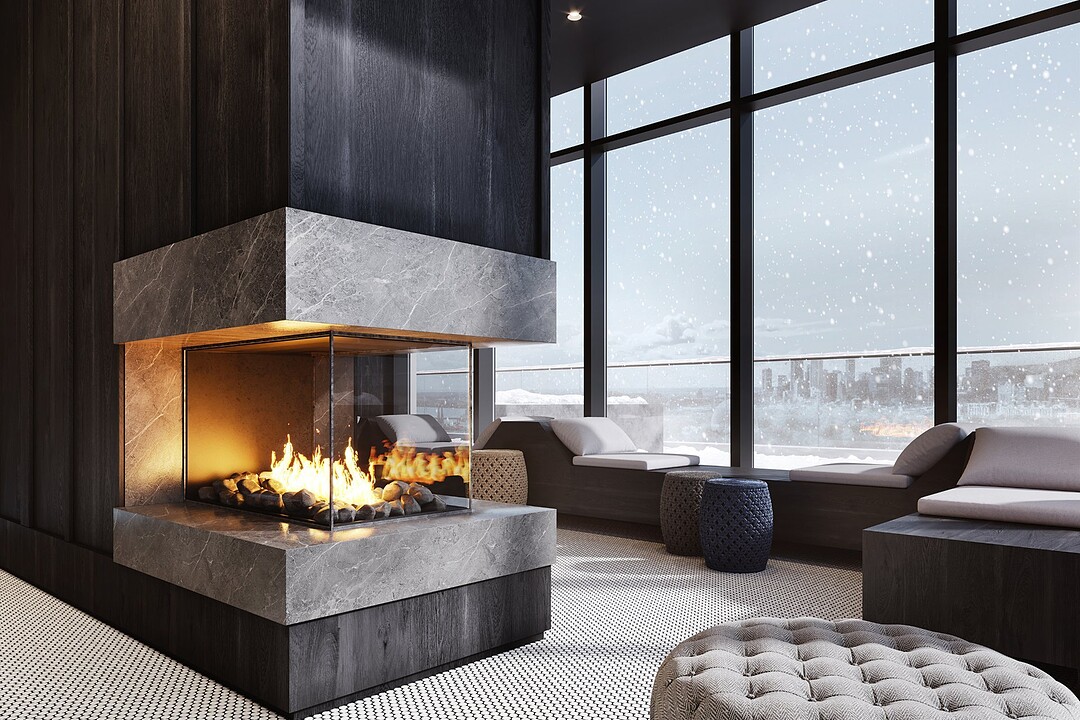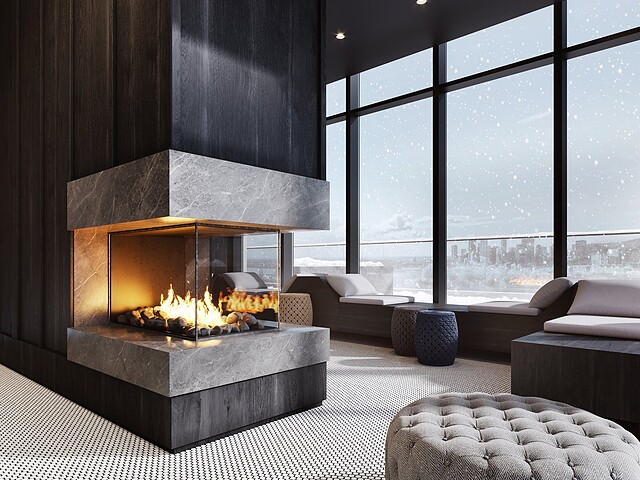 L'immeuble offre des aires communes haut de gamme incluant un lobby élégant, un gym entièrement équipé, un circuit spa avec sauna sec et vapeur, bains chaud et froid, ainsi qu'une terrasse sur le toit avec piscine extérieure, espaces lounge et BBQ, offrant des points de vue spectaculaires sur Montréal et le fleuve.