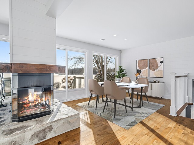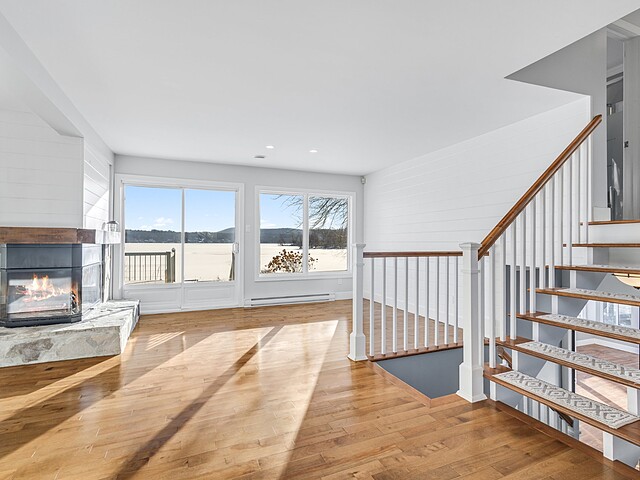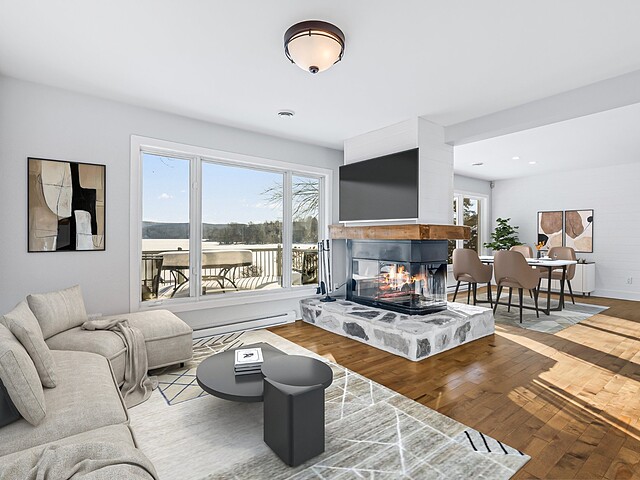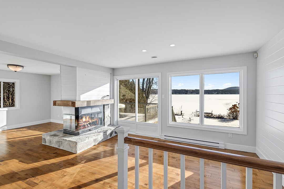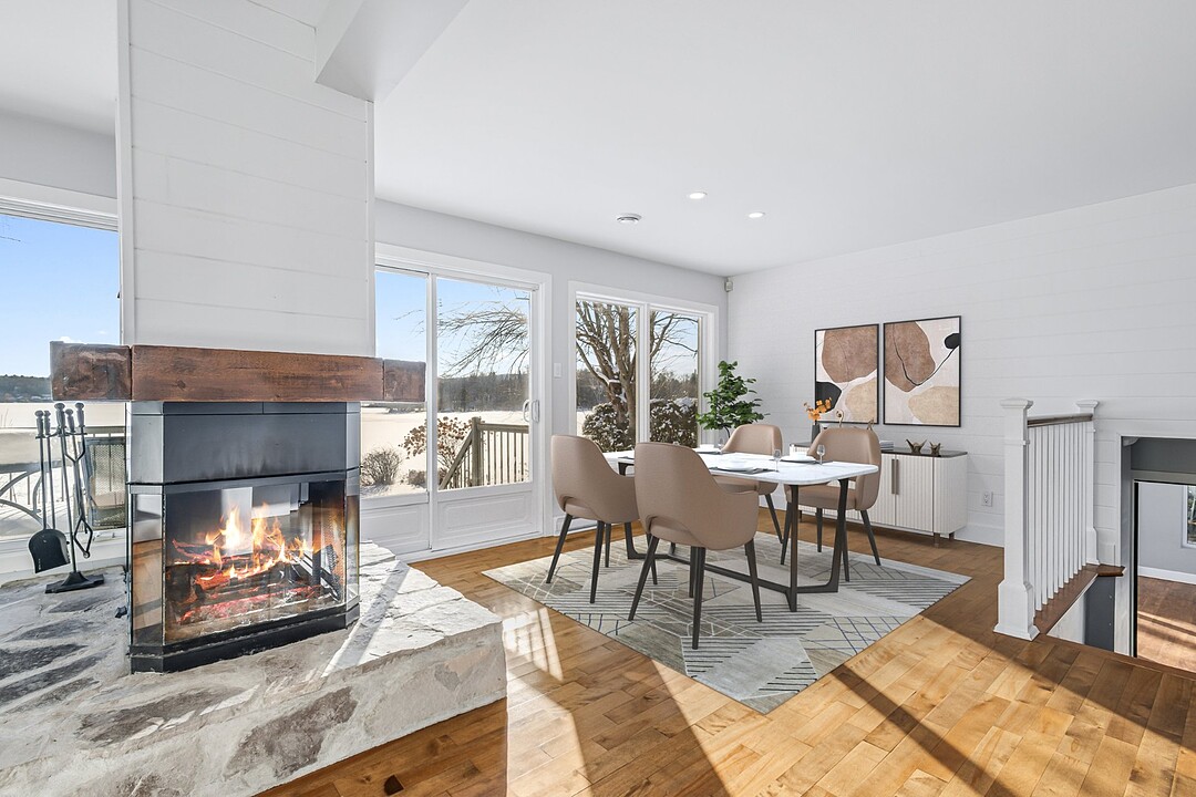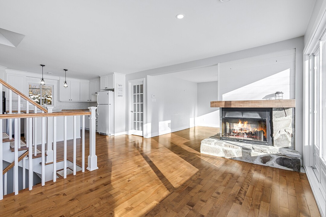 L'aire de vie principale, chaleureuse et conviviale, propose un concept à aire ouverte réunissant un salon agrémenté d'un foyer au bois double face, une salle à manger accueillante et une cuisine avec îlot central. L'ensemble s'ouvre sur une terrasse surplombant l'eau, idéale pour savourer des moments de détente ou recevoir famille et invités dans un décor enchanteur.