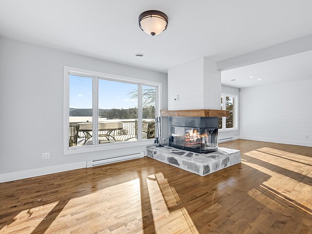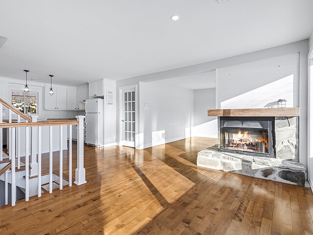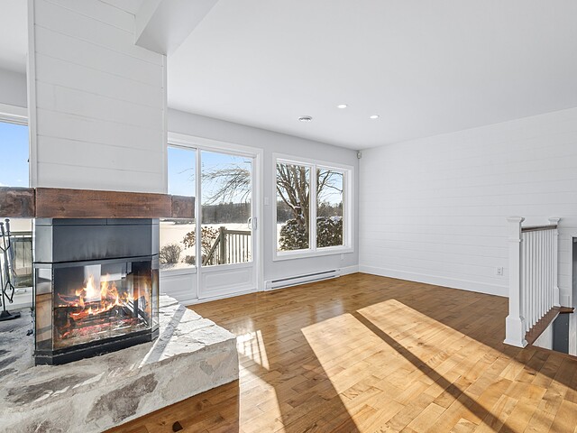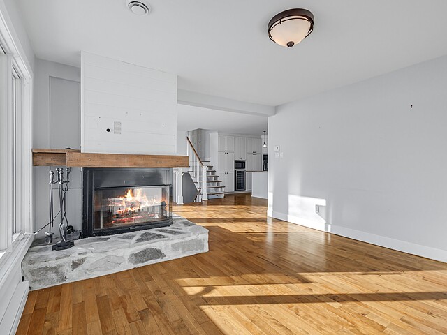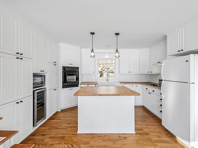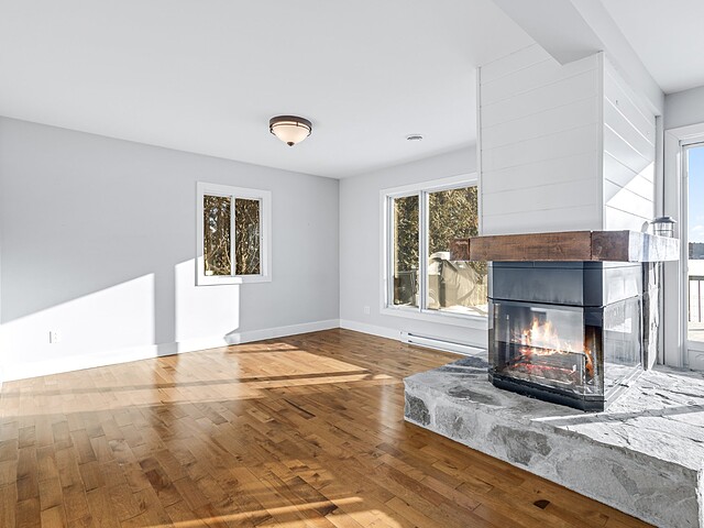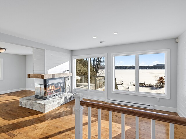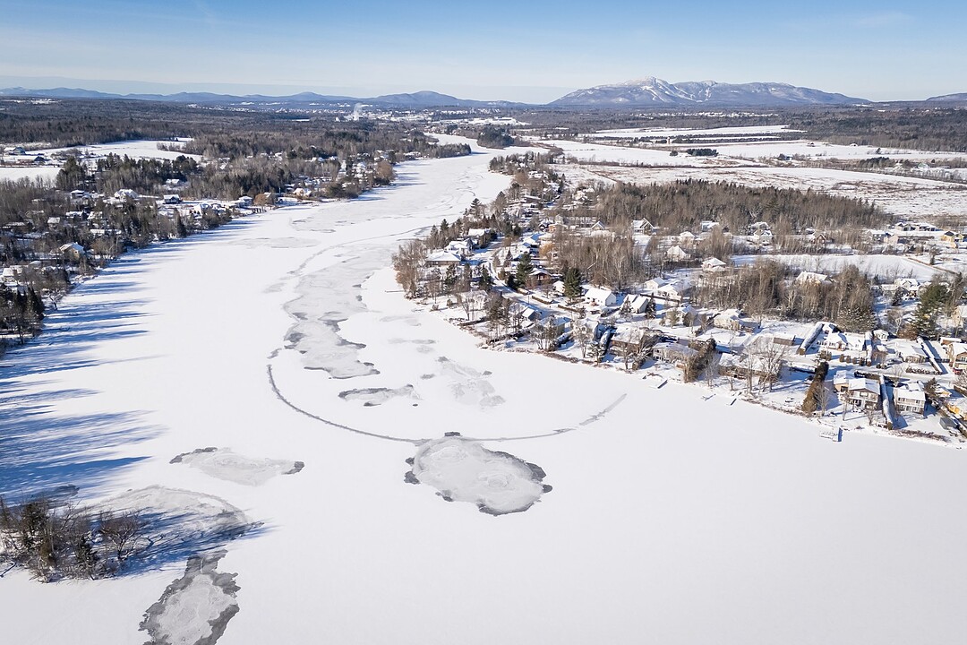 L'aire de vie principale, chaleureuse et conviviale, propose un concept à aire ouverte réunissant un salon agrémenté d'un foyer au bois double face, une salle à manger accueillante et une cuisine avec îlot central. L'ensemble s'ouvre sur une terrasse surplombant l'eau, idéale pour savourer des moments de détente ou recevoir famille et invités dans un décor enchanteur.