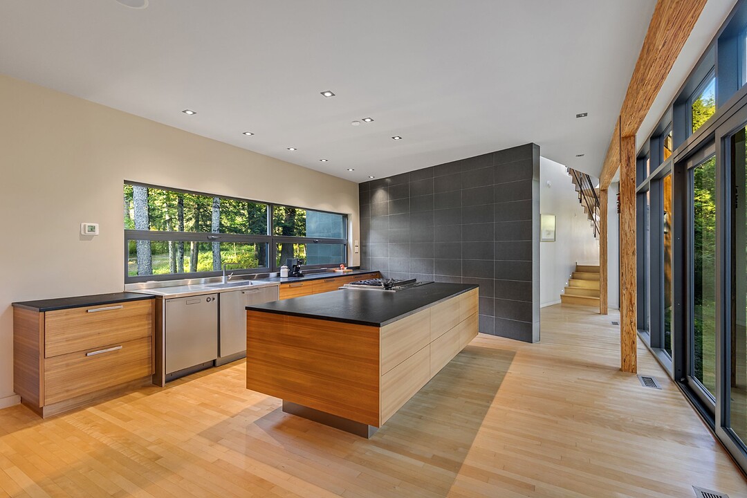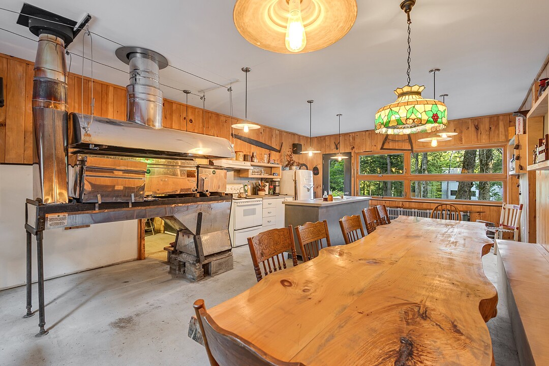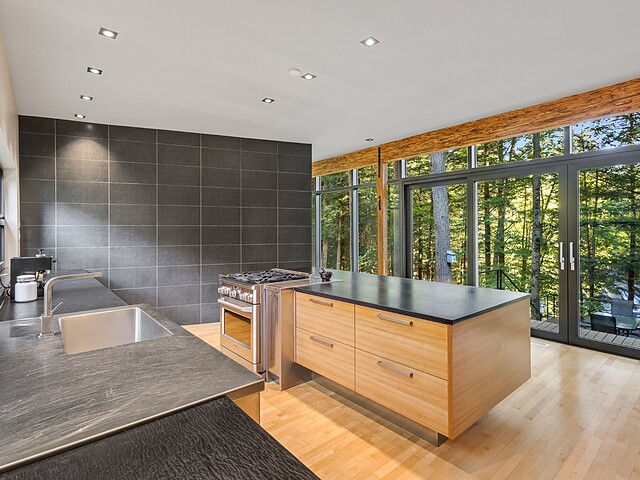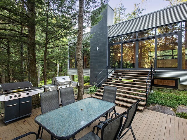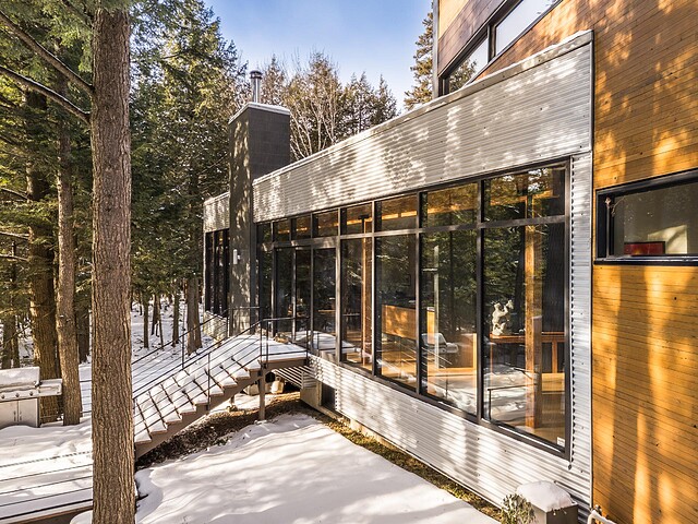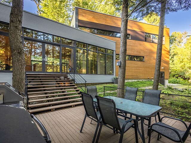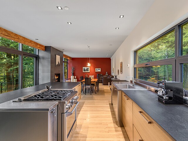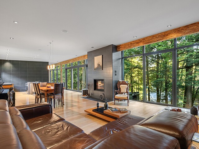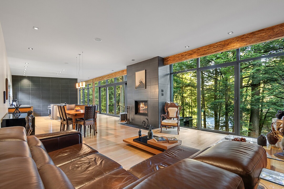L'aire de vie principale, vaste et à aire ouverte, regroupe salon, salle à manger et cuisine autour d'un foyer chaleureux. La fenestration surdimensionnée baigne l'espace de lumière naturelle et donne accès à une terrasse extérieure idéale pour se détendre en pleine nature.