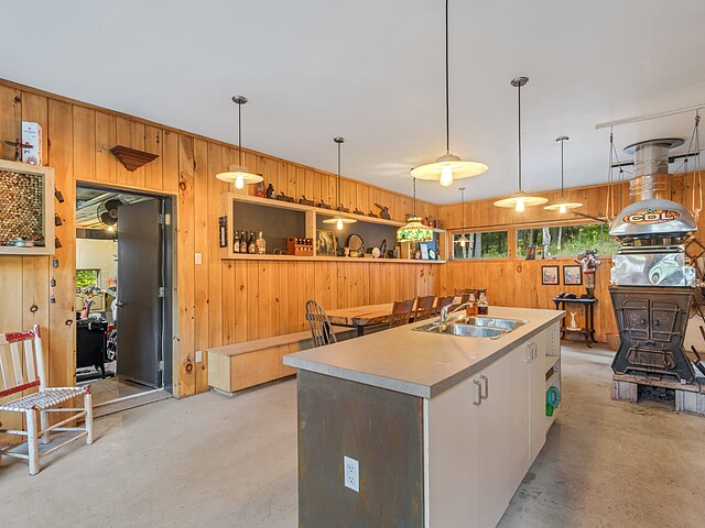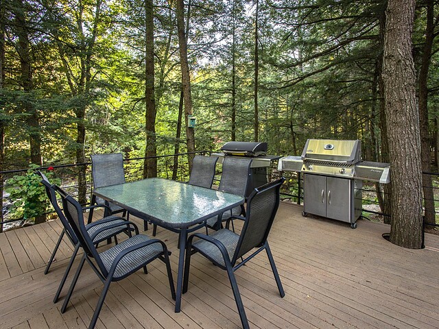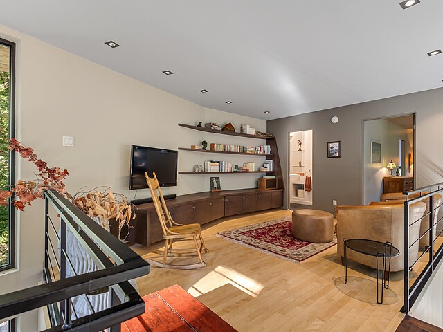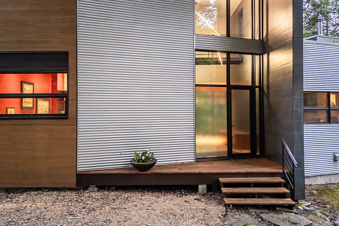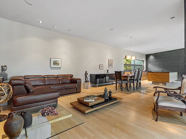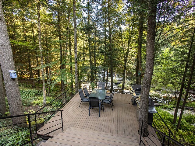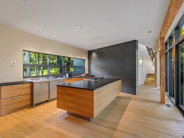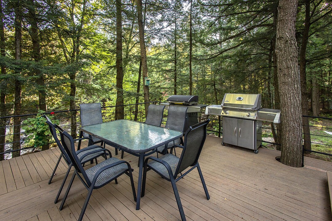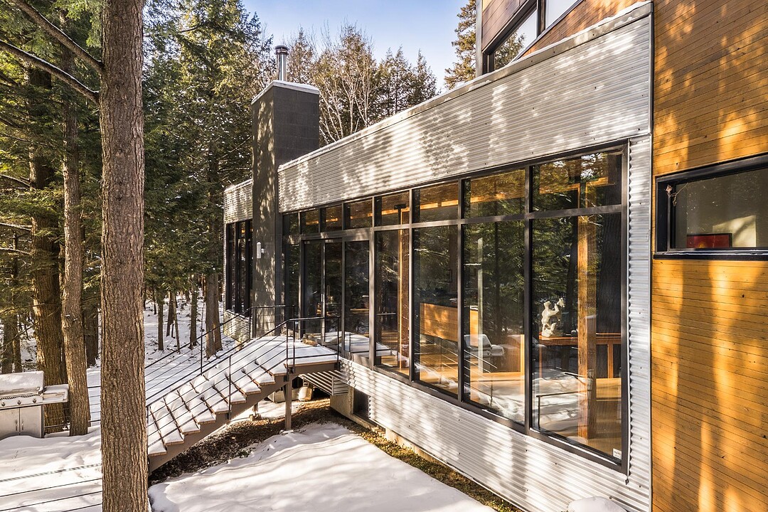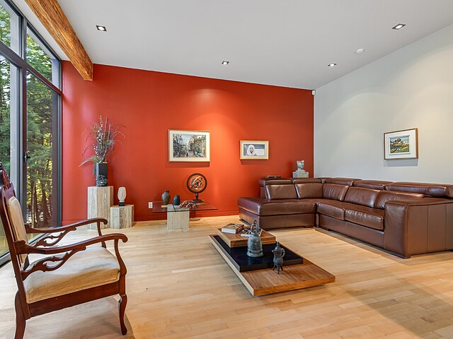 L'aire de vie principale, vaste et à aire ouverte, regroupe salon, salle à manger et cuisine autour d'un foyer chaleureux. La fenestration surdimensionnée baigne l'espace de lumière naturelle et donne accès à une terrasse extérieure idéale pour se détendre en pleine nature.