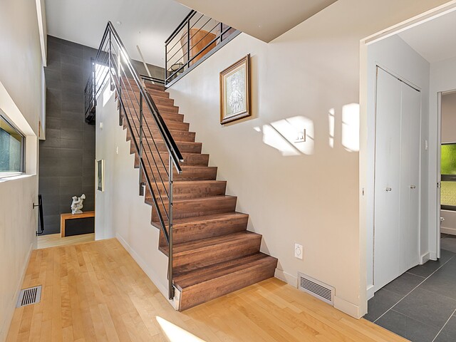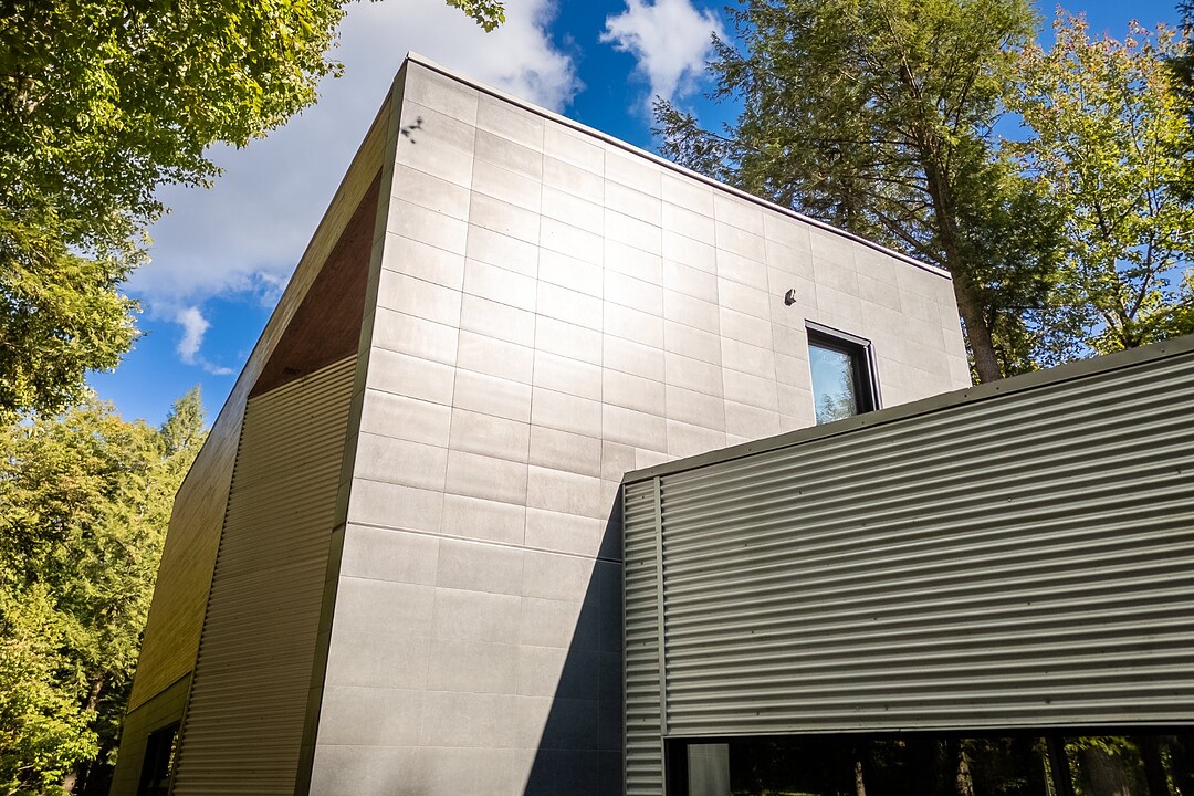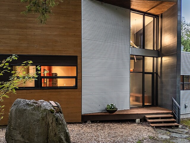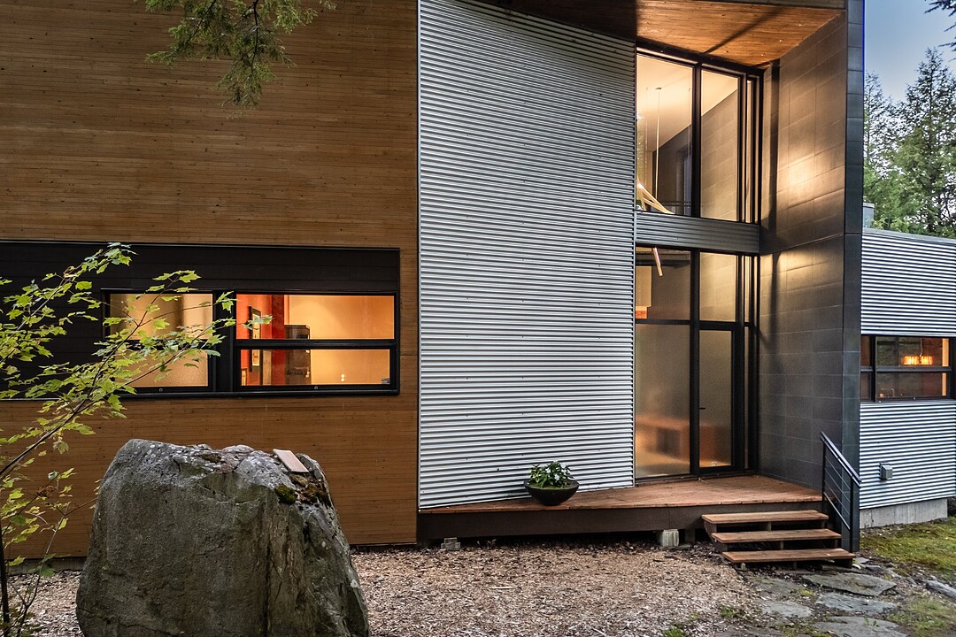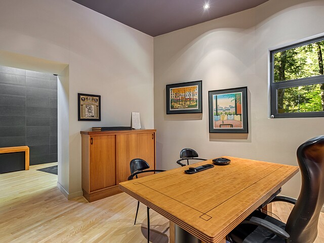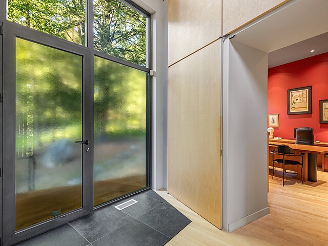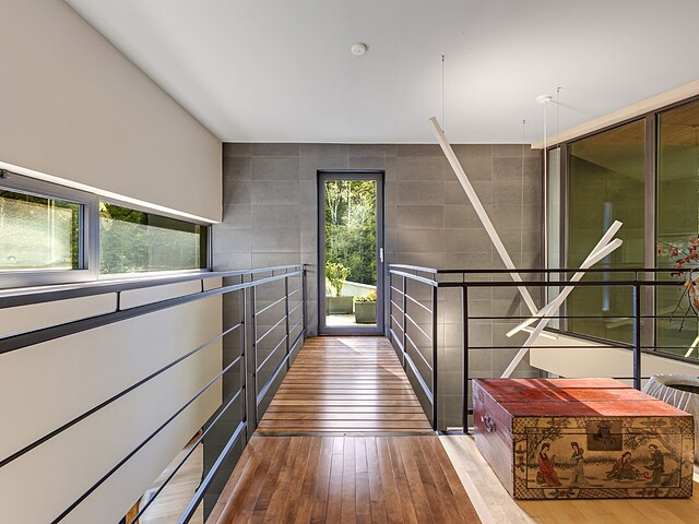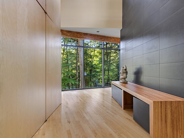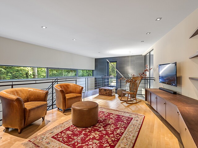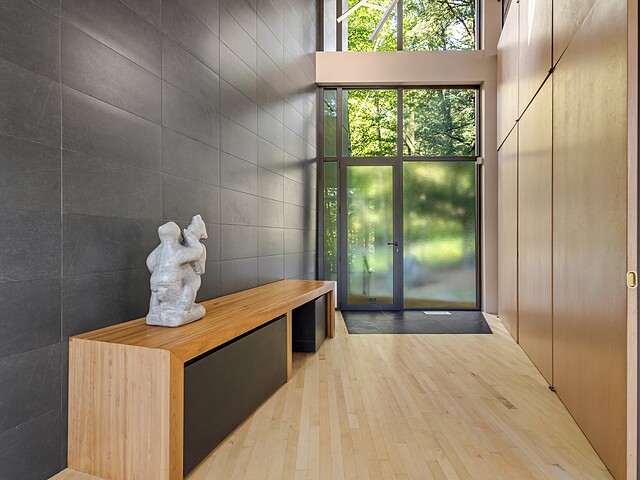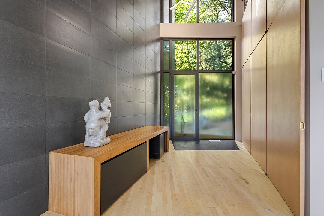 Dès l'entrée, un hall spectaculaire, doté de plafonds de 20 pieds et d'un élégant mur de céramique, s'ouvre sur une vue imprenable de la forêt.