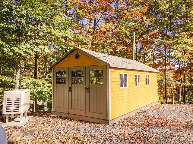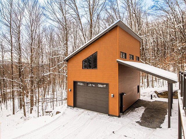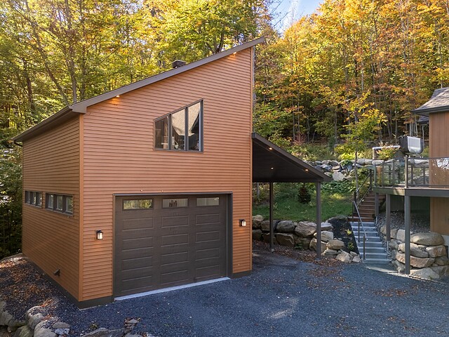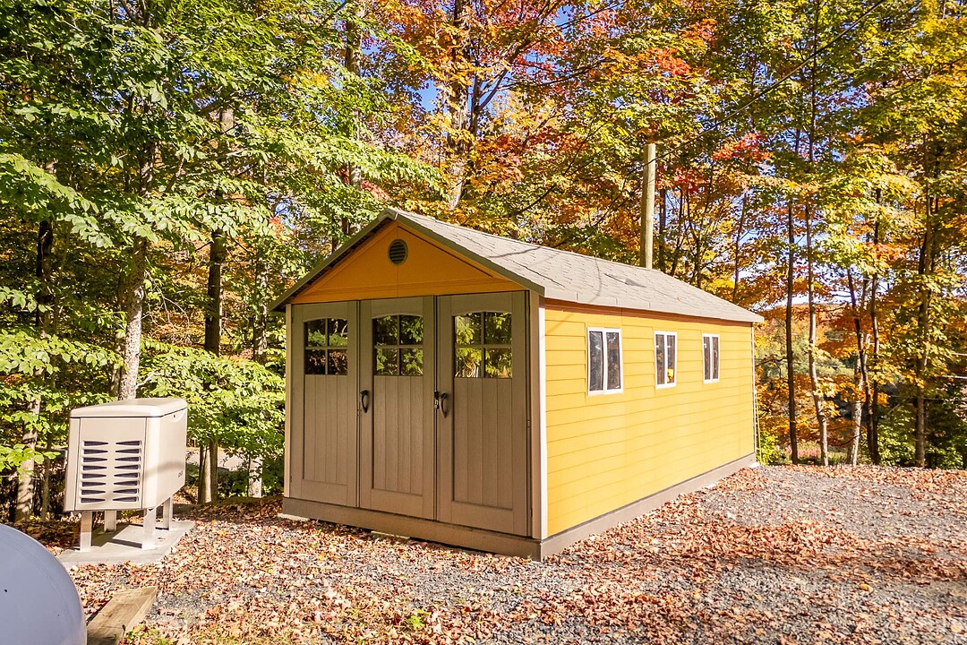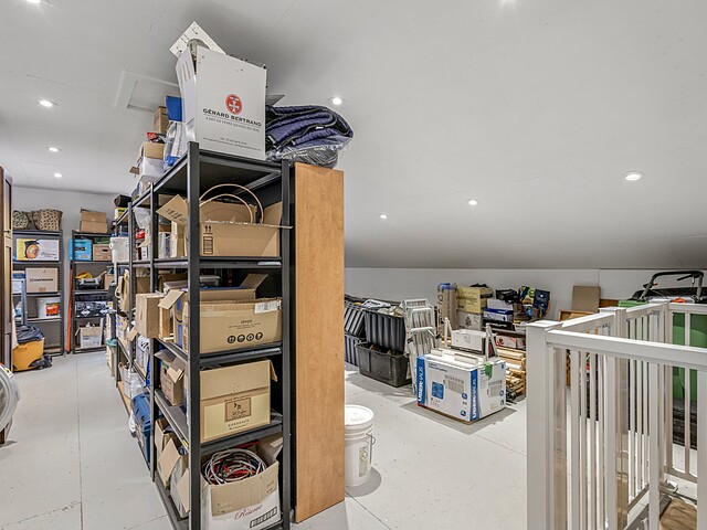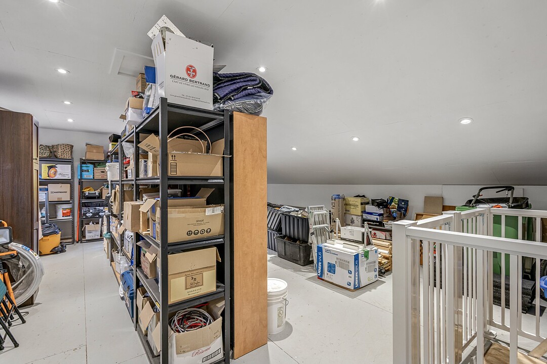 Le garage détaché, chauffé, comprend une mezzanine de rangement avec monte-charge pour faciliter l'organisation. Cet espace pourrait aussi servir d'atelier. De plus,on y retrouve une salle d'eau et une cuve.
