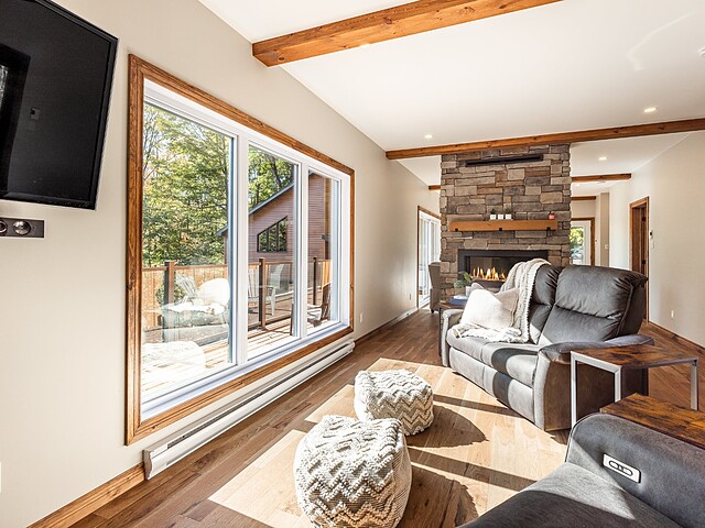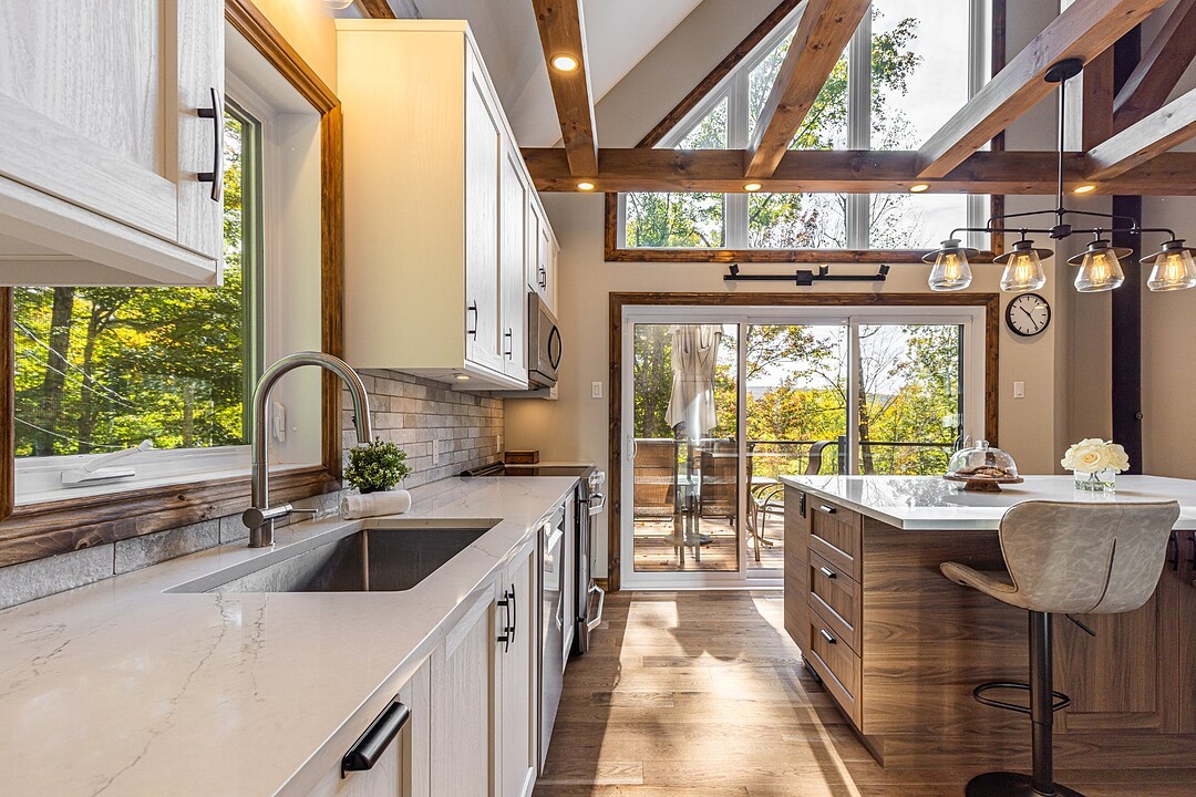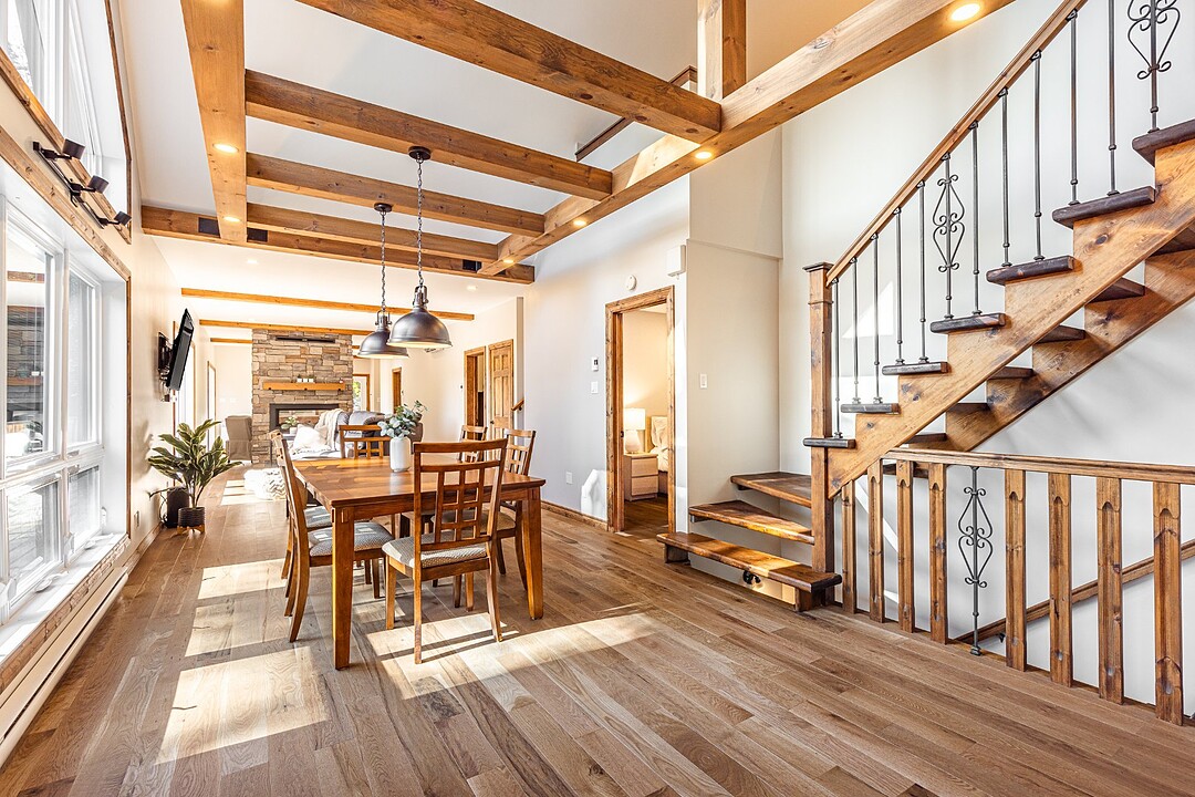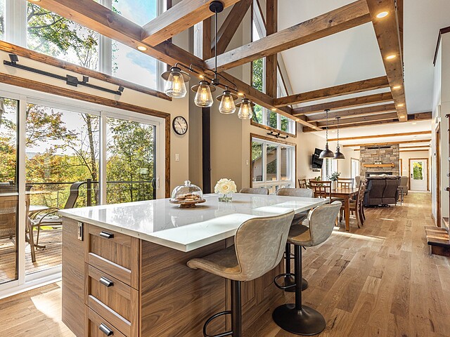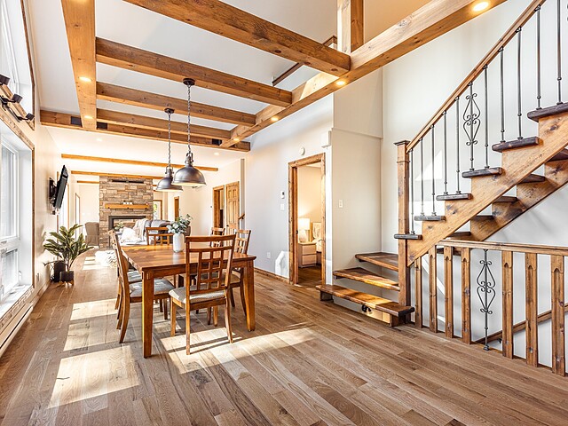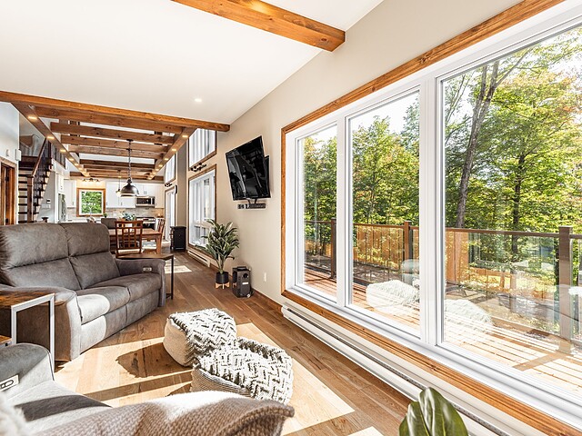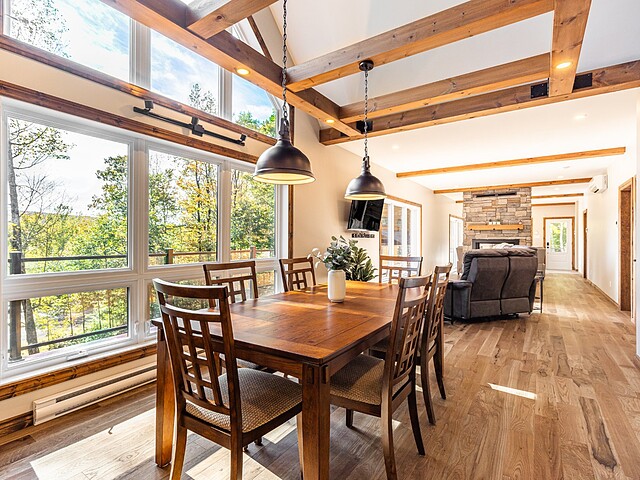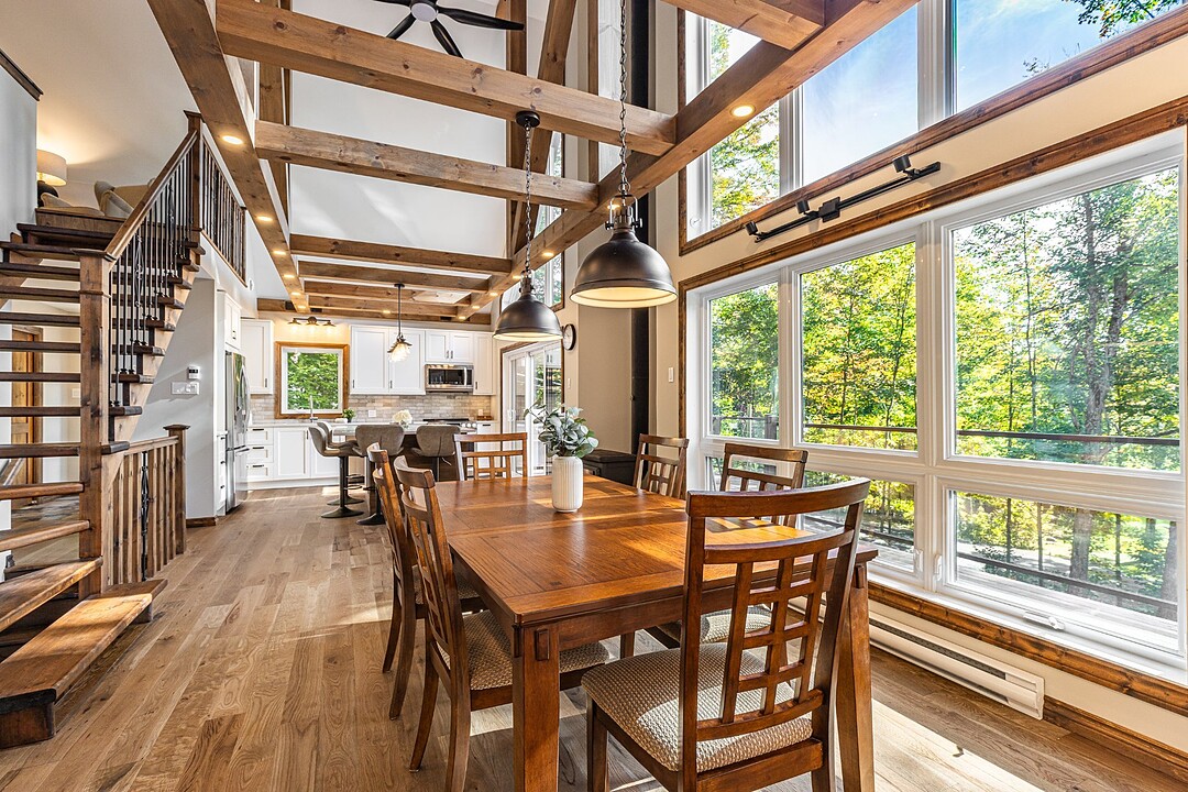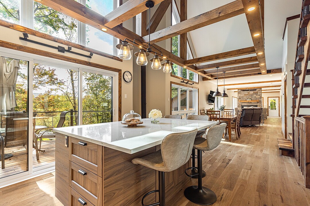 Dès votre arrivée, vous serez épaté par les plafonds cathédrale de plus de 19 pieds, les superbes poutres apparentes et la vue exceptionnelle!