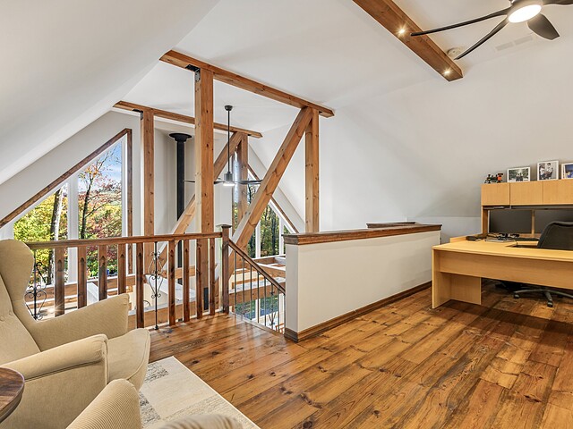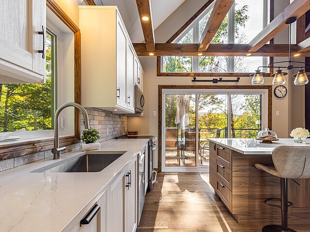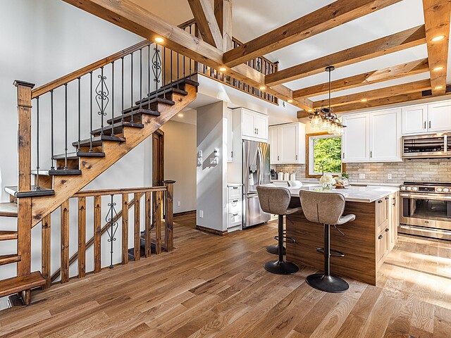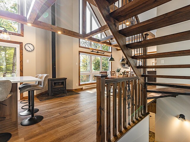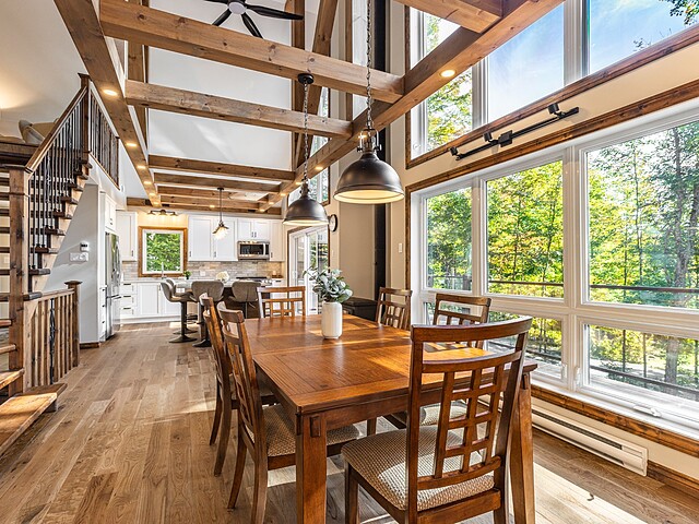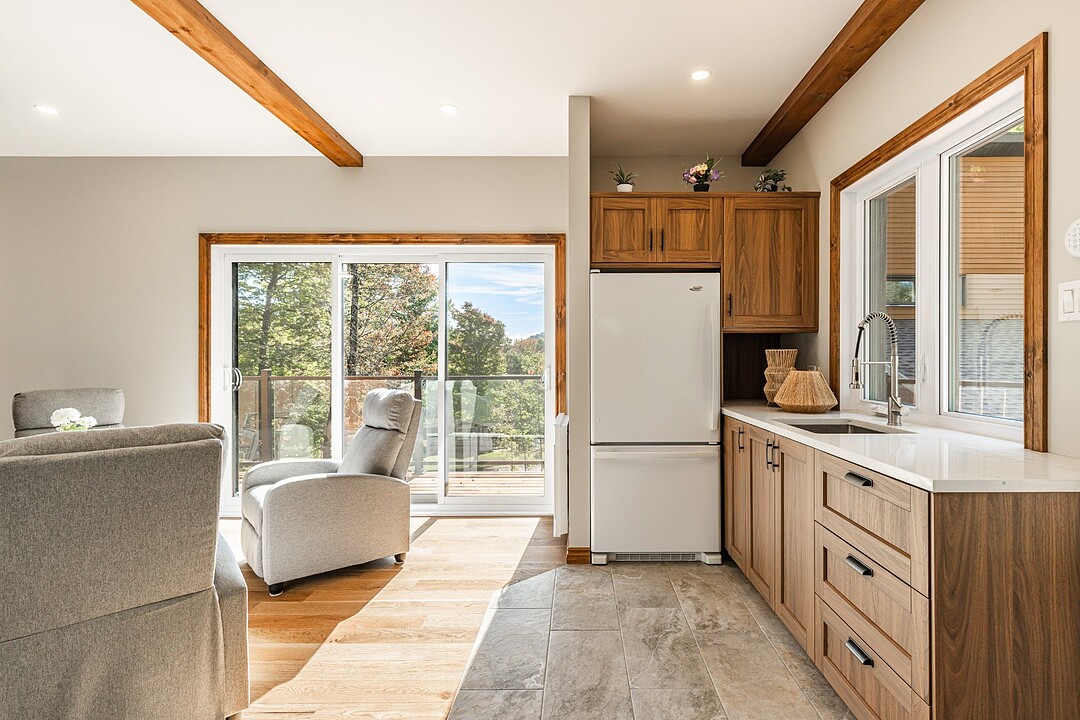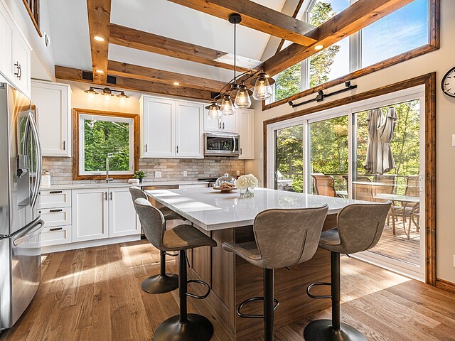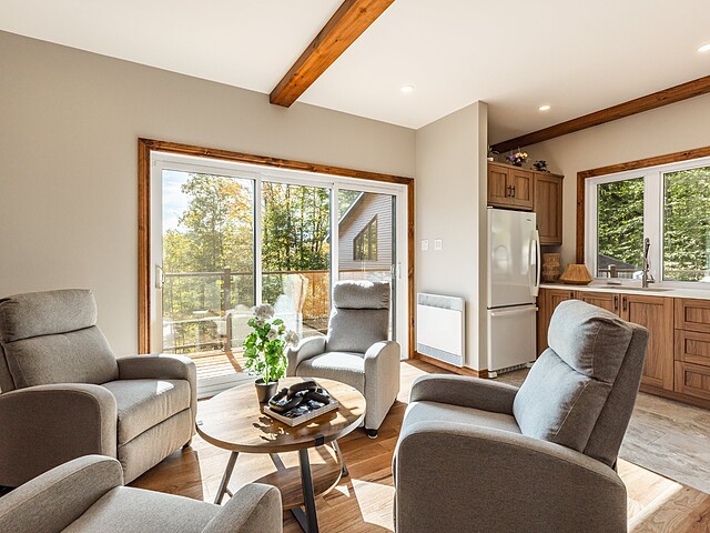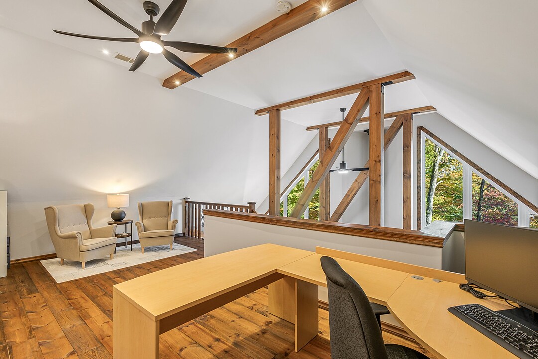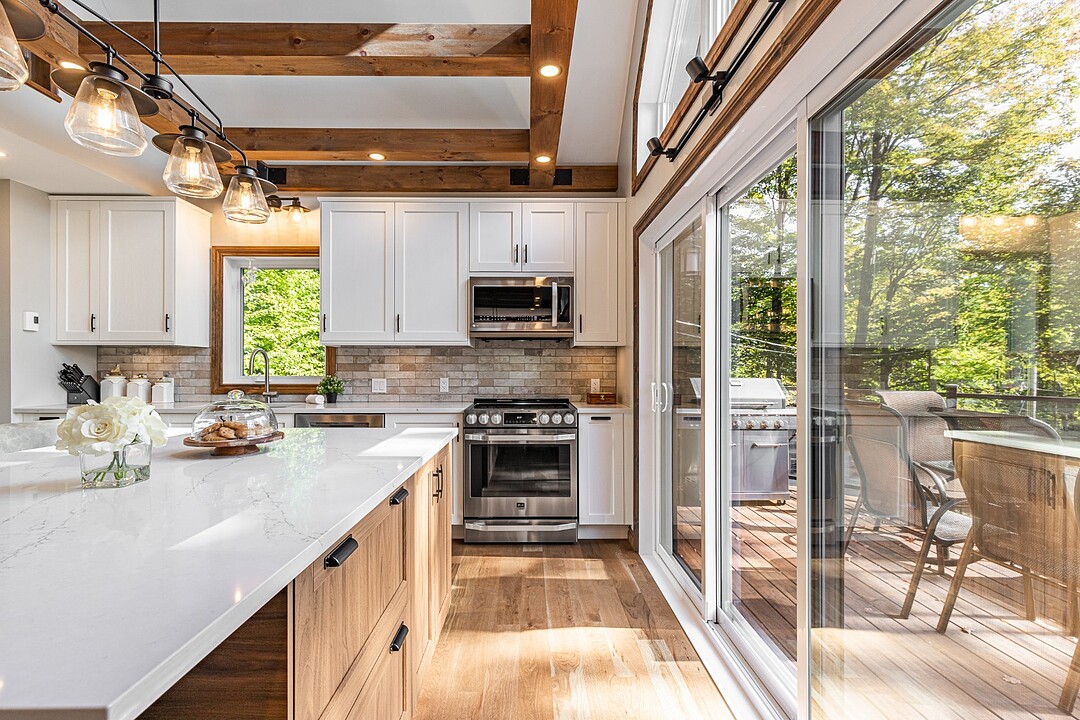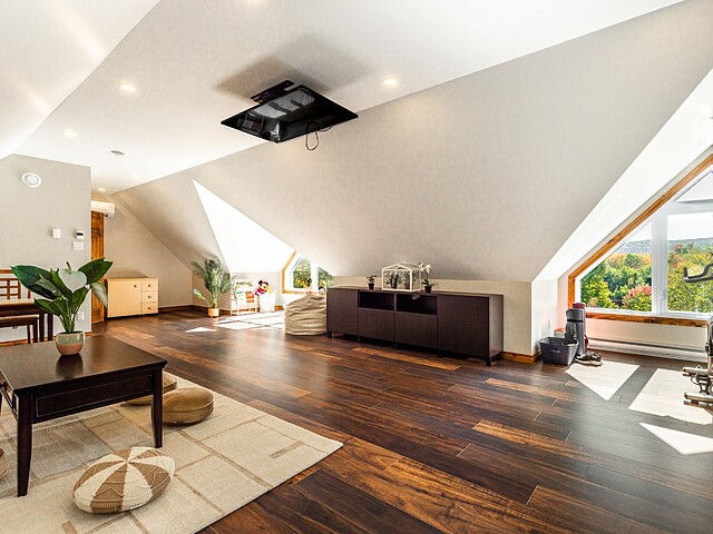 Dès votre arrivée, vous serez épaté par les plafonds cathédrale de plus de 19 pieds, les superbes poutres apparentes et la vue exceptionnelle!