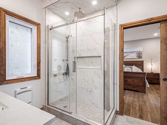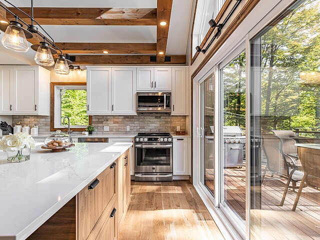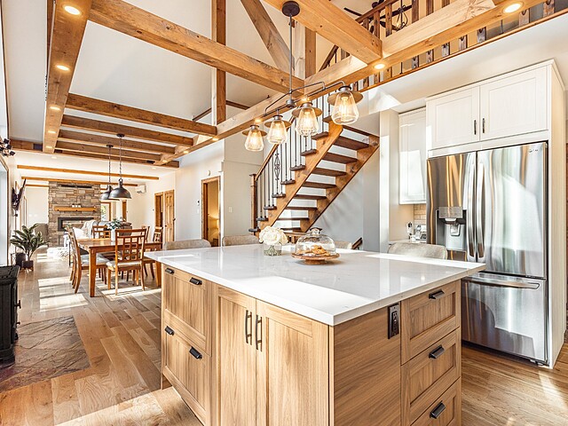 La cuisine, équipée d'un îlot central avec comptoir en quartz, de planchers chauffants et d'un garde-manger walk-in, allie élégance et praticité.