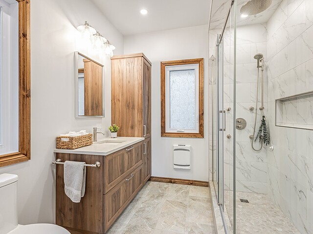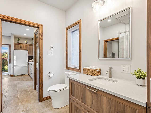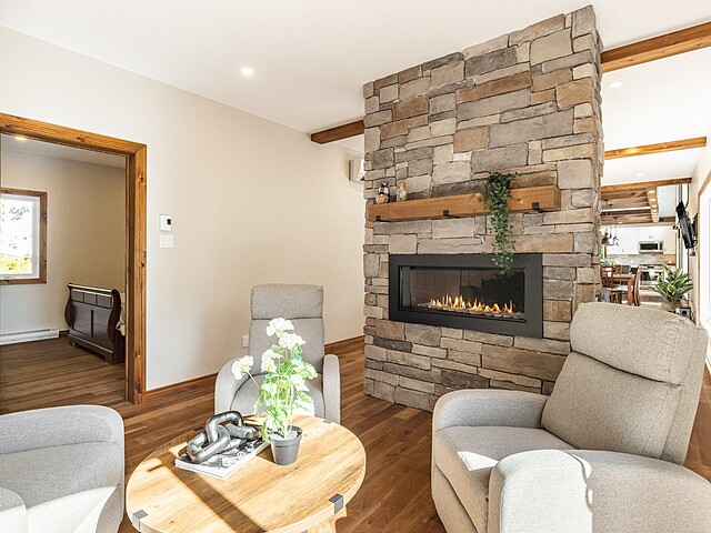 Sur ce même niveau, vous trouverez une seconde salle de bain, un espace boudoir avec foyer au gaz double-face, ainsi qu'un coin dinette avec évier et réfrigérateur.Possibilité de créer un espace bigénération!