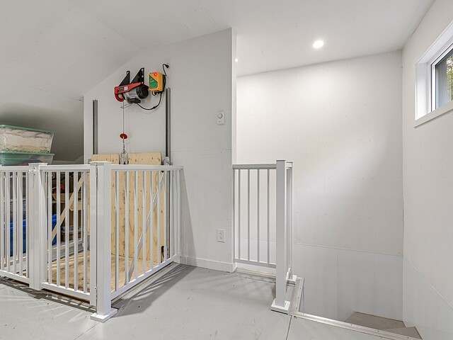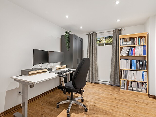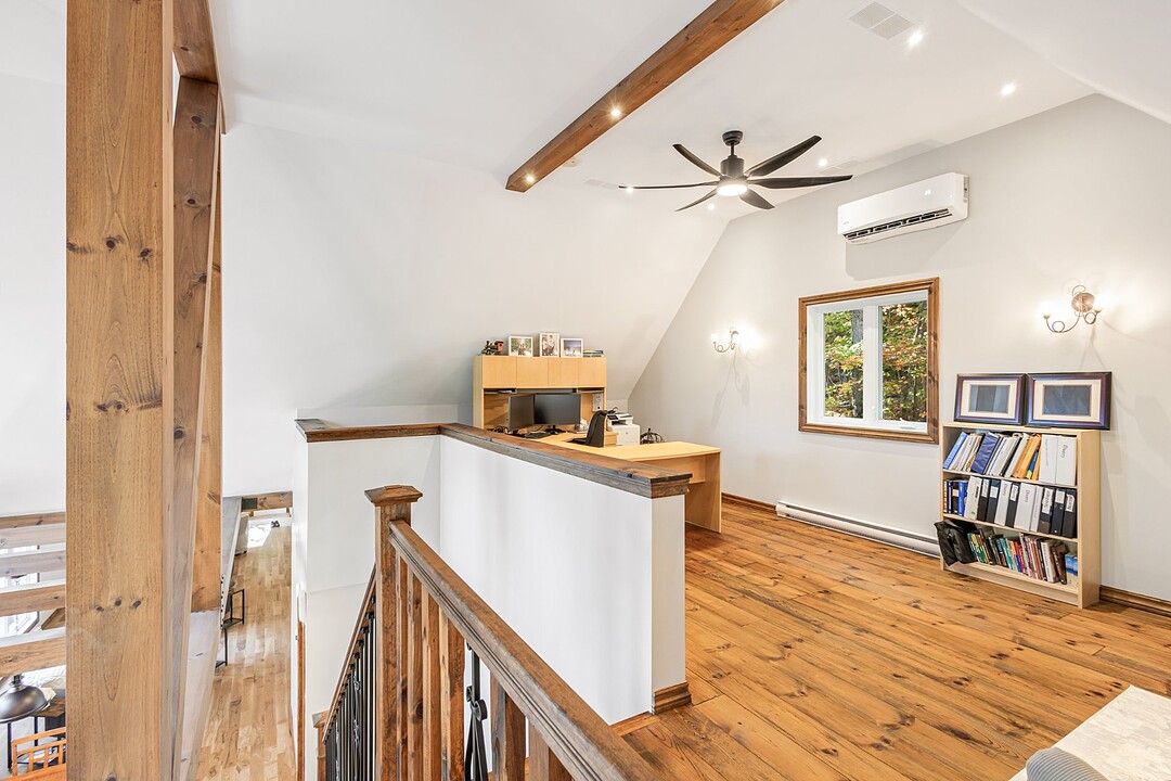 Le deuxième étage est réparti en deux grandes sections:une salle de jeux avec un espace d'entraînement et une mezzanine avec bureau pouvant être convertie en 5e chambre.