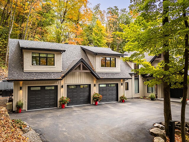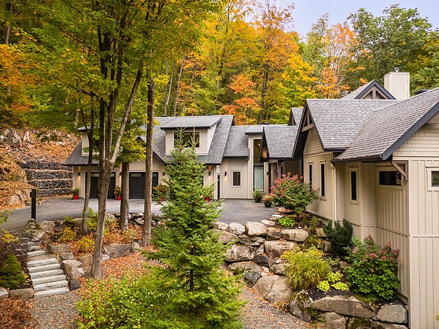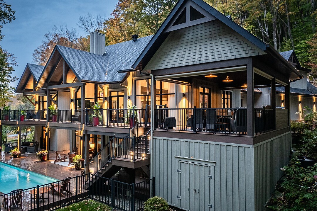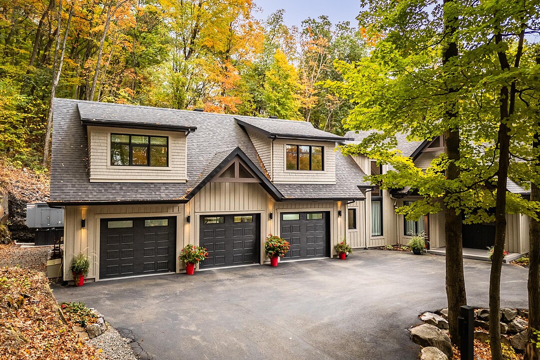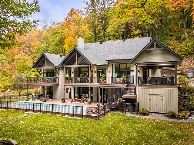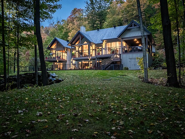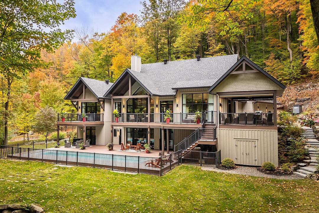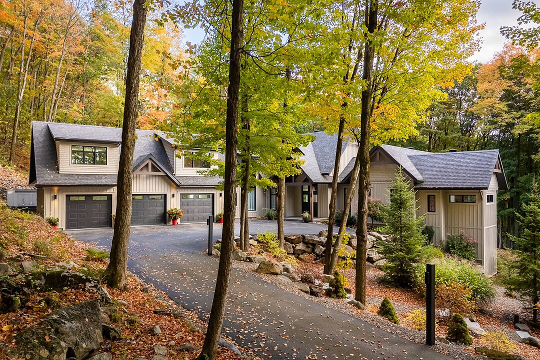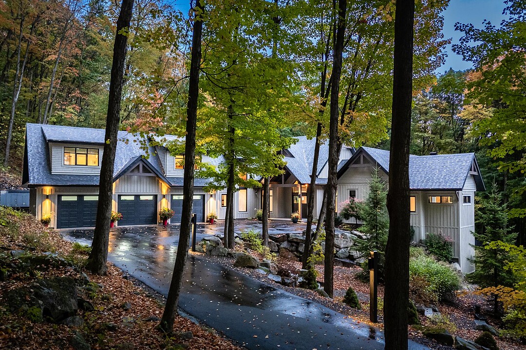 Nichée à flanc de montagne sur un terrain boisé de plus de 6,4 acres, cette vaste propriété contemporaine allie design, confort et prestige! Répartie sur trois étages, elle offre quatre chambres avec salles de bain attenantes, un bureau, des salons chaleureux, un cinéma maison, un cellier et bien plus encore! L'aire de vie principale se distingue par ses poutres apparentes, ses plafonds cathédrales, son foyer et sa fenestration majestueuse. Le terrain, magnifiquement paysager, avec terrasses, piscine creusée, garage triple et remises, complète ce cadre d'exception. Somptueuse propriété située au coeur de la nature à proximité des commodités!