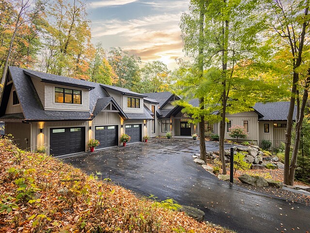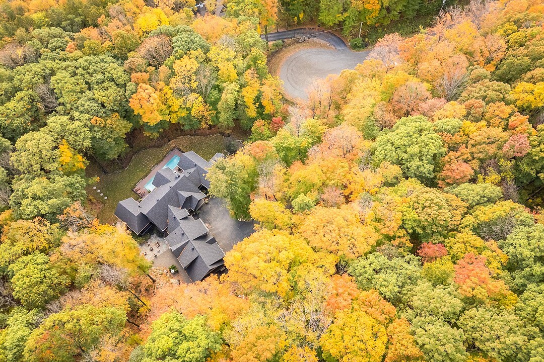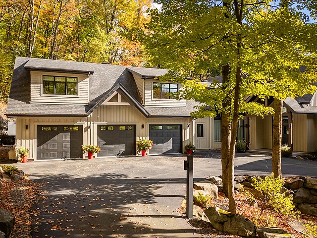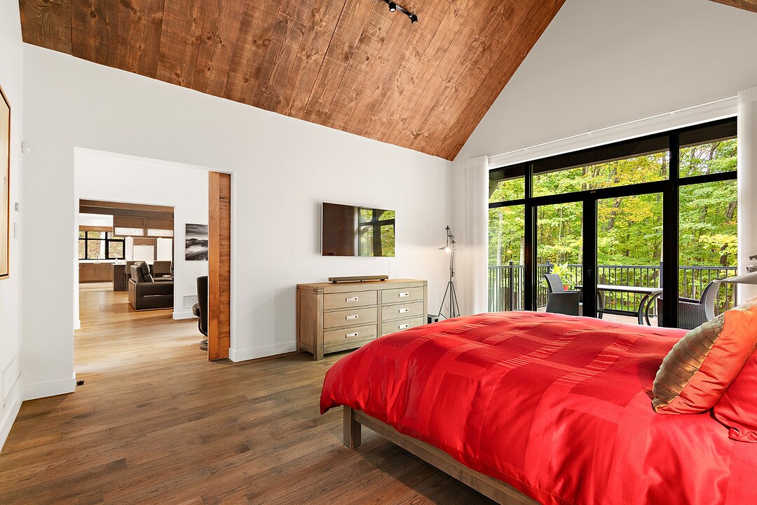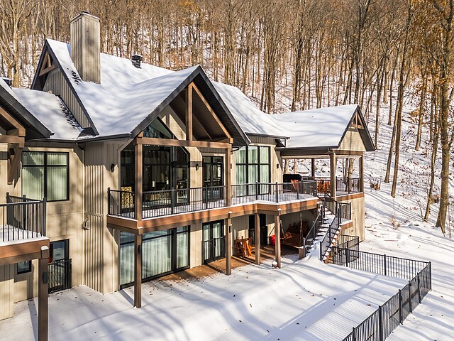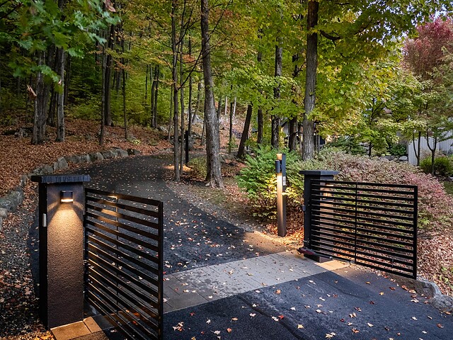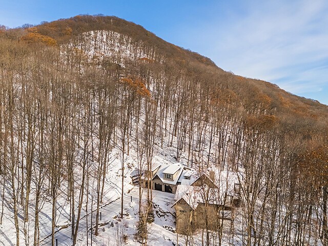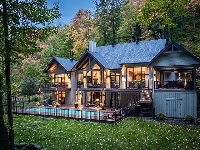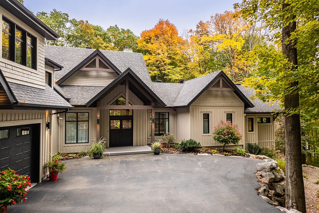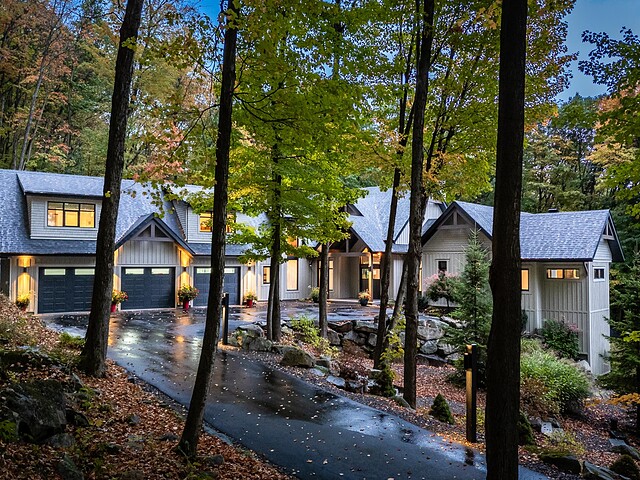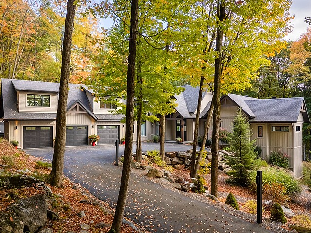 Nichée à flanc de montagne sur un terrain boisé de plus de 6,4 acres, cette vaste propriété contemporaine allie design, confort et prestige! Répartie sur trois étages, elle offre quatre chambres avec salles de bain attenantes, un bureau, des salons chaleureux, un cinéma maison, un cellier et bien plus encore! L'aire de vie principale se distingue par ses poutres apparentes, ses plafonds cathédrales, son foyer et sa fenestration majestueuse. Le terrain, magnifiquement paysager, avec terrasses, piscine creusée, garage triple et remises, complète ce cadre d'exception. Somptueuse propriété située au coeur de la nature à proximité des commodités!