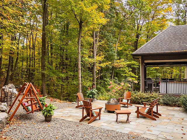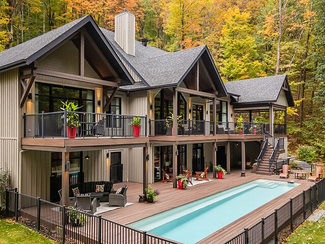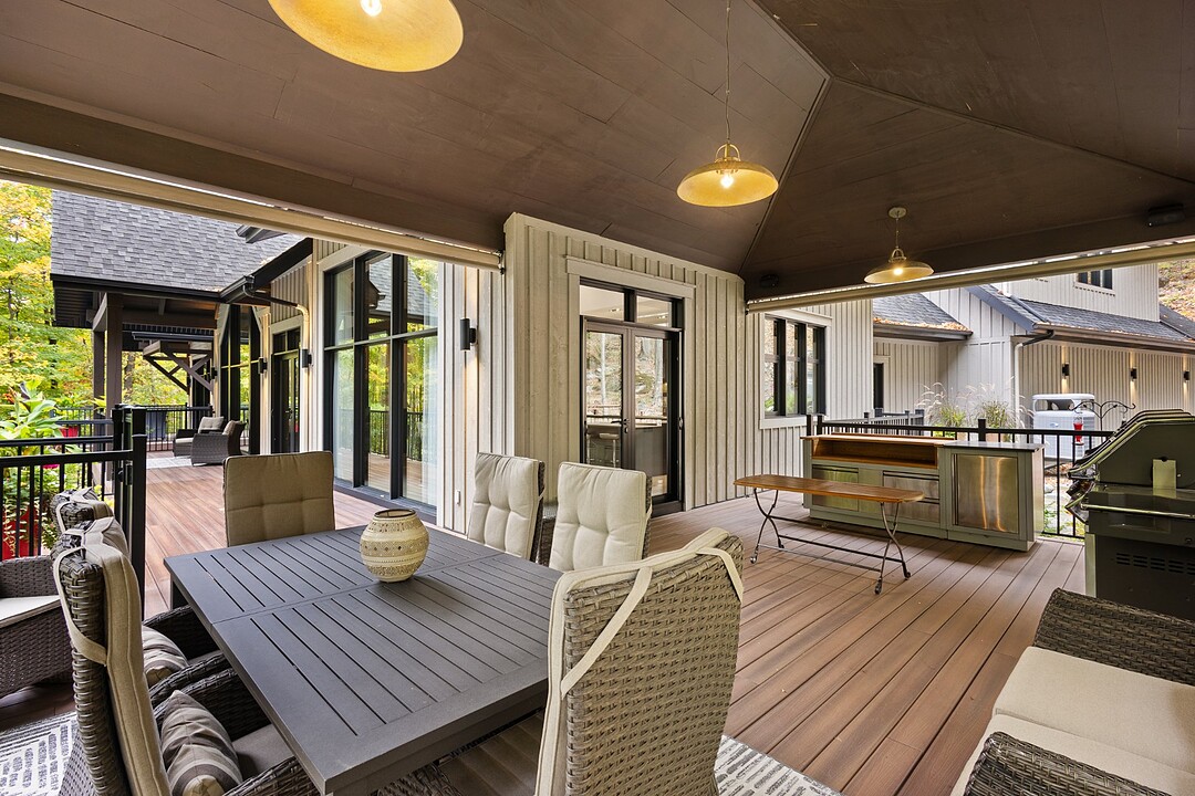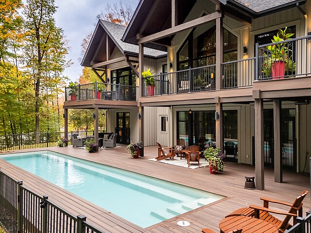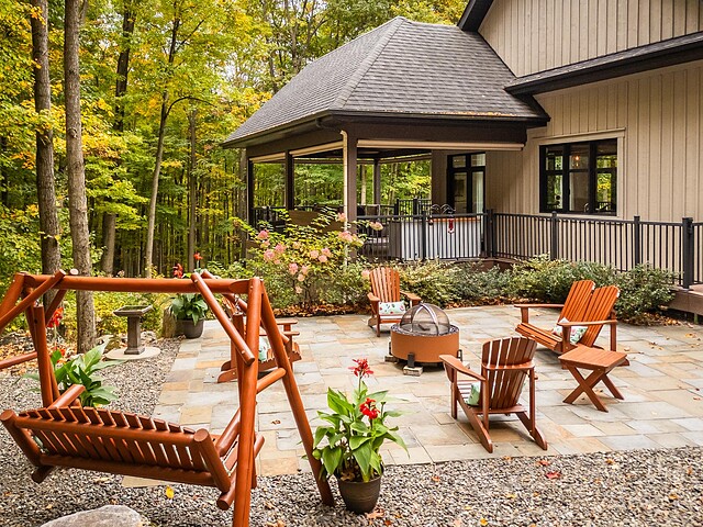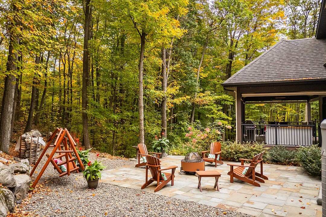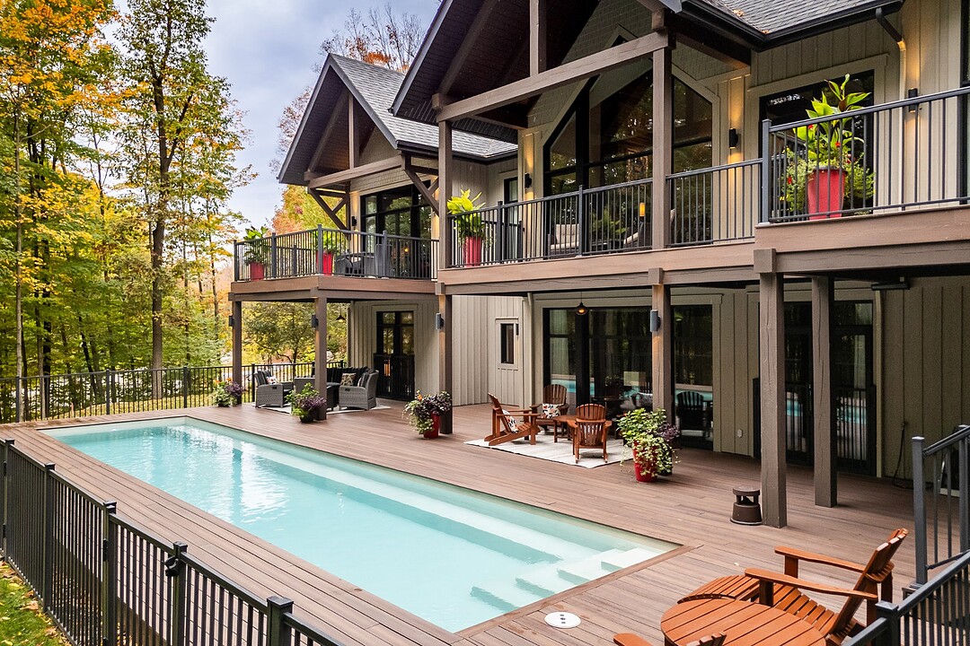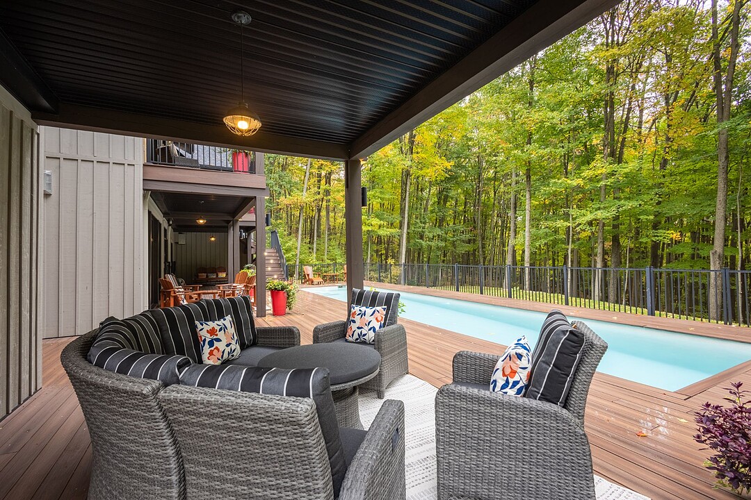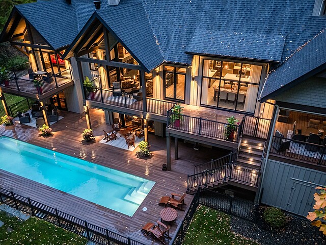 Le terrain magnifiquement aménagé offre plusieurs terrasses couvertes avec revêtement en composite ne nécessitant aucun entretien, une piscine creusée et un espace détente autour du feu - parfait pour profiter de la nature en toute saison.
