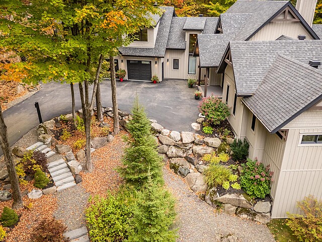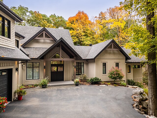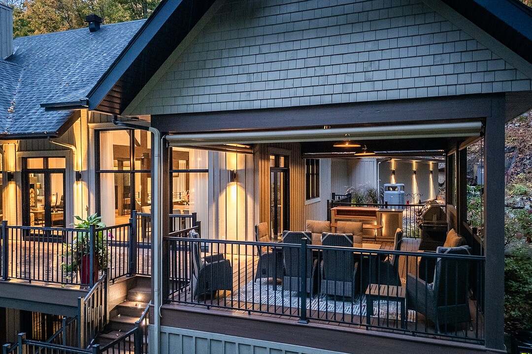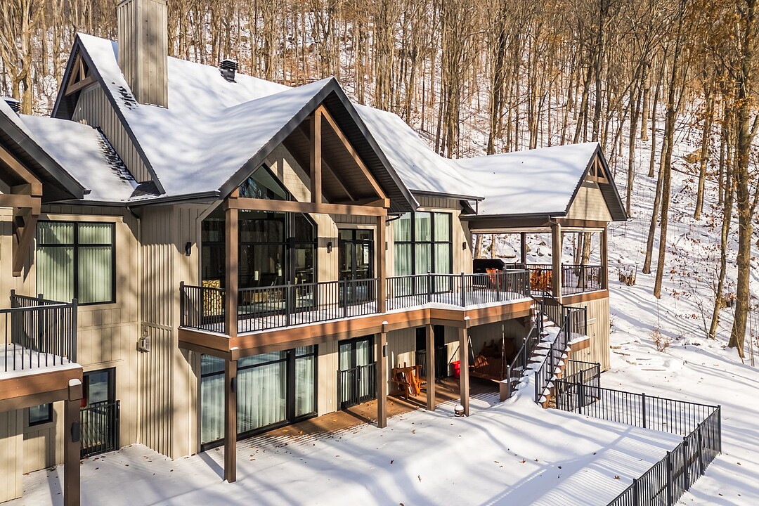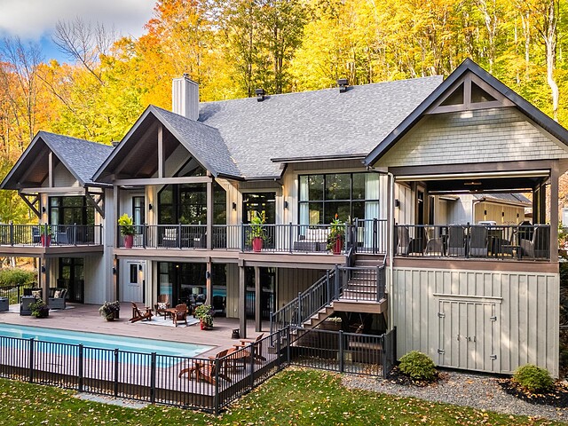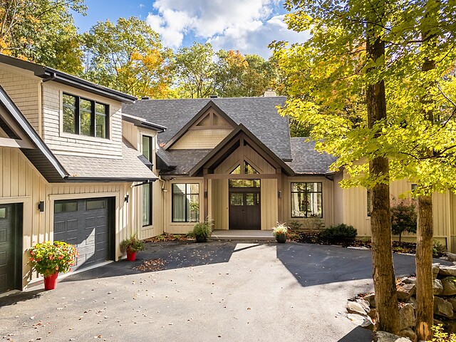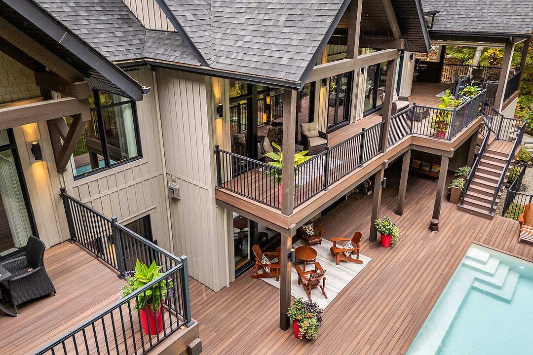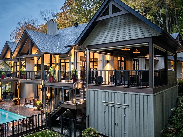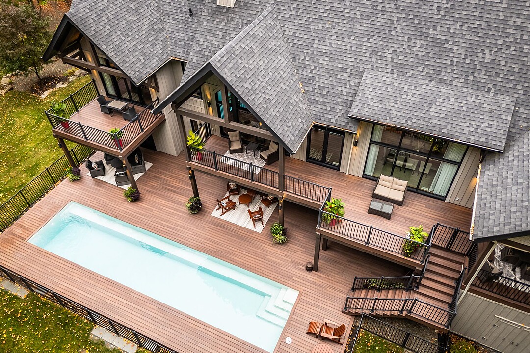 Le terrain magnifiquement aménagé offre plusieurs terrasses couvertes avec revêtement en composite ne nécessitant aucun entretien, une piscine creusée et un espace détente autour du feu - parfait pour profiter de la nature en toute saison.