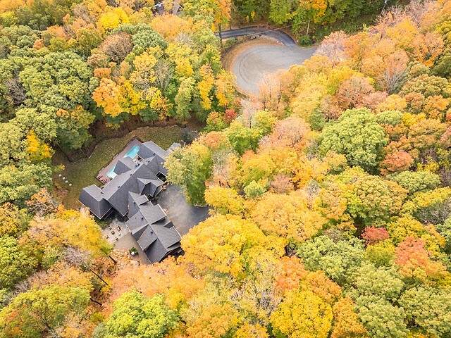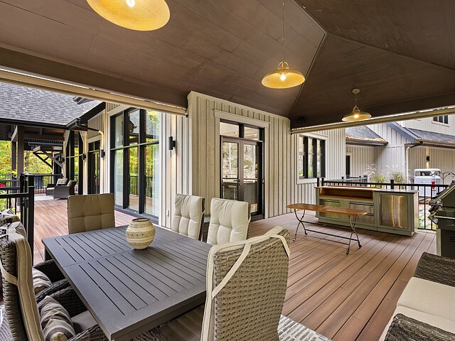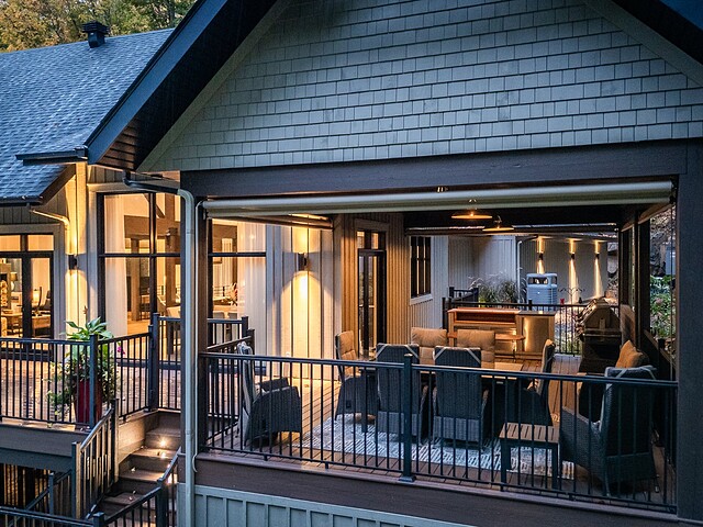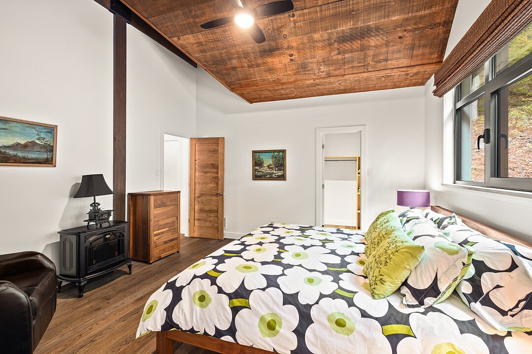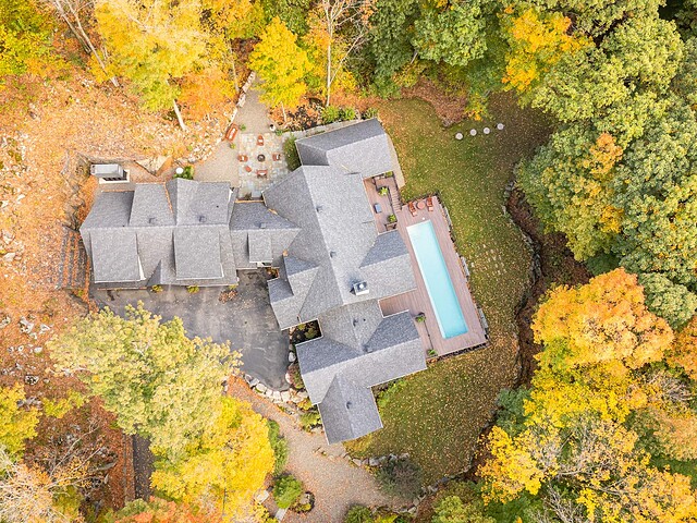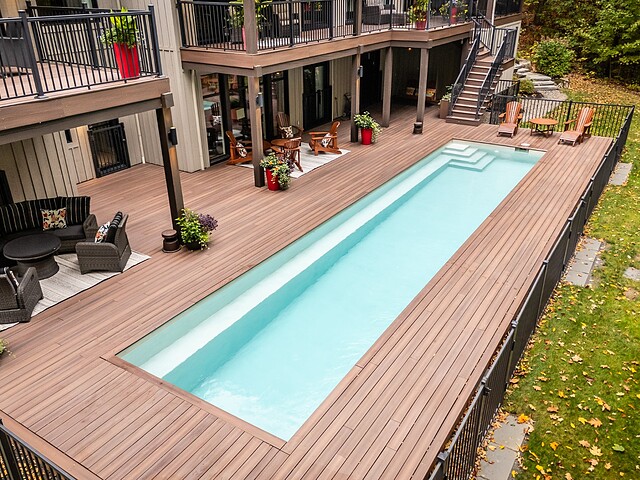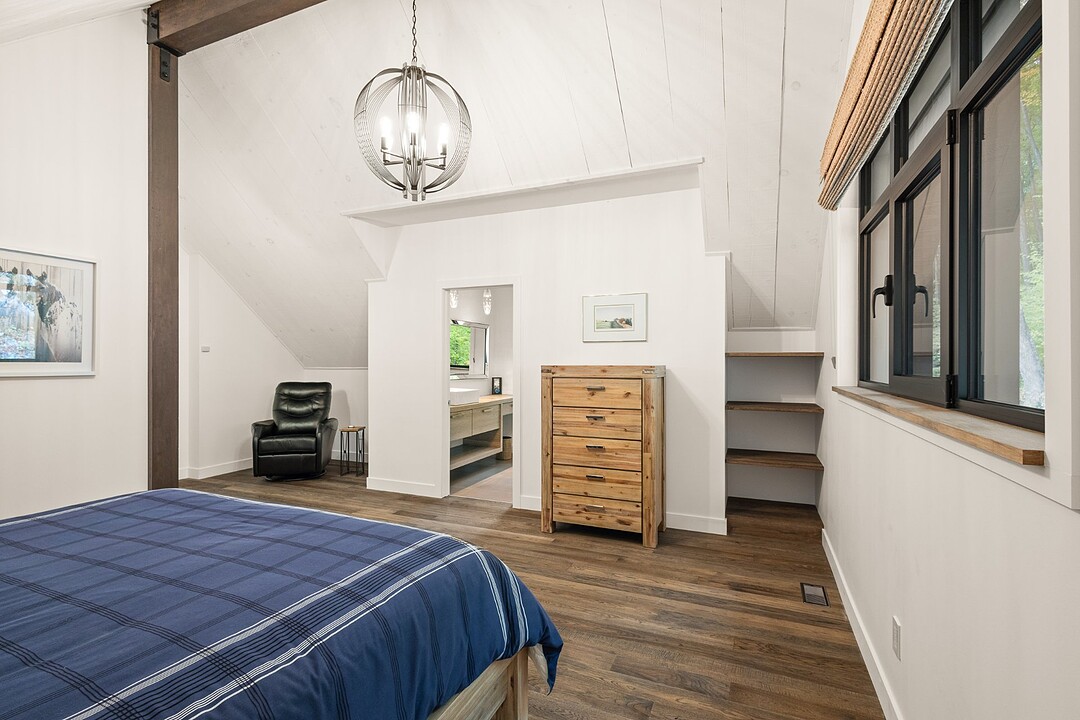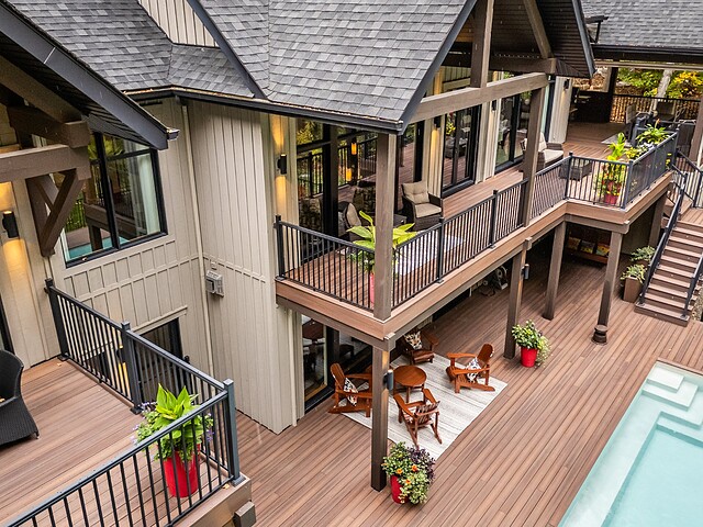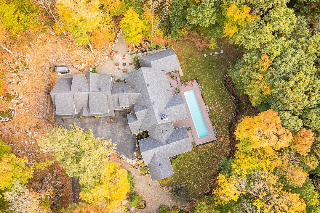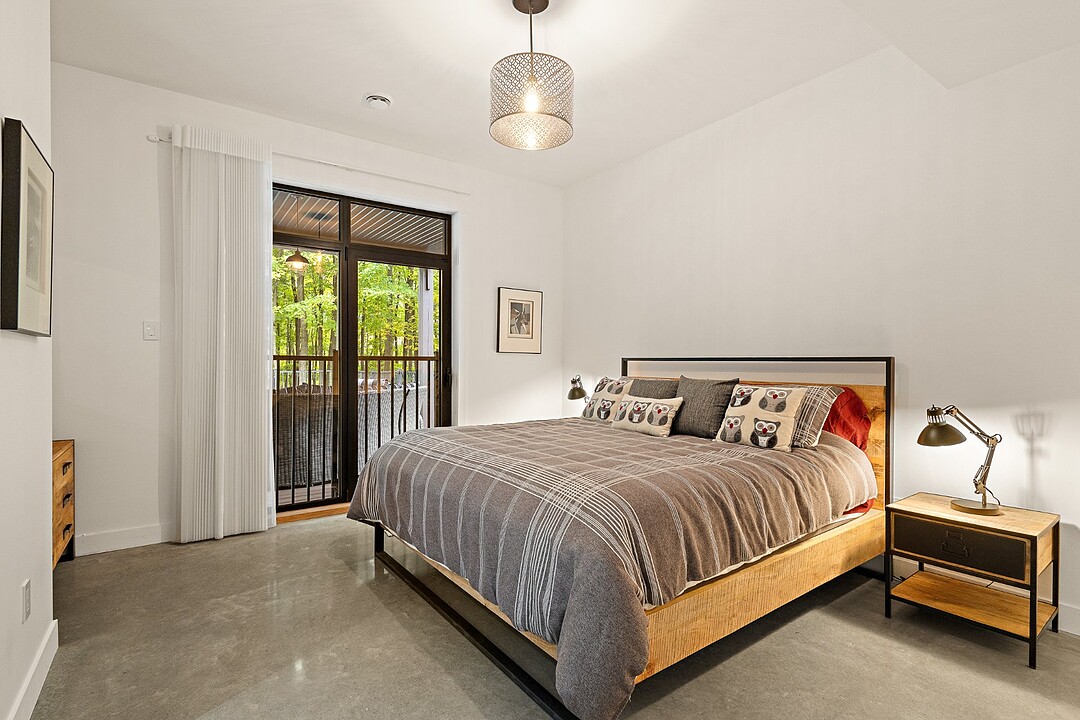 Le terrain magnifiquement aménagé offre plusieurs terrasses couvertes avec revêtement en composite ne nécessitant aucun entretien, une piscine creusée et un espace détente autour du feu - parfait pour profiter de la nature en toute saison.