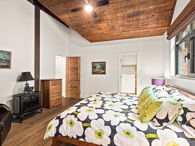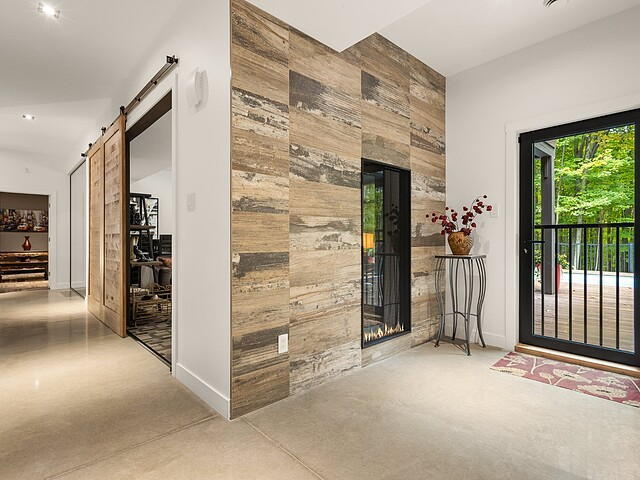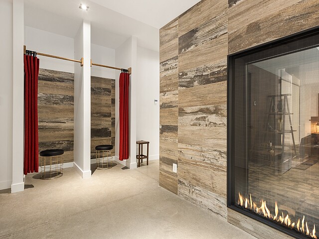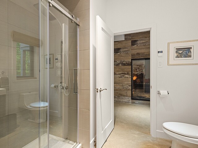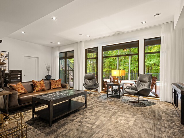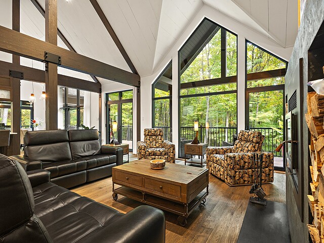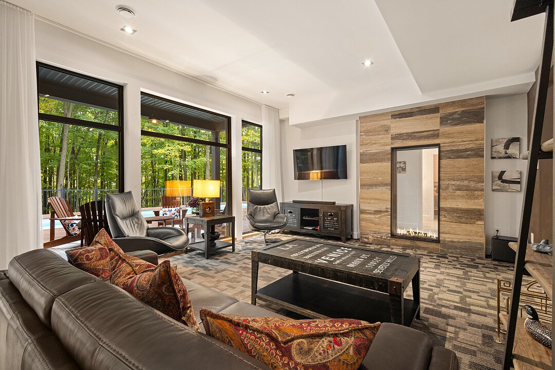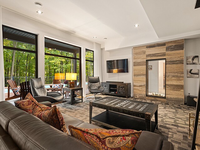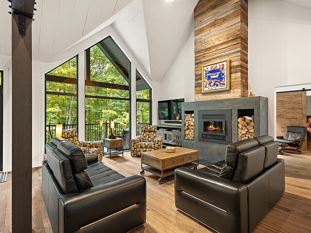 L'aire de vie principale se distingue par son foyer à combustion lente et sa vue omniprésente sur la nature, offrant une atmosphère chaleureuse et conviviale.