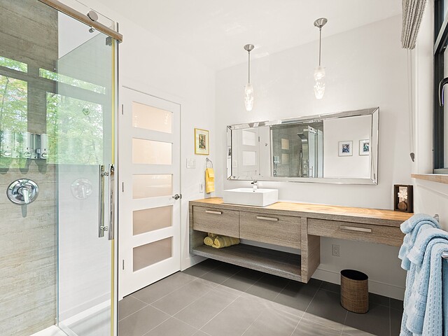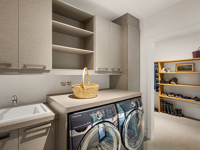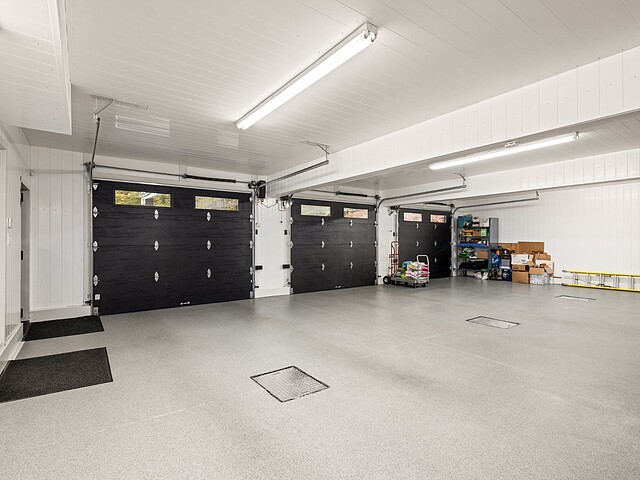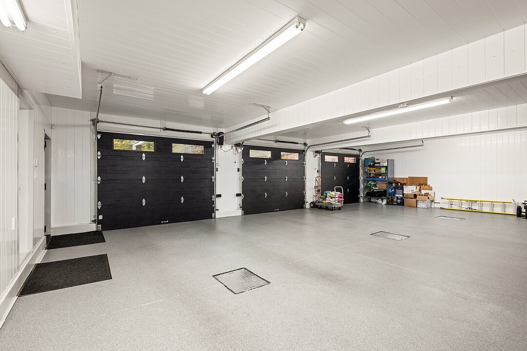 Pour un maximum de fonctionnalité, la propriété dispose d'une grande entrée secondaire avec salle de lavage, d'un garage attenant triple, d'une vaste remise intégrée à la terrasse, ainsi que d'un garage pour les équipements de piscine.
