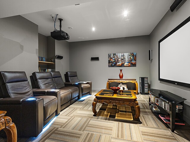 Au RDJ, vous découvrirez des espaces de vie généreux comprenant une salle familiale (anciennement un gym, reconvertible), un cinéma maison, un bureau, un magnifique cellier et un accès direct à la terrasse et à la piscine.