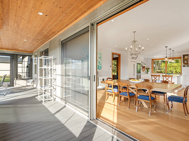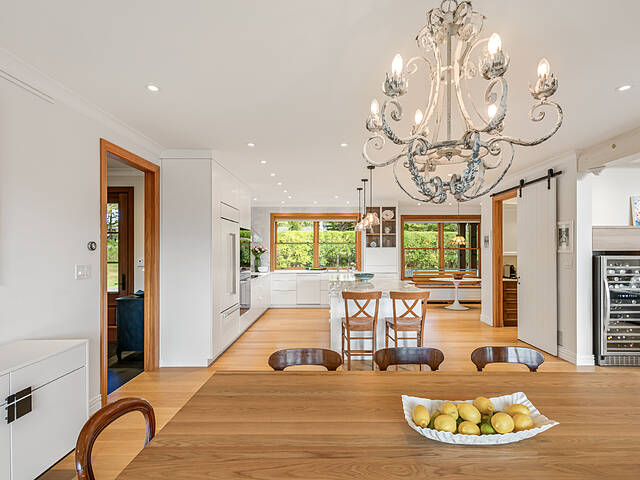 La vaste salle à manger s’ouvre sur une véranda grillagée ainsi que sur la cuisine, dotée d’un îlot central en porcelaine et d’un espace convivial idéal pour recevoir.