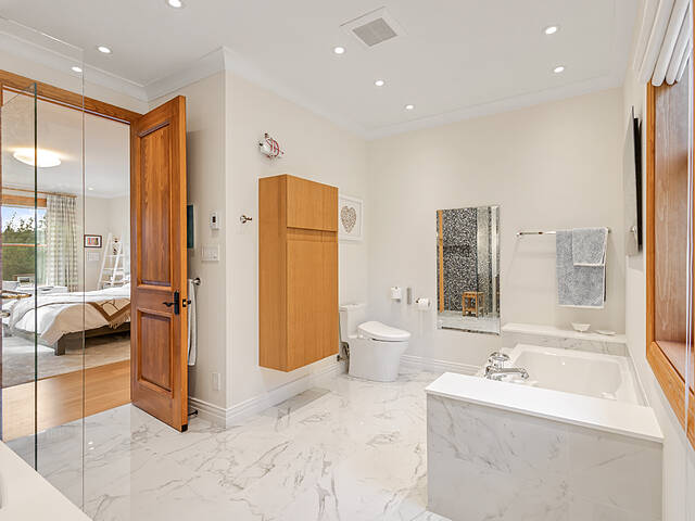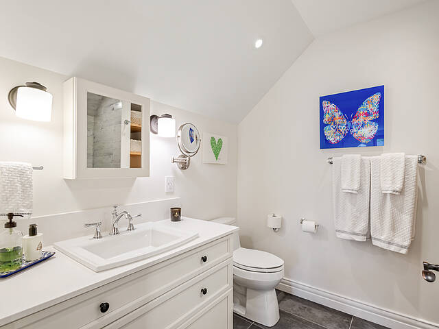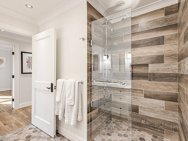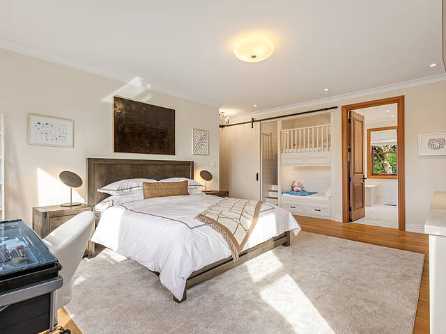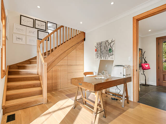 Le rez-de-chaussée comprend également une autre chambre spacieuse, une salle de bain complète, un bureau lumineux et une entrée secondaire menant directement au garage intégré.