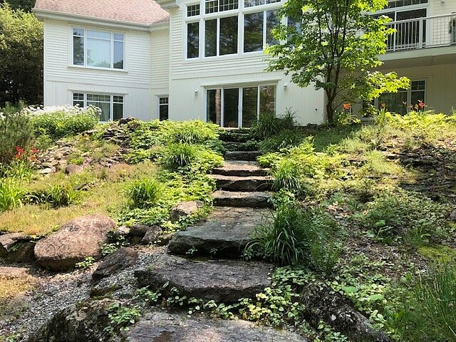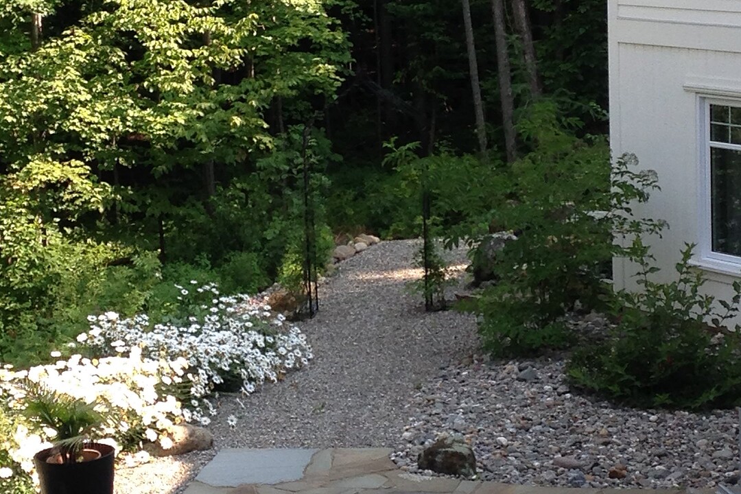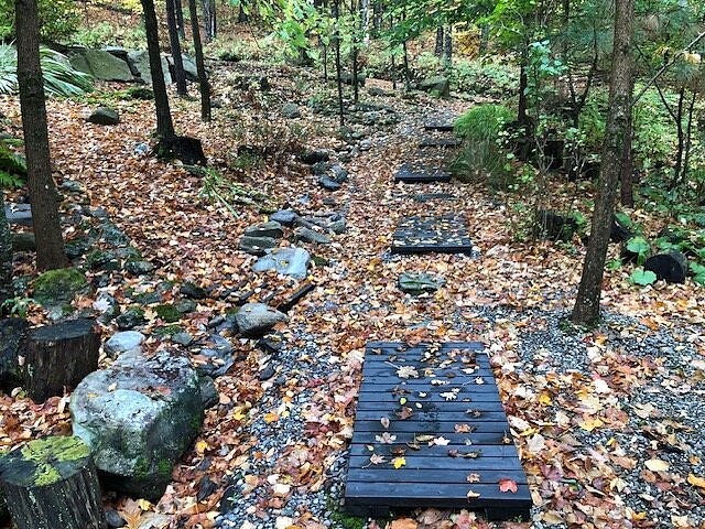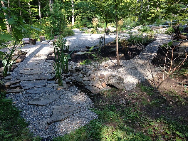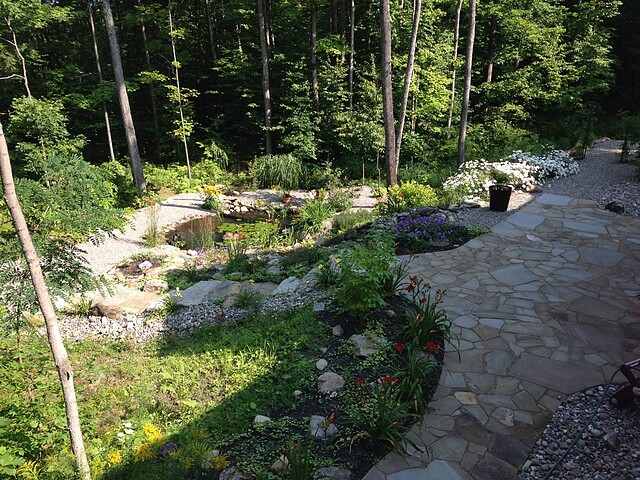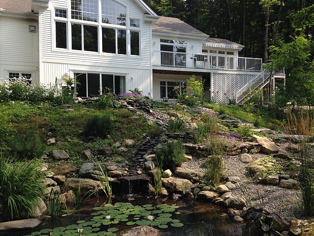 Le terrain de plus de 4 acres offre une végétation exceptionnelle, aménagée de type « jardin forestier », avec une terrasse de jardin étagée en pierres, un étang avec chute d'eau et des sentiers.
