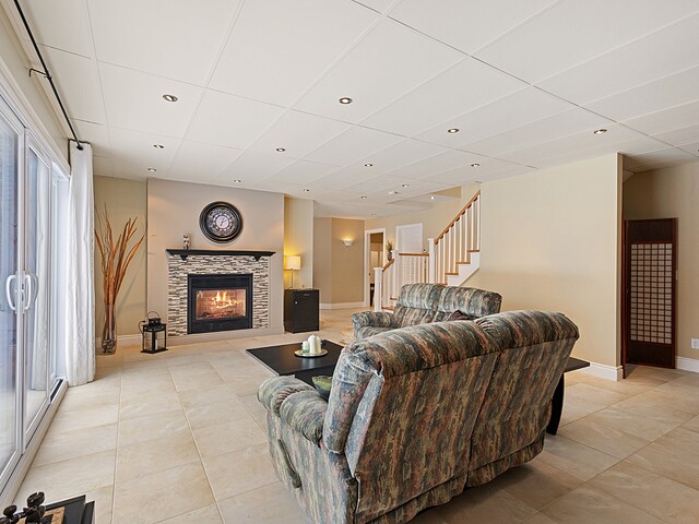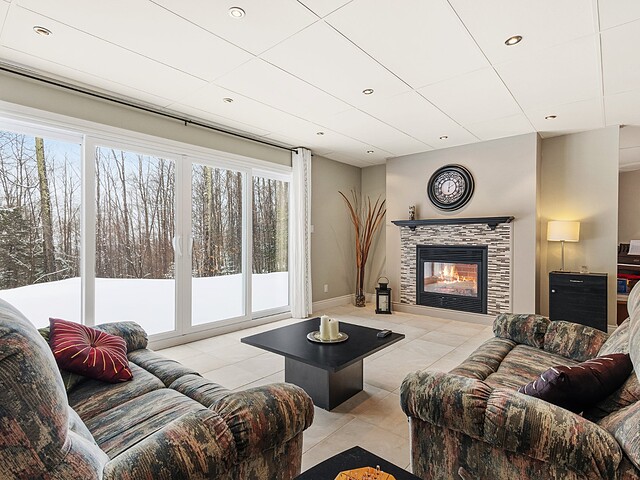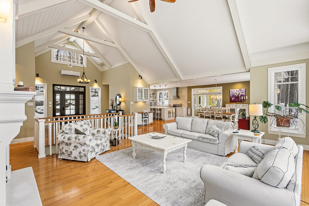 Le salon séduit par son ambiance chaleureuse, son foyer au gaz et ses plafonds atteignant 18 pieds de hauteur.