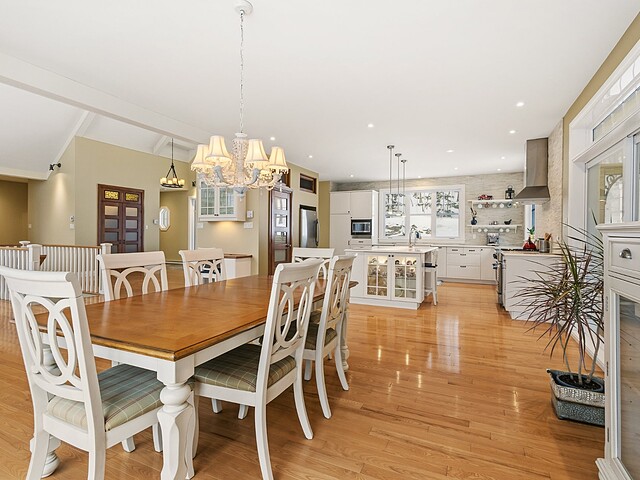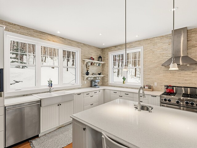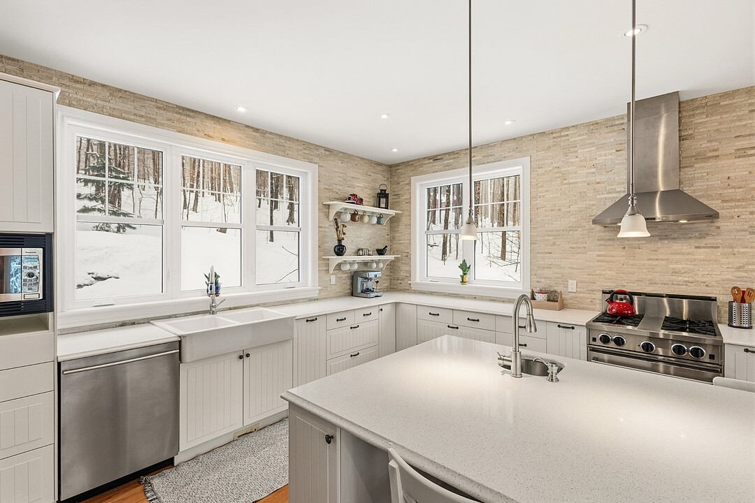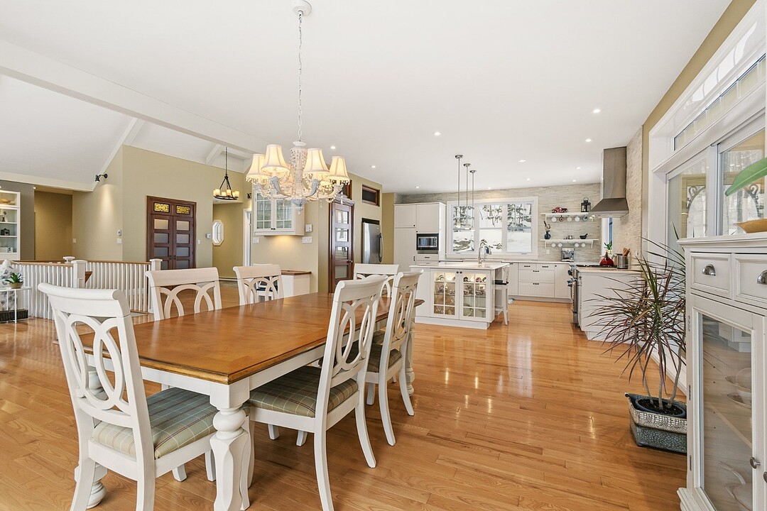 La cuisine, dotée d'un îlot en quartz et d'un grand garde-manger, s'ouvre sur la salle à manger et la véranda fermée. Des espaces parfaits pour se rassembler en famille ou entre amis.