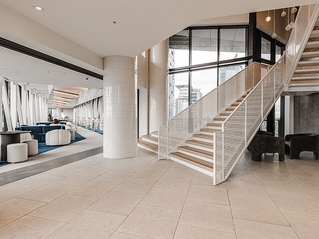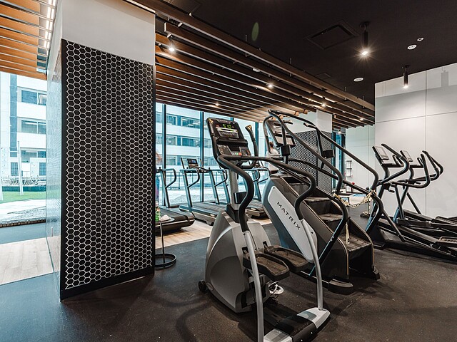 Maestria déploie plus de 40 000pc d'aires communes spectaculaires, conçues comme une extension naturelle de votre quotidien : piscines intérieure et sur le toit, spa complet (bain à remous, hammam, sauna), salle d'entraînement vitrée digne d'un hôtel, simulateur de golf, bibliothèque, studio de création, salle de cinéma, lounges et espaces de détente. La passerelle suspendue au 26e étage ajoute une signature unique au projet, avec une vue directe sur la Place des Festivals et l'animation du Quartier des spectacles.