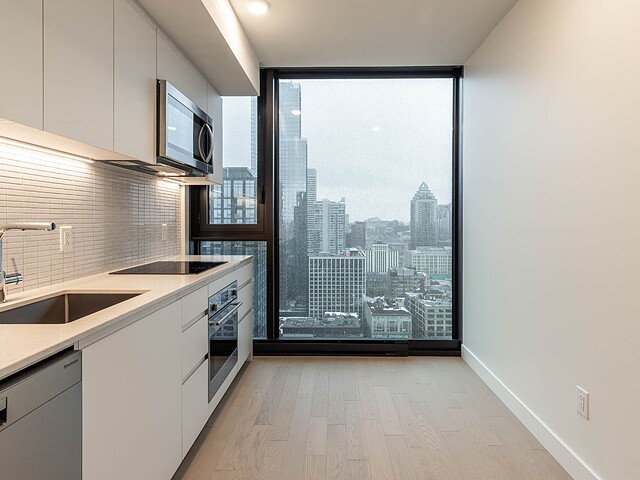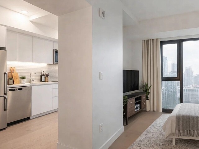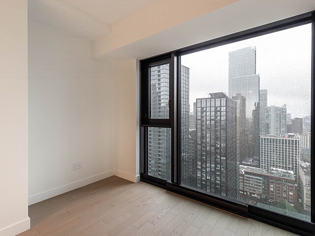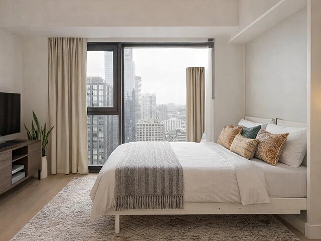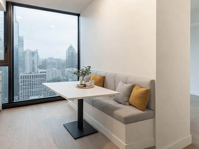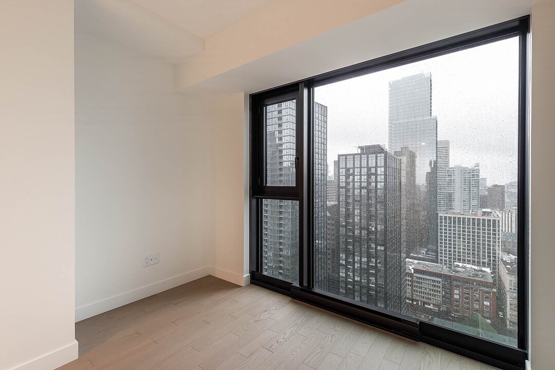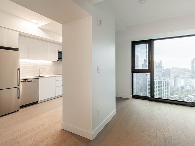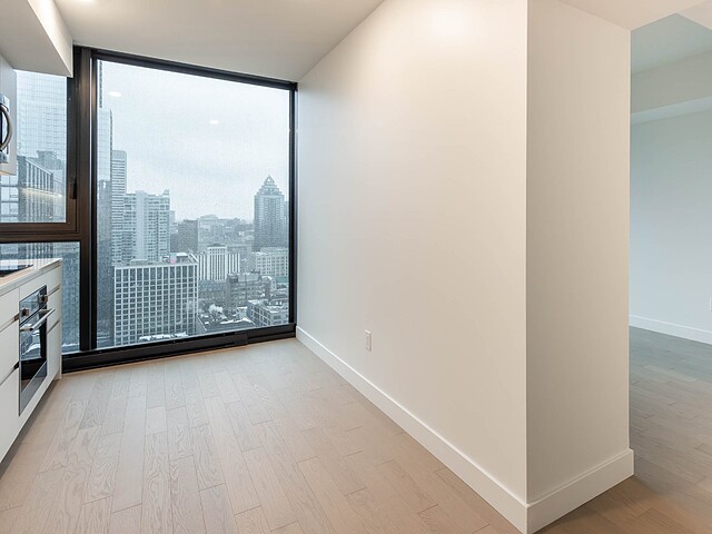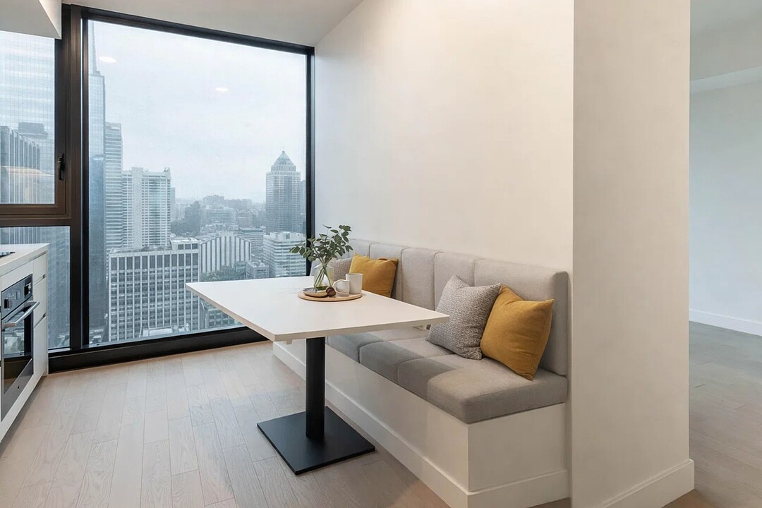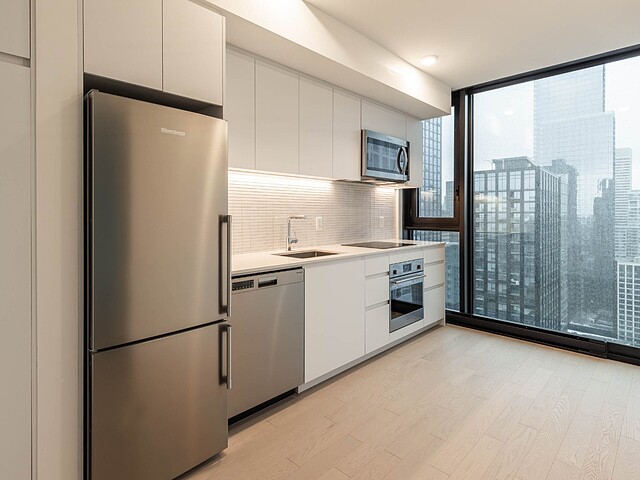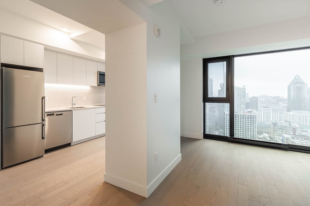 Situé au 33e étage, ce studio d'environ 421pc, orienté sud-ouest, profite d'une fenestration pleine hauteur offrant une lumière naturelle remarquable et une vue urbaine inspirante. L'espace a été optimisé pour maximiser le confort et la fonctionnalité : cuisine contemporaine, électroménagers encastrés, matériaux de qualité, rangements intégrés et une salle de bain aux finitions soignées. Un pied-à-terre idéal au centre-ville ou un investissement clé en main.