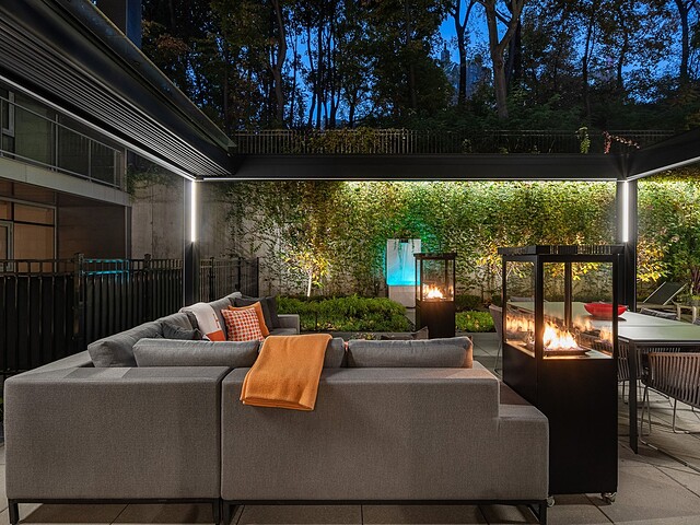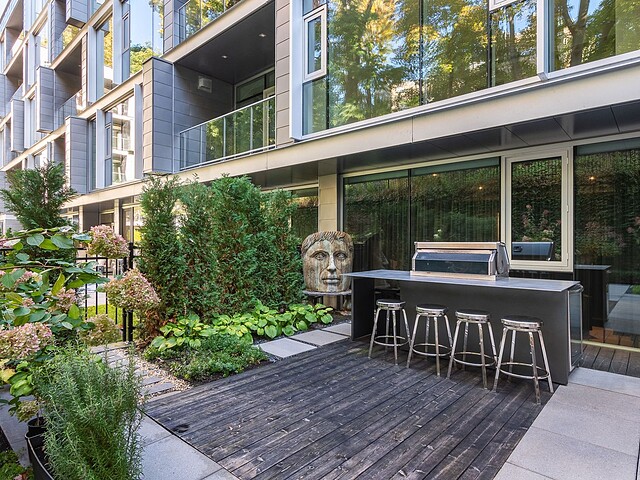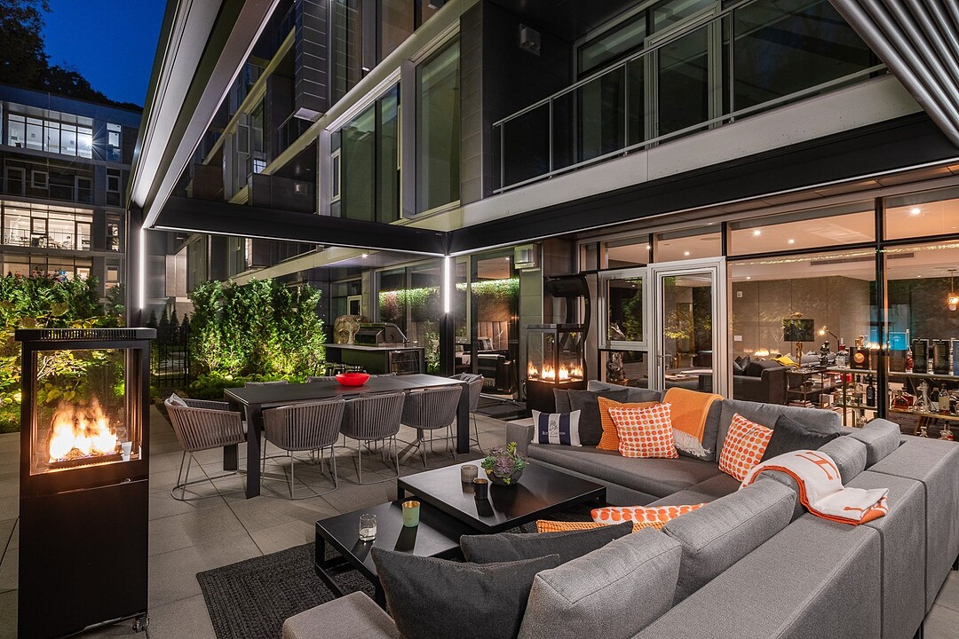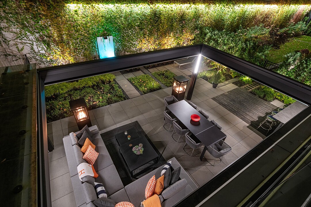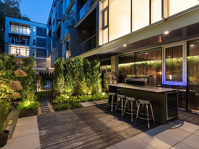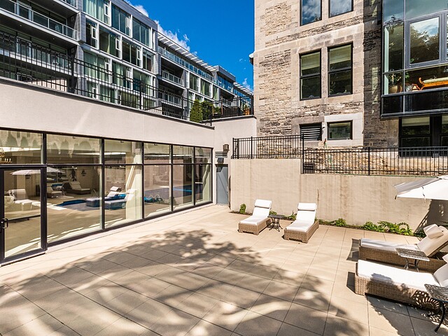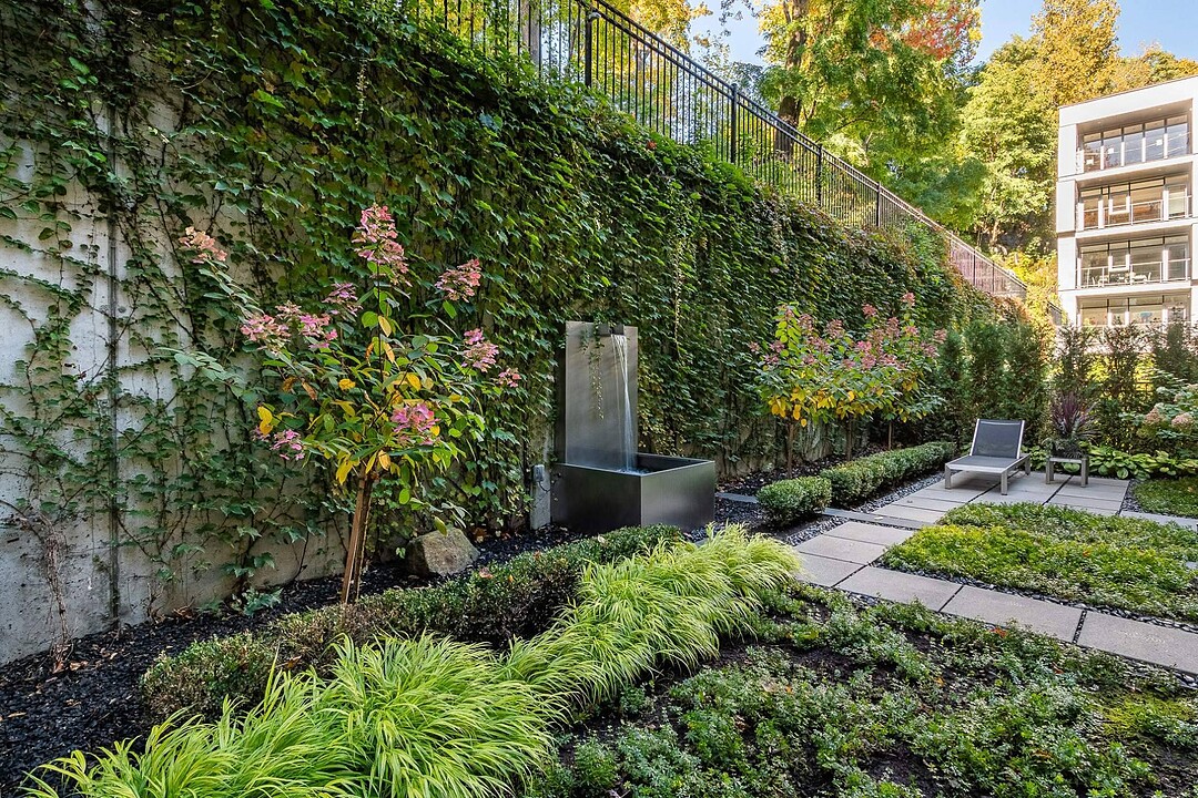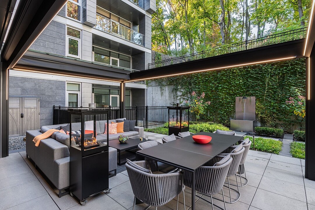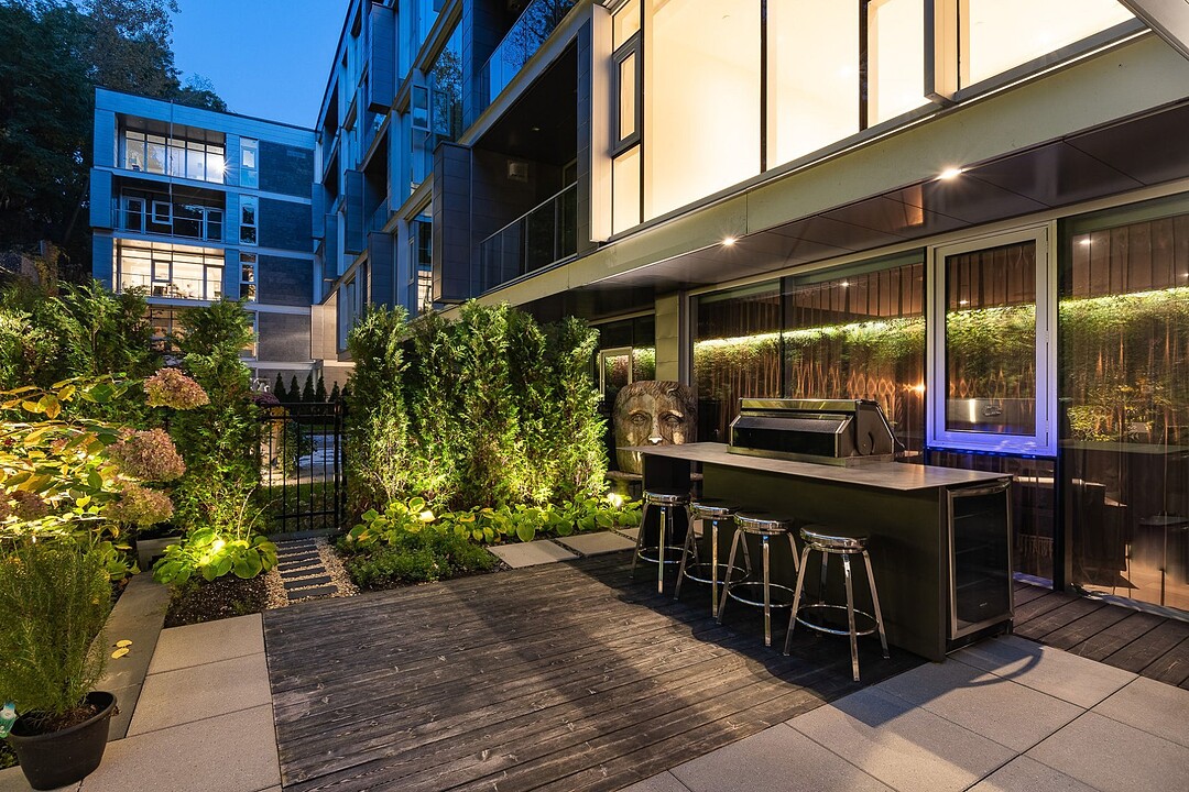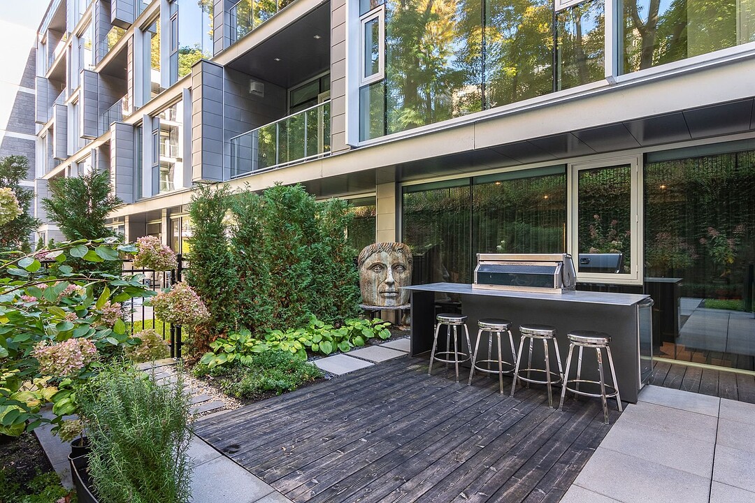 Au-delà des portes vitrées, la résidence se prolonge naturellement vers l'extérieur. La terrasse privée est un véritable sanctuaire urbain -- un salon et espace repas couverts, entourés de verdure, conçus pour savourer un café matinal, un souper d'été ou une soirée entre amis au coin du feu. Plus loin, la cour et les jardins méticuleusement aménagés de M sur la Montagne offrent l'expérience rare de vivre en pleine nature, tout en restant à quelques pas du centre-ville animé de Montréal.