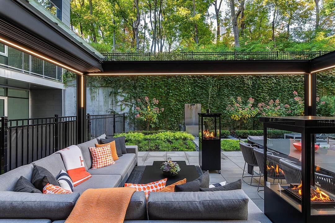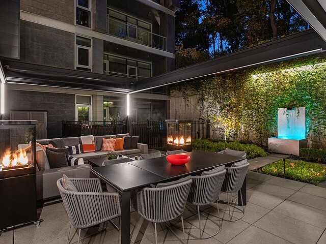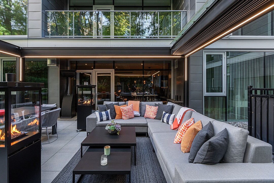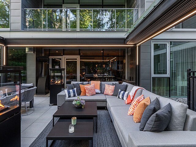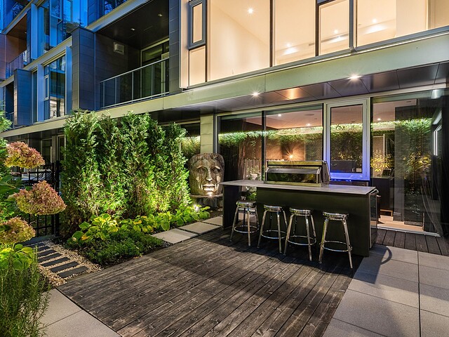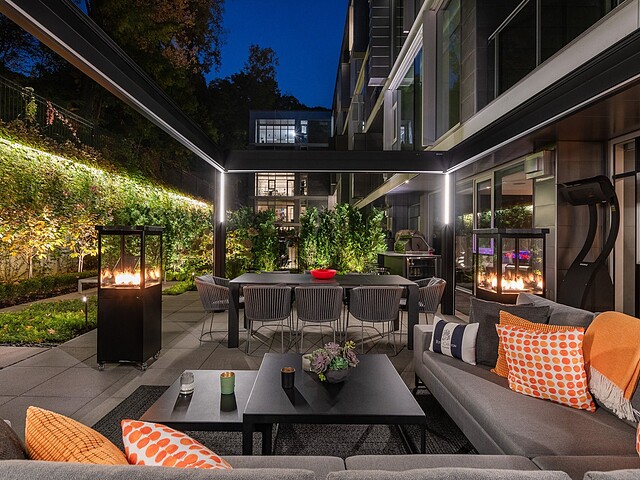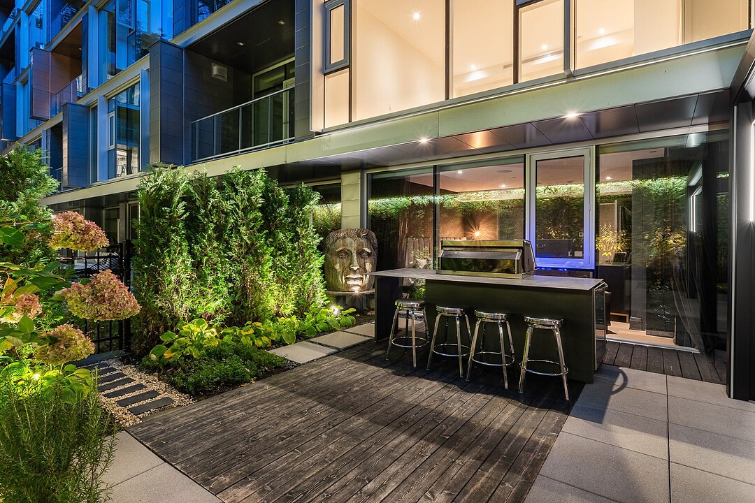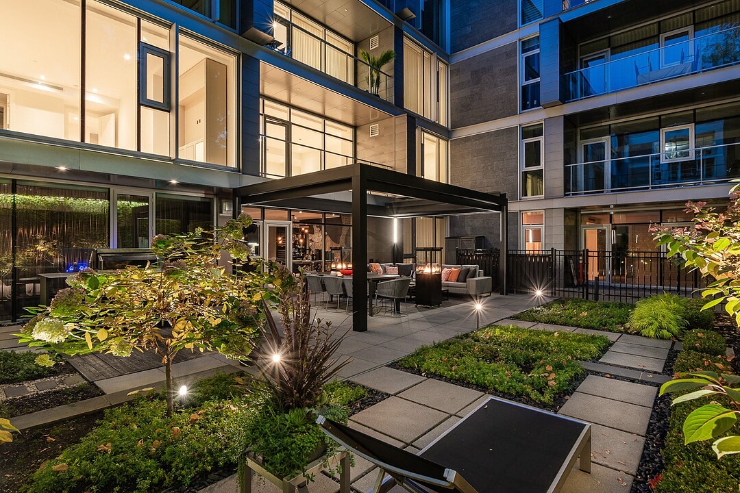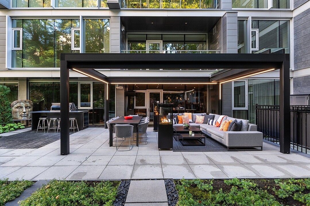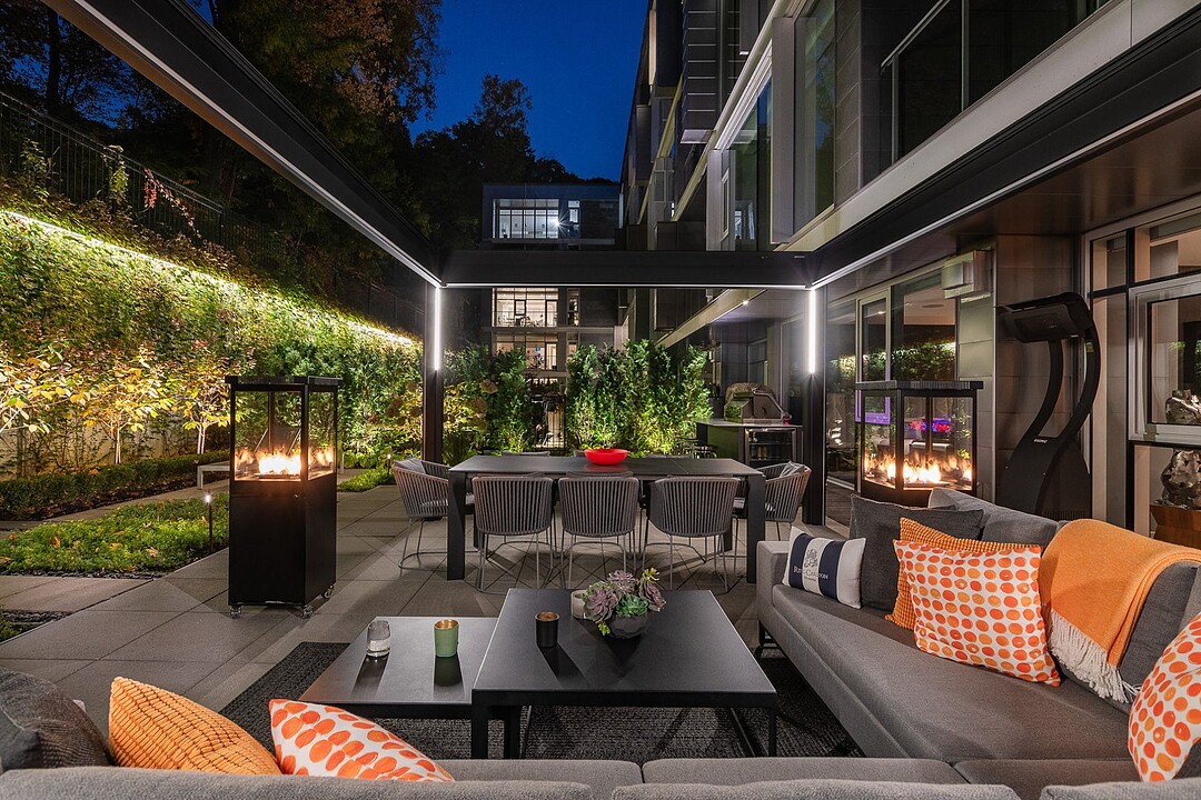 Au-delà des portes vitrées, la résidence se prolonge naturellement vers l'extérieur. La terrasse privée est un véritable sanctuaire urbain -- un salon et espace repas couverts, entourés de verdure, conçus pour savourer un café matinal, un souper d'été ou une soirée entre amis au coin du feu. Plus loin, la cour et les jardins méticuleusement aménagés de M sur la Montagne offrent l'expérience rare de vivre en pleine nature, tout en restant à quelques pas du centre-ville animé de Montréal.