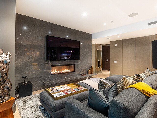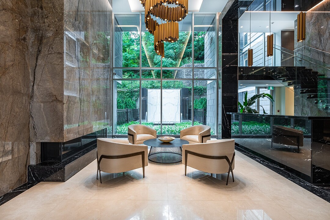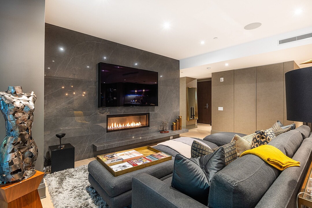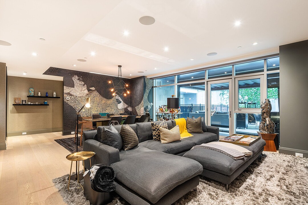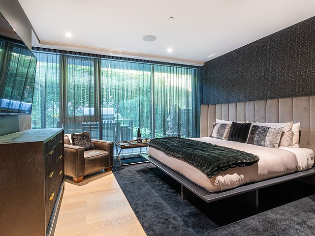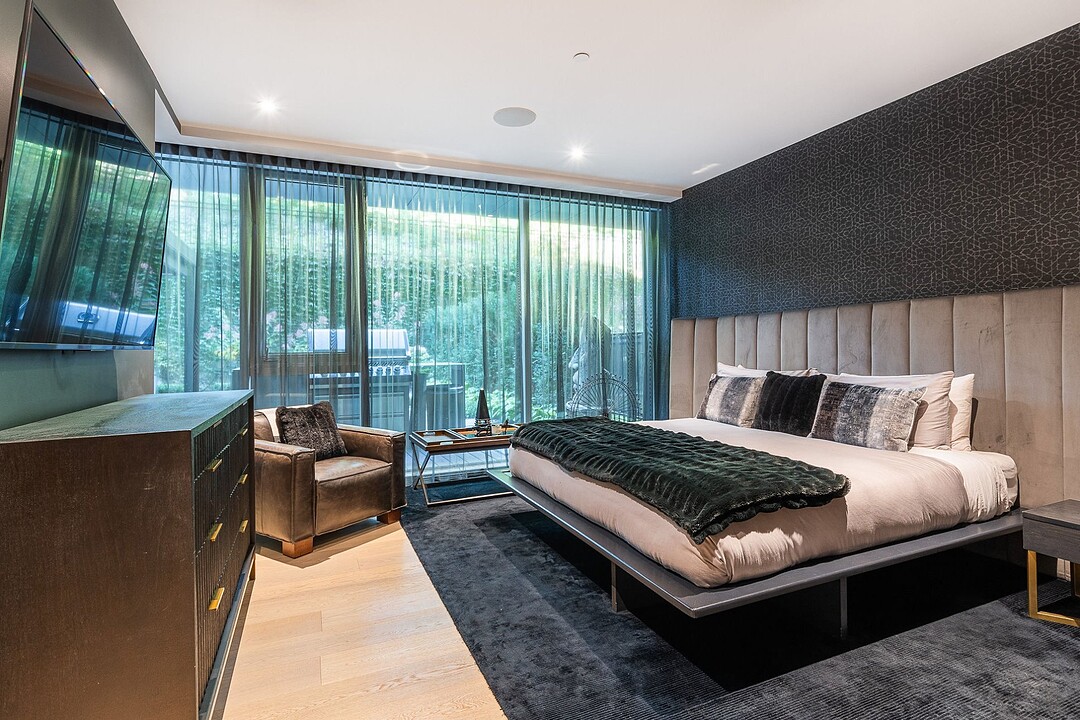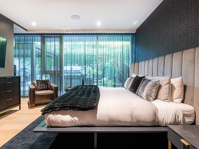 Dès l'entrée, une atmosphère d'élégance moderne vous enveloppe. L'aire de vie à aire ouverte se distingue par ses grandes fenêtres pleine hauteur offrant une vue apaisante sur les jardins privés. Un vaste sectionnel structure l'espace, invitant à la détente et à la convivialité, tandis que des finitions raffinées et des textures superposées créent une ambiance à la fois chaleureuse et sophistiquée. L'harmonie entre le bois naturel, les tissus somptueux et les accents métalliques reflète une attention méticuleuse portée aux détails.
