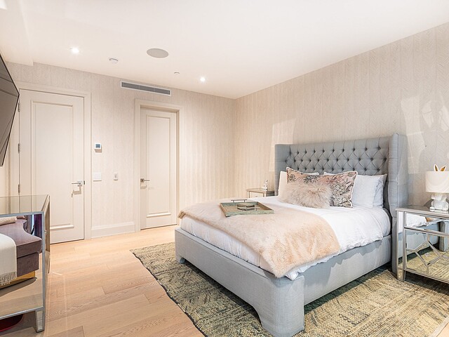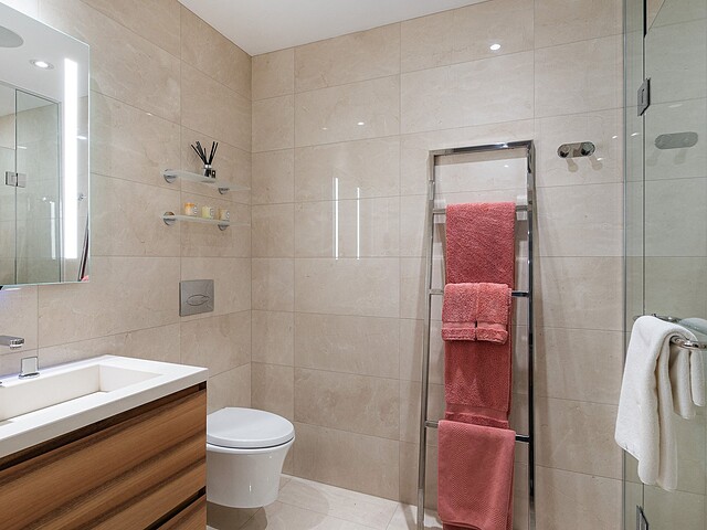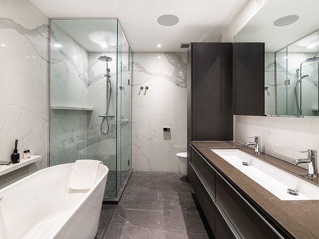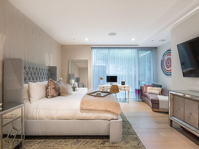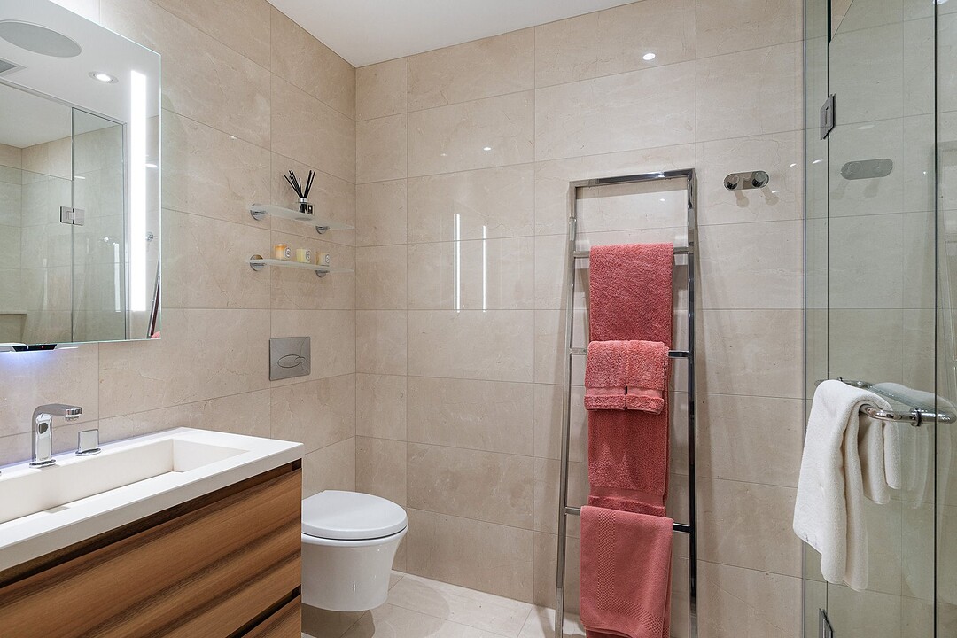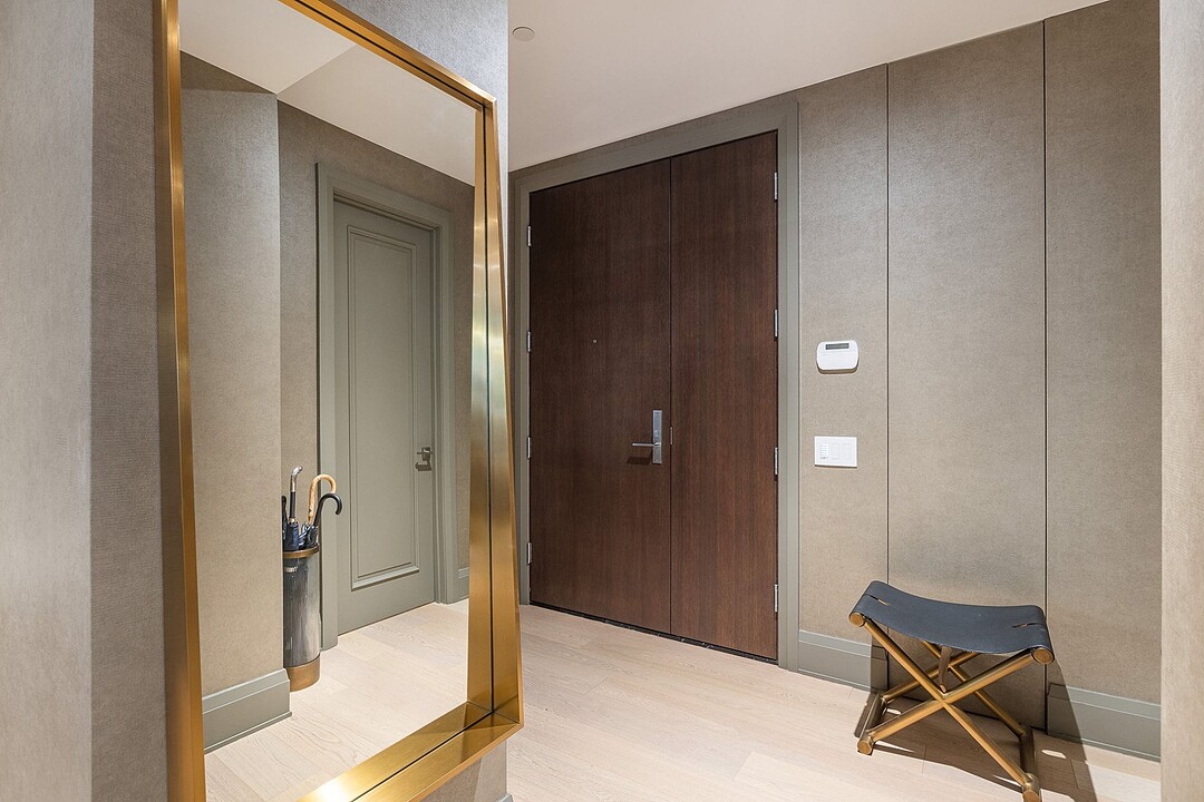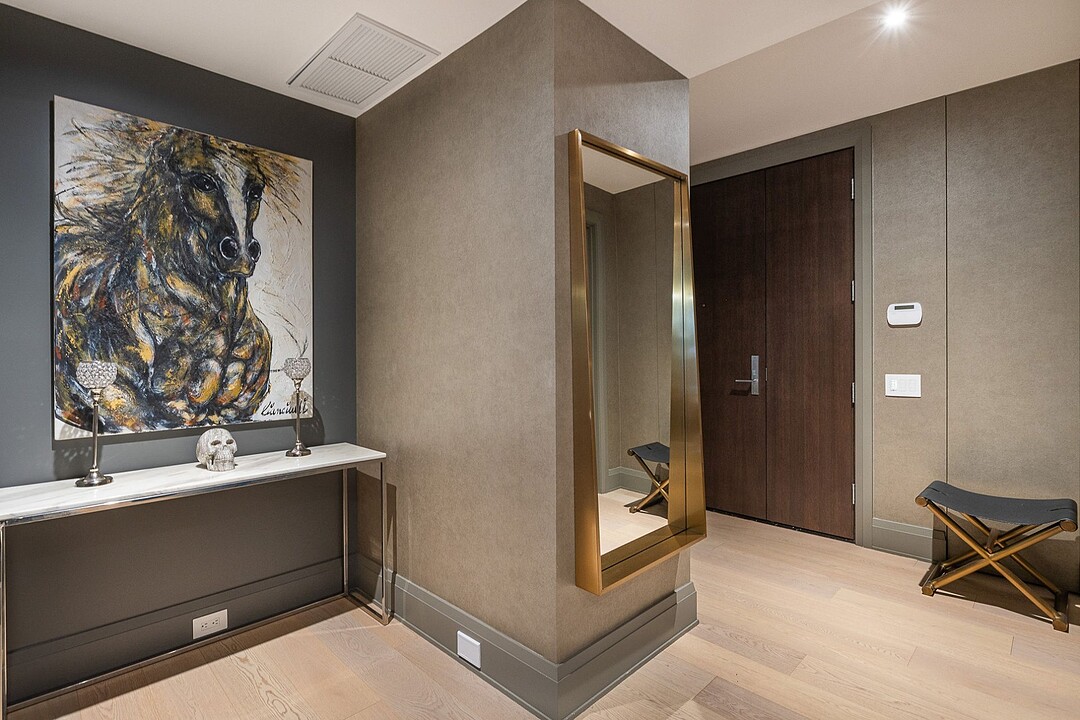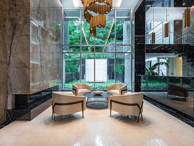 Dès l'entrée, une atmosphère d'élégance moderne vous enveloppe. L'aire de vie à aire ouverte se distingue par ses grandes fenêtres pleine hauteur offrant une vue apaisante sur les jardins privés. Un vaste sectionnel structure l'espace, invitant à la détente et à la convivialité, tandis que des finitions raffinées et des textures superposées créent une ambiance à la fois chaleureuse et sophistiquée. L'harmonie entre le bois naturel, les tissus somptueux et les accents métalliques reflète une attention méticuleuse portée aux détails.