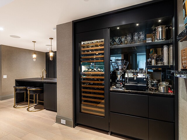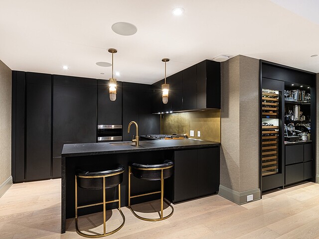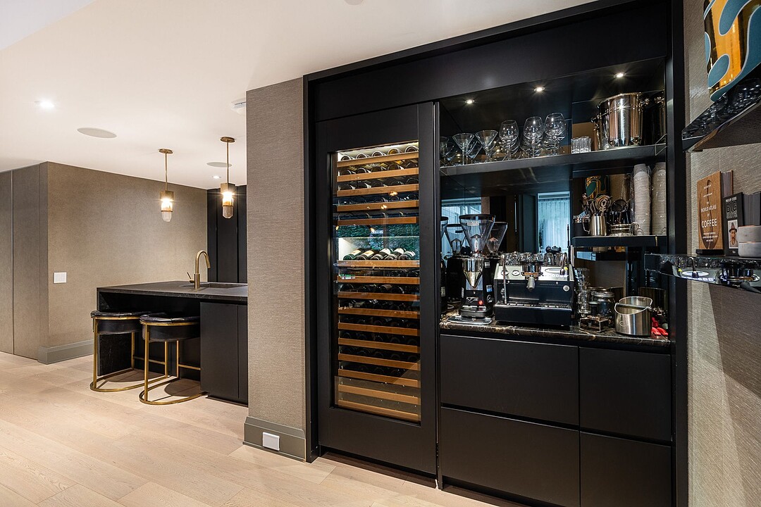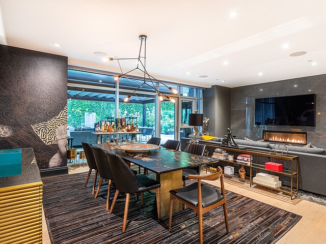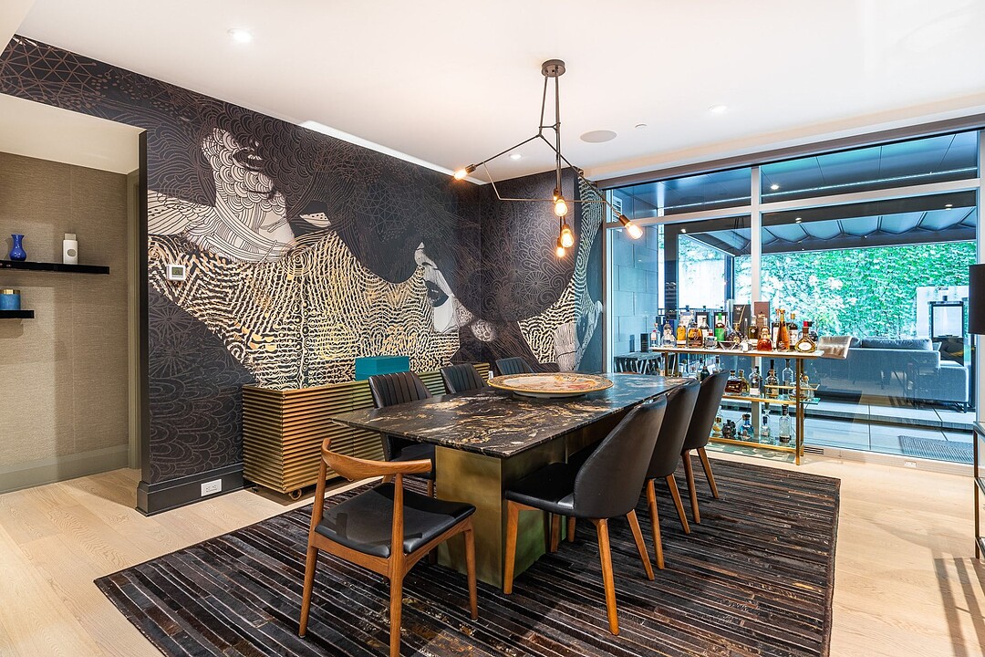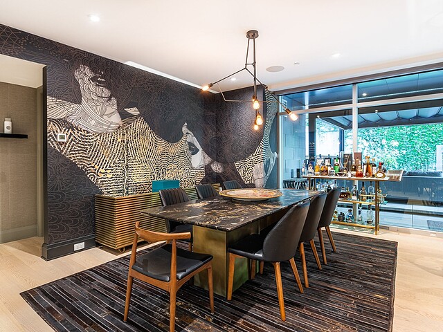 La salle à manger adjacente, à la fois artistique et intime, se distingue par son luminaire sculptural et sa table de pierre, véritable pièce maîtresse du décor. La cuisine, élégante et fonctionnelle, est dotée d'appareils intégrés, d'un mobilier sur mesure et d'un grand îlot idéal pour recevoir. Chaque élément a été pensé pour optimiser la fluidité et la fonctionnalité, faisant de cette demeure un espace exceptionnel tant pour le quotidien que pour les réceptions.